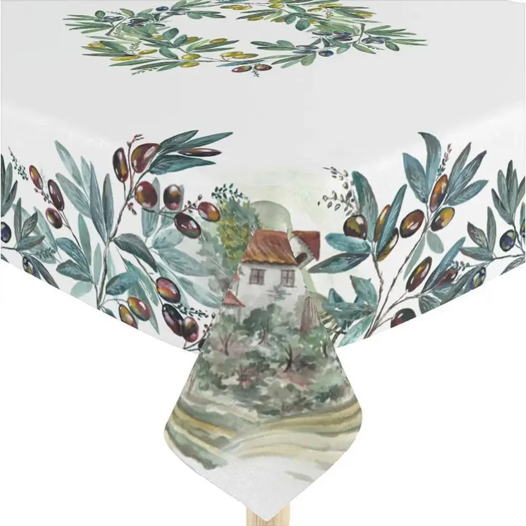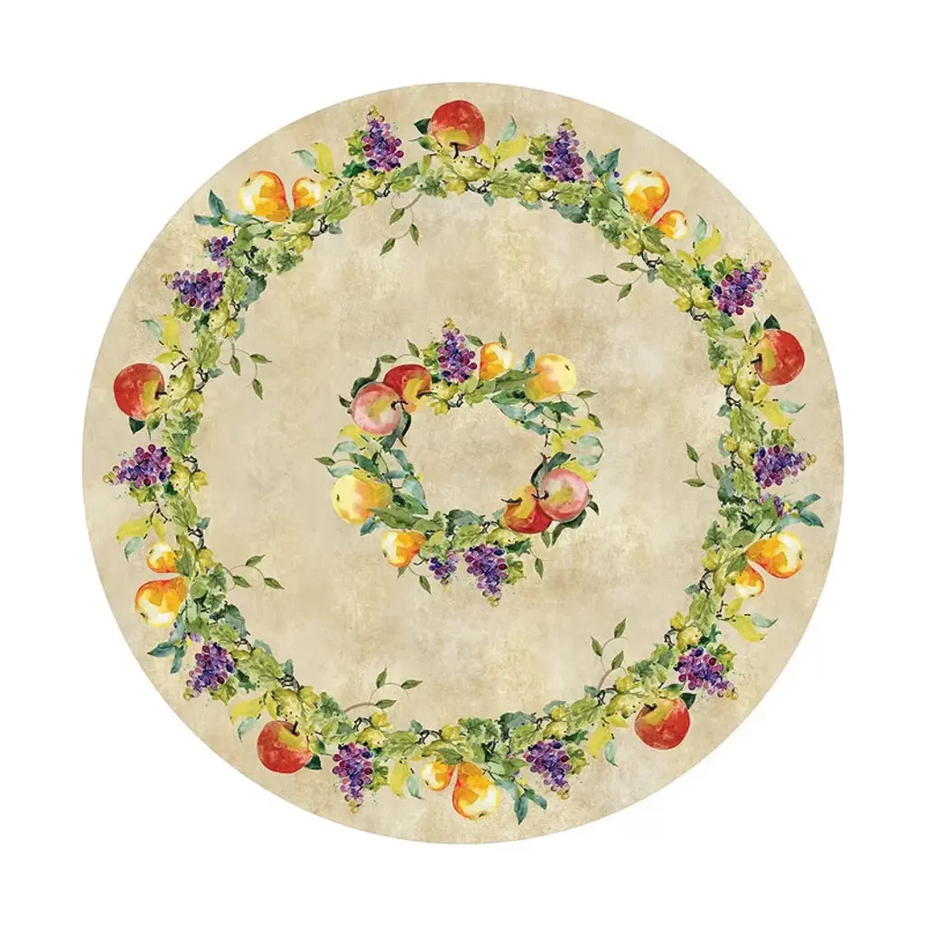 This fruit harvest themed tablecloth, "Palermo" creates an essence of Italy in any dining space. The design features a vine of vibrant watercolor apples, pears, and grapes against a tan, textured background. Add this beautiful, soft to the touch tablecloth to your dining area for a rustic and cultural look.