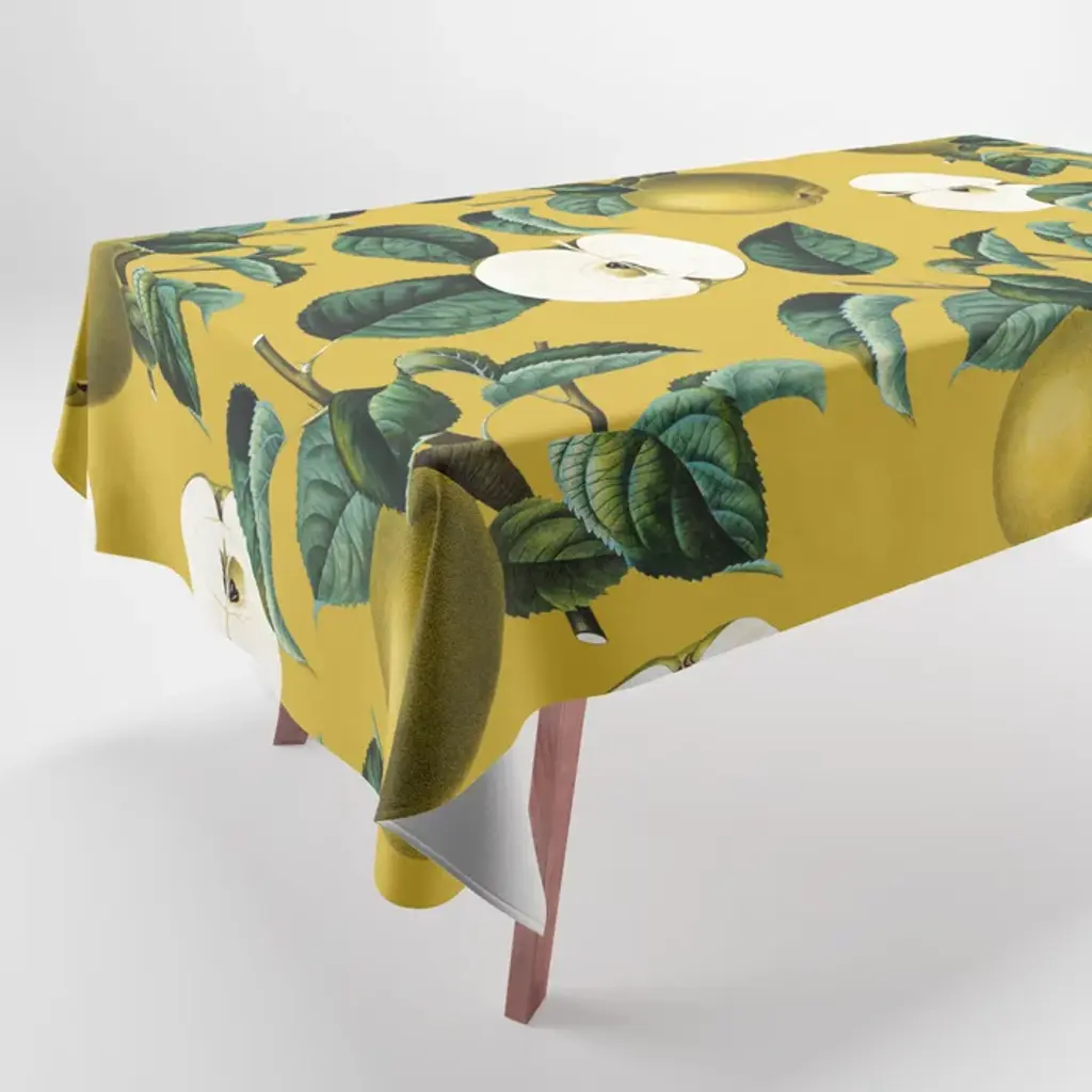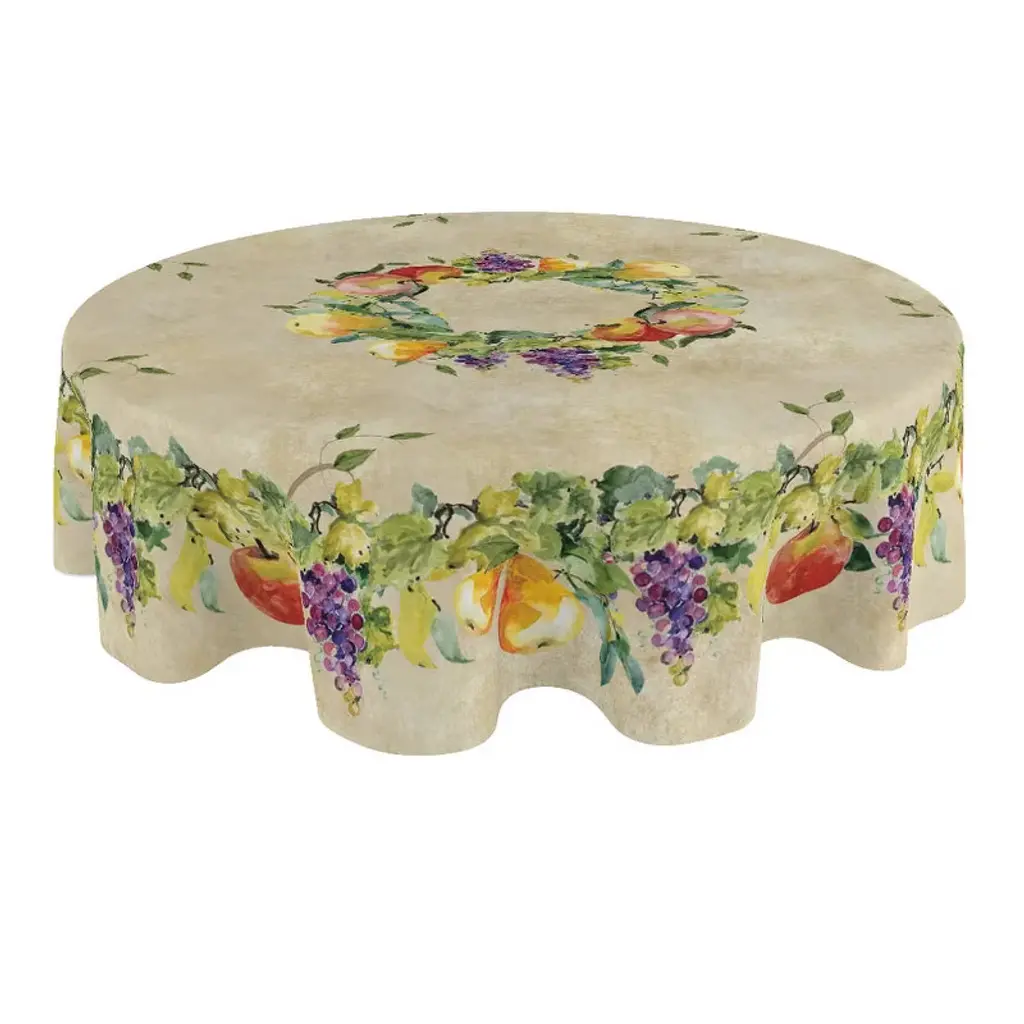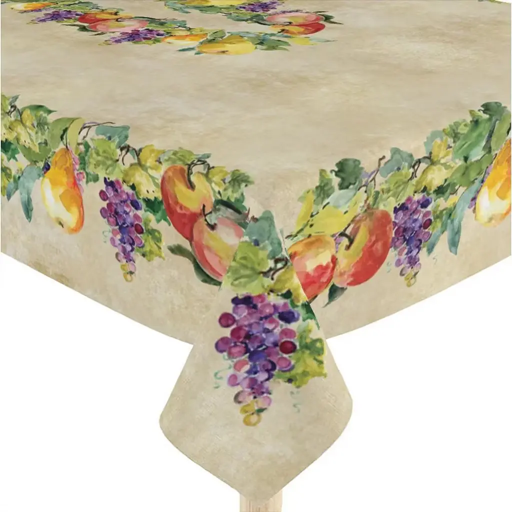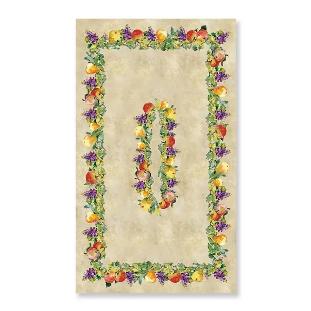 This fruit harvest themed tablecloth, "Palermo" creates an essence of Italy in any dining space. The design features a vine of vibrant watercolor apples, pears, and grapes against a tan, textured background. Add this beautiful, soft to the touch tablecloth to your dining area for a rustic and cultural look.