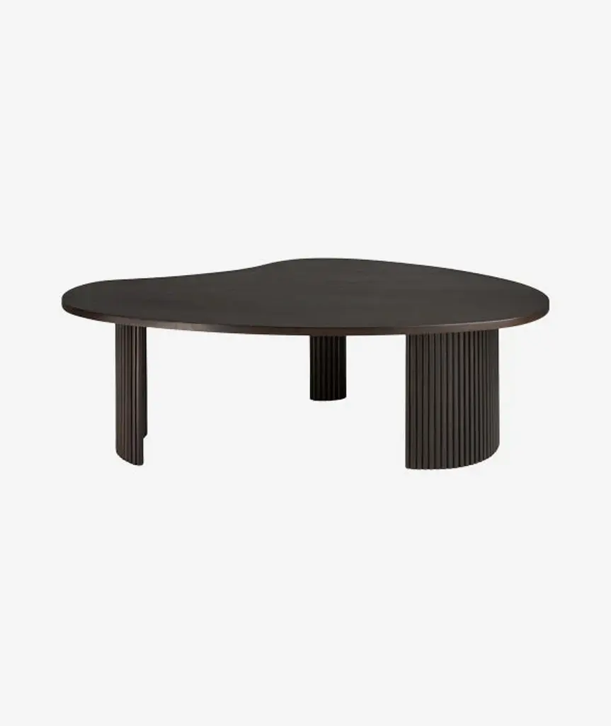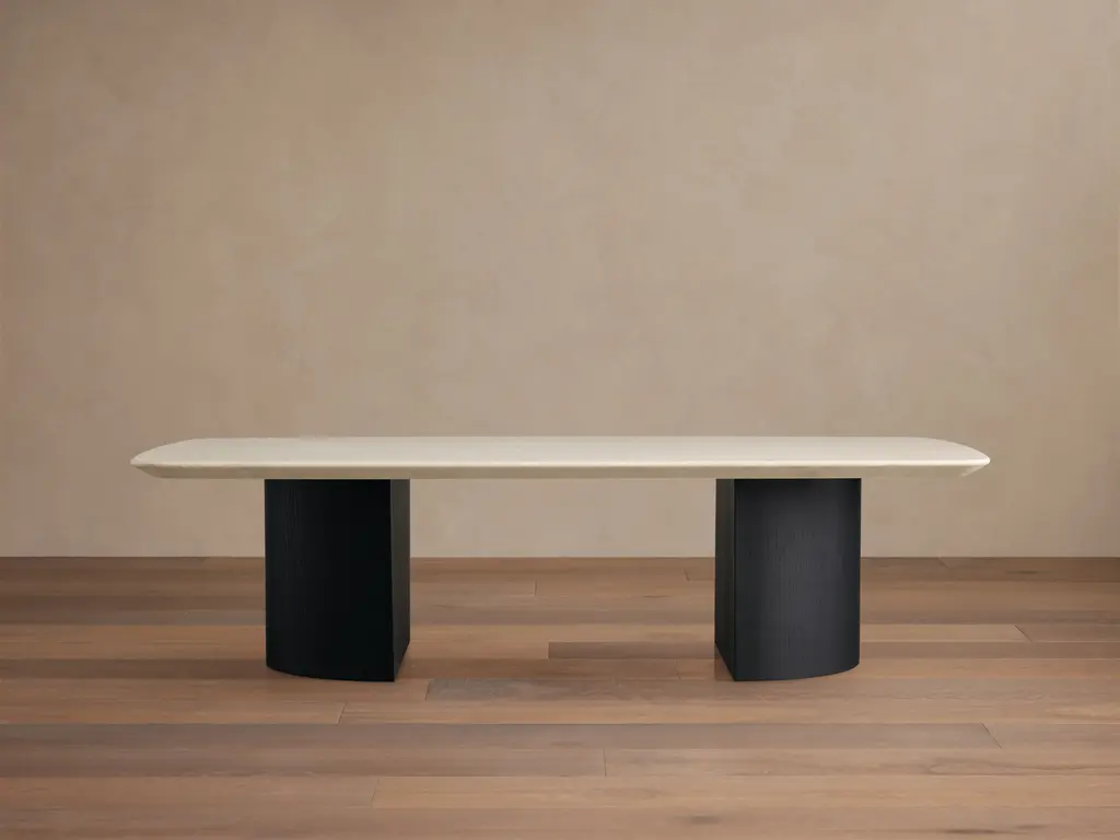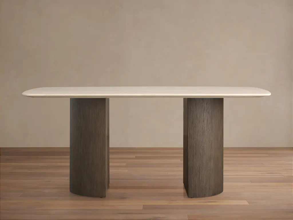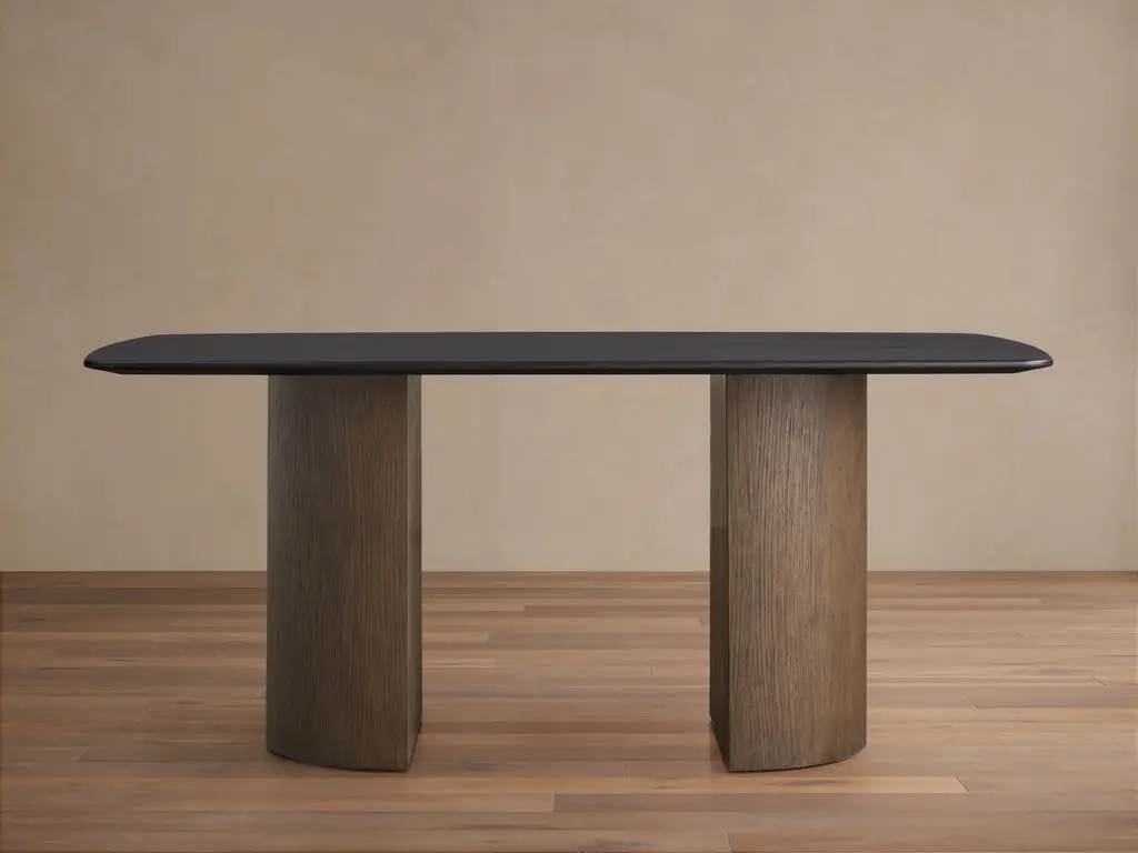 Crafted of mocha-finished oak and boasting a pair of fabulous fluted pedestals, the Laurel Oval Dining Table is an organic statement piece. This item is made of solid wood. Item will not be exactly as pictured, subtle deviations in hue after finishing can be expected as a result of natural variations in coloration of the base material.