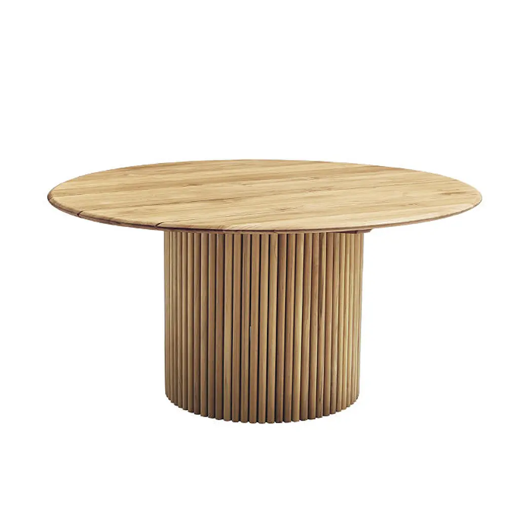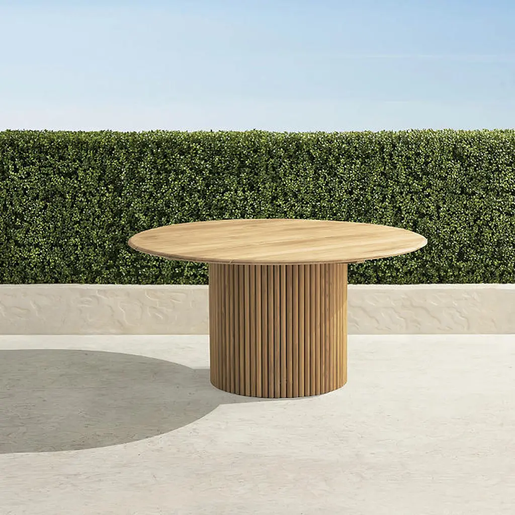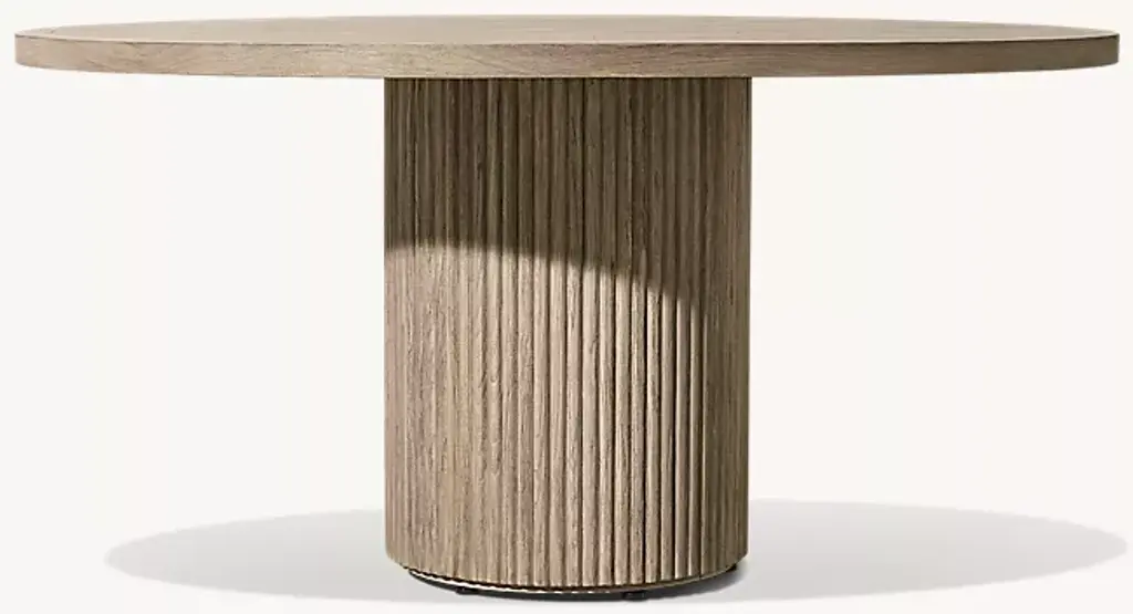 Crafted of saddle-finished oak and boasting a fabulous fluted base, the boldly sized Laurel Round Dining Table is an organic statement piece. This item is made of solid wood. Item will not be exactly as pictured, subtle deviations in hue after finishing can be expected as a result of natural variations in coloration of the base material.