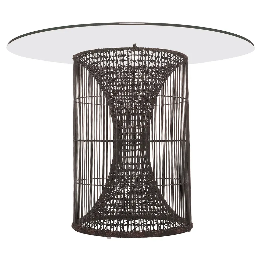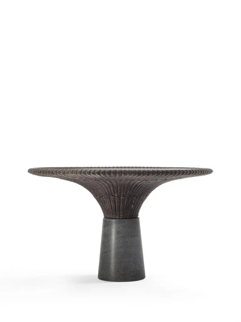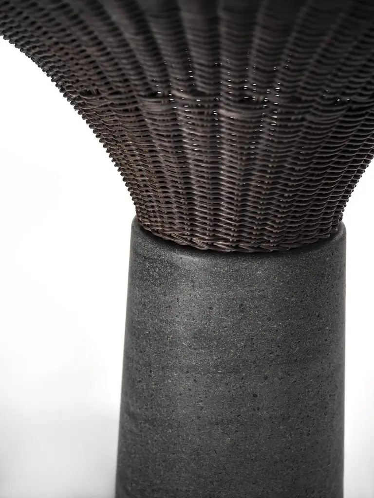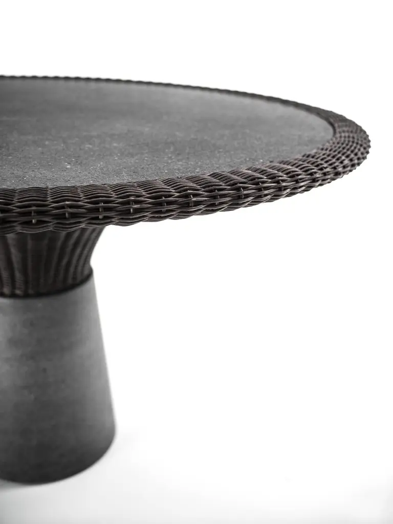 Lava stone "Amazonas" dining table - Giorgio Bonaguro.Dimensions: 74 height x 120 diameter.Materials: Brushed lava stone, Natural wicker.The "Amazonas" collection designed by Giorgio Bonaguro represents the debut of Morfosi in the Outdoor area. Characterized by the use of marble combined with wicker, it is inspired by the luxuriant and exuberant nature of Brazil. As the vegetation of rainforest flows and spreads from the earth to the light, so the wicker is born from the marble and creates sinuous and elegant shapes that incorporate and support the stone. Two natural materials that are not simply combined, but intertwine to create new furnishing elements.The collection is characterized by: dining tables, coffee tables, side tables, lamps.Giorgio Bonaguro studied mechanical engineering in Modena and then graduated at Scuola Politecnica di Design in Milan, in the double Master of Industrial and Interior Design. He has worked in several design studios in Milan, first at Lorenzo Palmeri's, then with Francesco Faccin, at Michele De Lucchi's Studio, and then with the designer and critic MarCo Romanelli. He collaborates with several companies and develops limited editions presented at some international fairs such as Salone del Mobile, Design Miami, London Design Festival, Maison et Objet, Design Days Dubay, ecc. He works between Italy and Brazil in the field of product design, interior design, exhibition and lighting, trying to combine a linear style with research and contamination between materials.