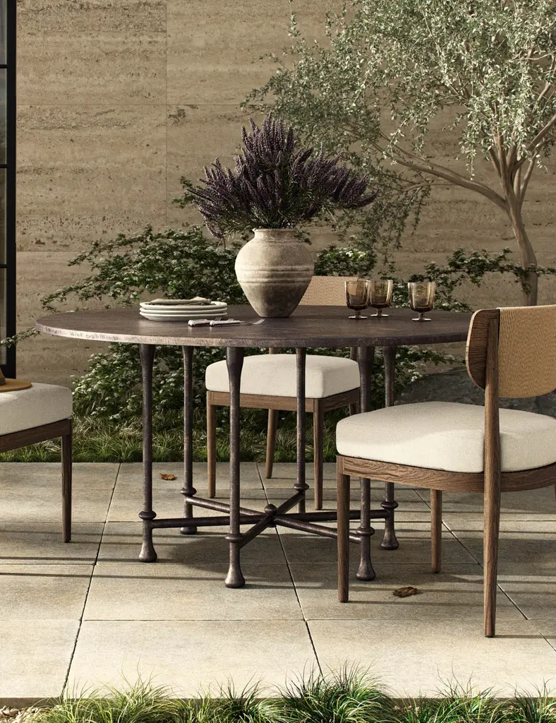 Four Hands brings their exceptional craftsmanship to a timeless collection rooted in Amber Lewis' perennial California style. This cast aluminum dining table cuts a traditional silhouette with six legs featuring turned detailing. We love this round table for anchoring an al fresco space where rustic touches meet refined design.