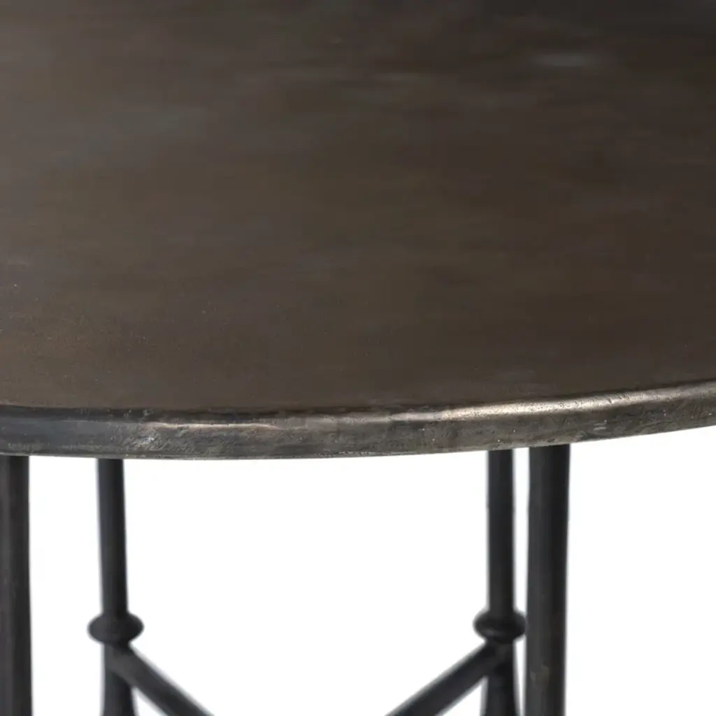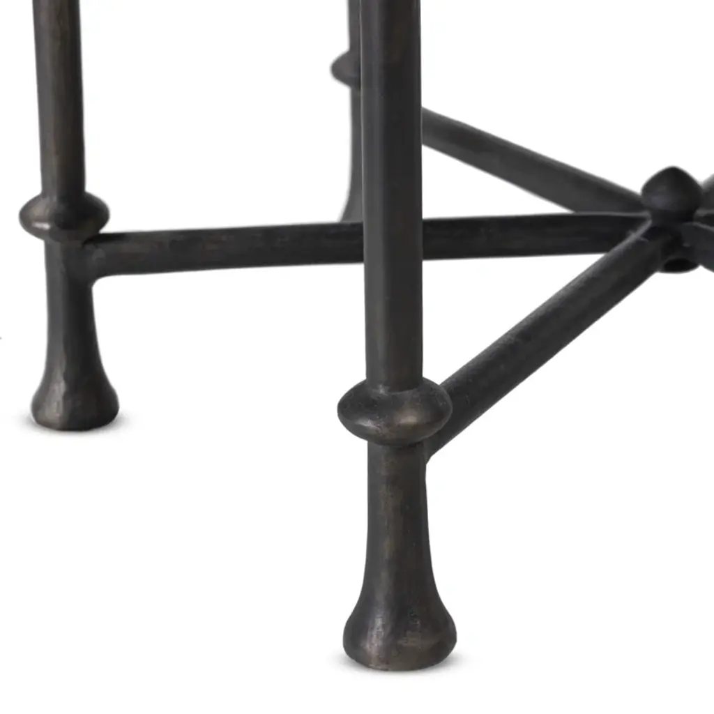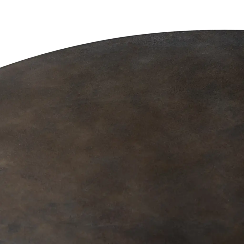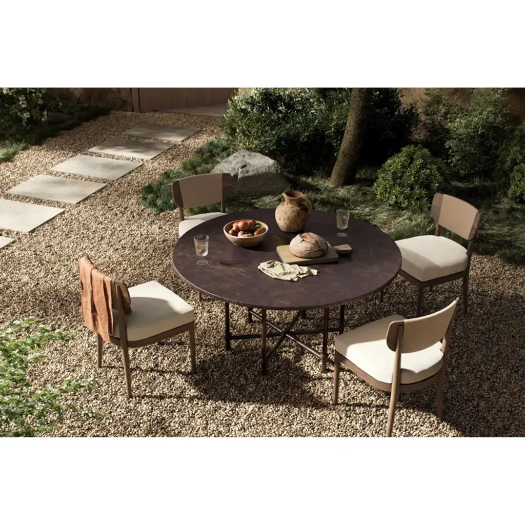 A design collaboration by Amber Lewis and Four Hands. Cast aluminum shapes this statement outdoor dining table. Each of the six legs features turned detailing, finished in a distressed bronze that highlights the subtle movement of the material.