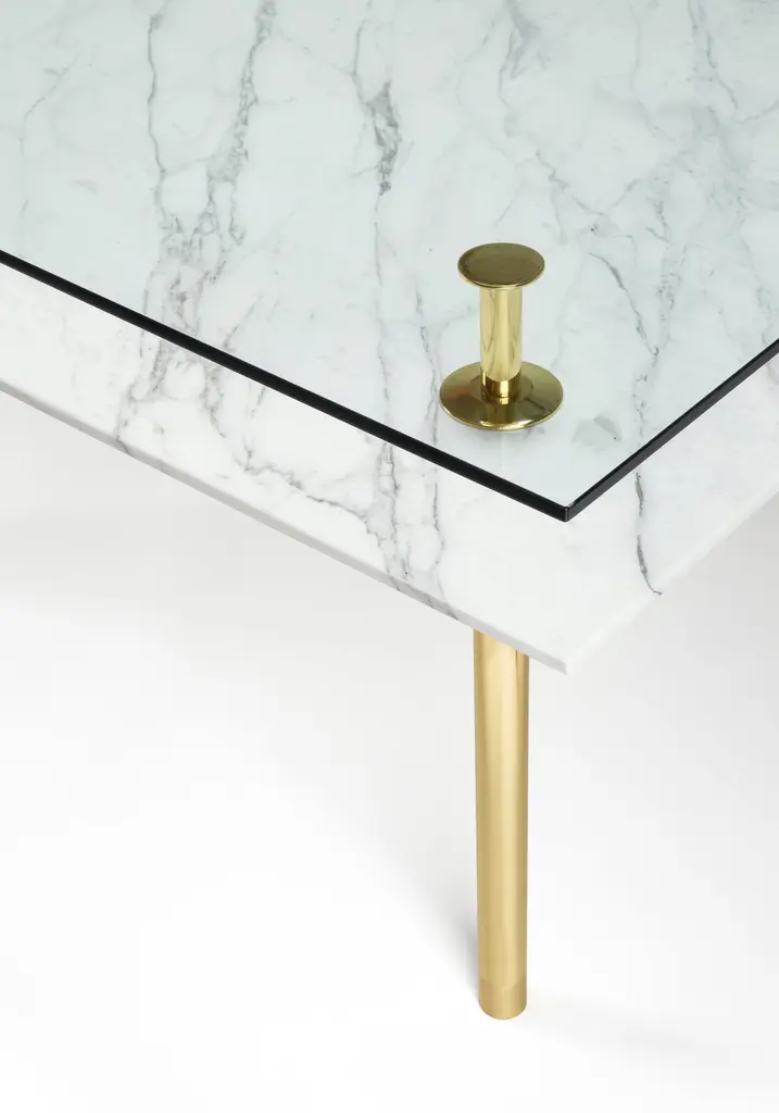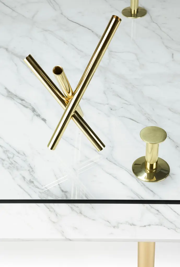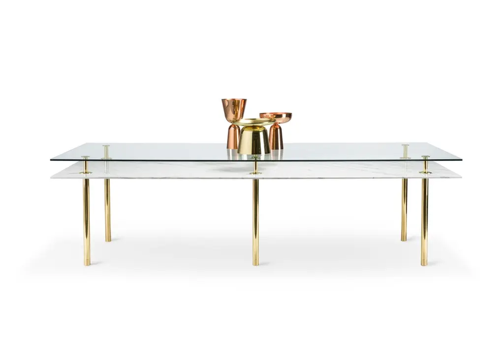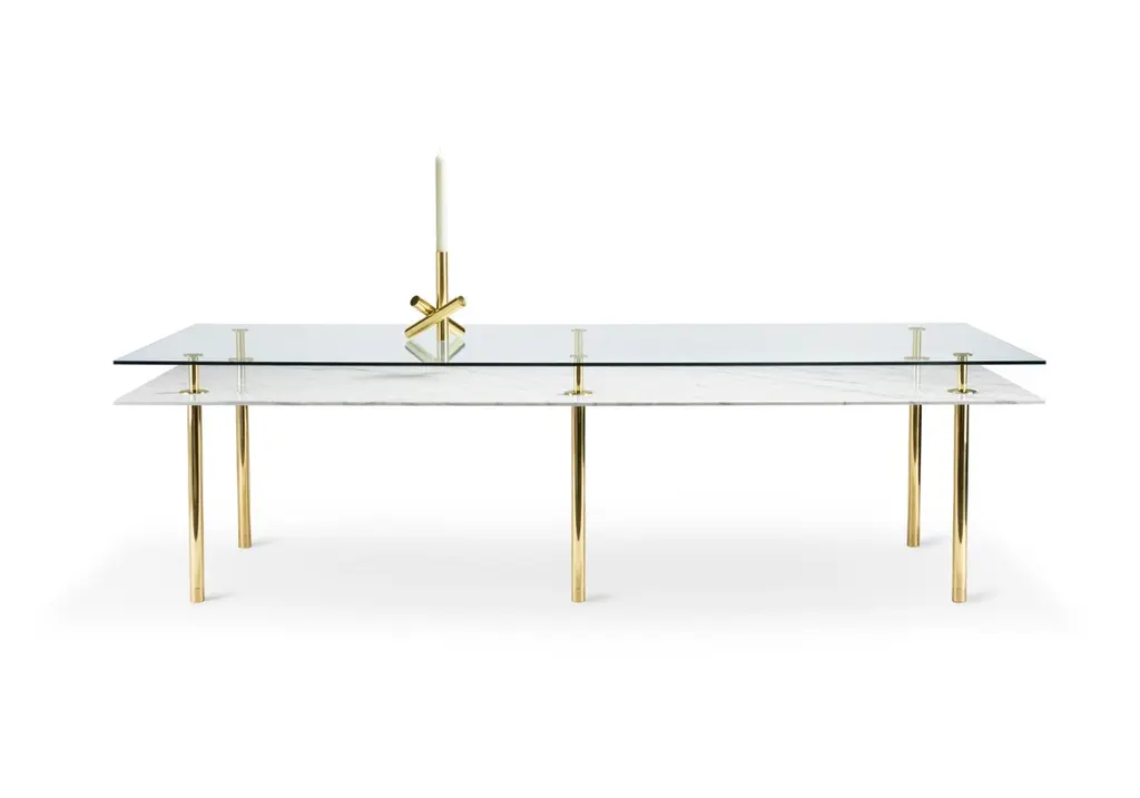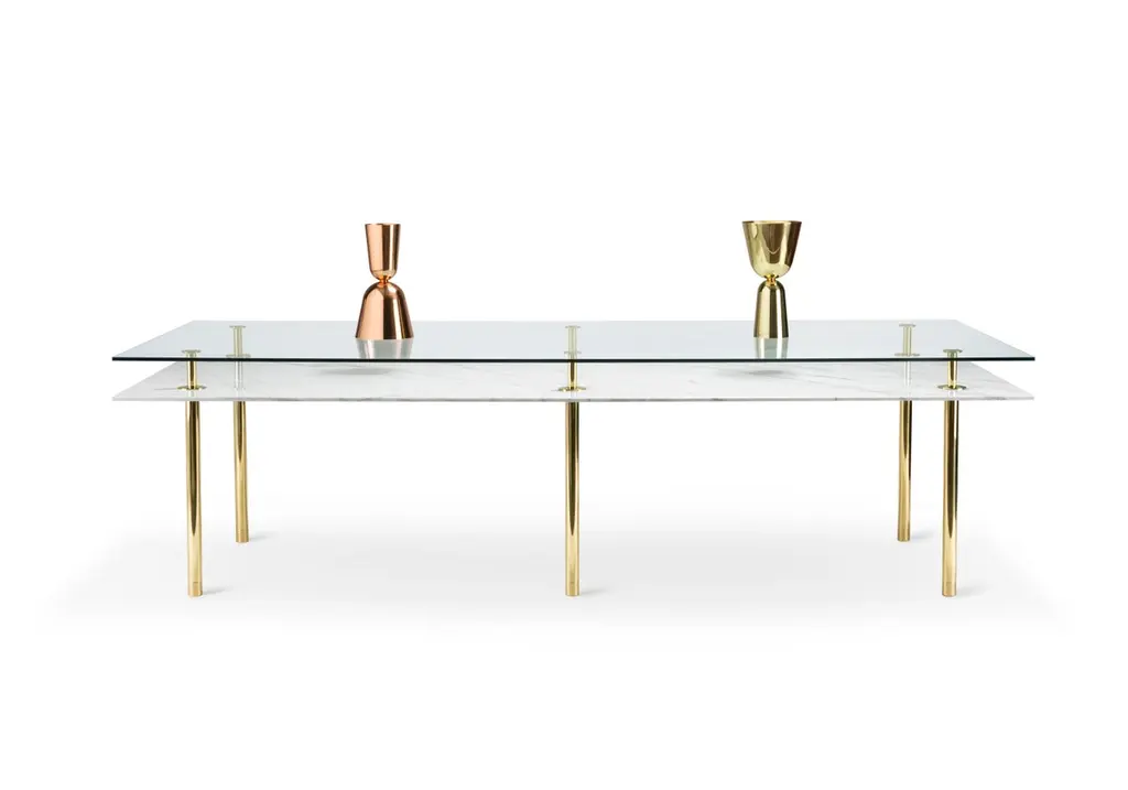 Table in crystal and brass. The designer imagines a turning point in the use of such a precious finishes such as polished brass: from the idea of almost a unique object in its perfect craftsmanship, to the system to be built starting from the base. A column made of brass whose different diameters define base and capital, just as the columns of classic architecture.The column multiplies to infinity, is interrupted and then resumed to hold glass tops, wood or marble and configure even angular shelves, tables, small tables, displays and consoles. A landscape of almost infinite possibilities that designers and end users can chose from to organize the space both in domestic and contract situations, maintaining aesthetic uniformity in the name of a more refined elegance.Structure: Solid brass legs lacquered diameter 35mm.Top finishes: 12mm glass, 20mm marble.Additional Information:Material: Brass, calacatta gold marbleFinish: Polished brassTop: Calacatta gold marbleDimensions: W 280 x D 120 x H 78 cmAvailable in other shape options: RoundAvailable in other size options: Medium and SmallAvailable in other wood top finish option: Striped oak, canaletto walnut, bolivar, new lime, caleido, mahoganyAvailable in other marble top options: Carrara white, emperador dark, sahara noir, eramosa brownAvailable in other finish options: Satin brass, light burnished brass, brown burnished brass, dark burnished brass, black gold