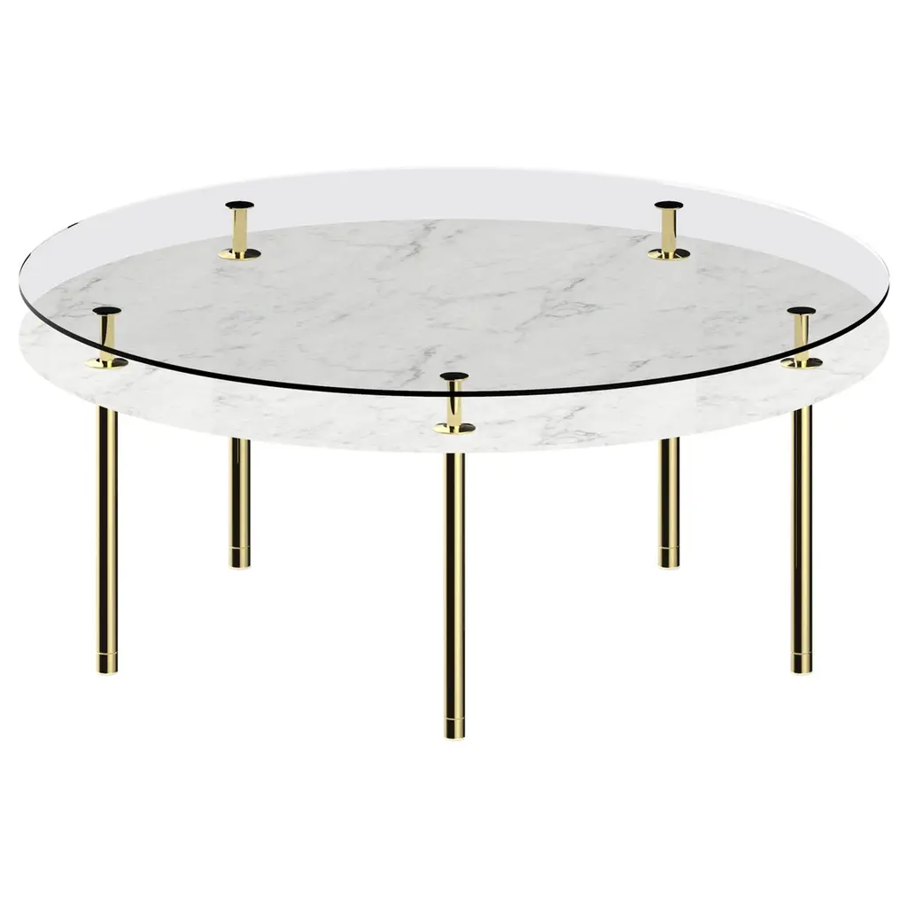 Table in crystal and brass. The designer imagines a turning point in the use of such a precious finishes such as polished brass: from the idea of almost a unique object in its perfect craftsmanship, to the system to be built starting from the base. A column made of brass whose different diameters define base and capital, just as the columns of classic architecture.The column multiplies to infinity, is interrupted and then resumed to hold glass tops, wood or marble and configure even angular shelves, tables, small tables, displays and consoles. A landscape of almost infinite possibilities that designers and end users can chose from to organize the space both in domestic and contract situations, maintaining aesthetic uniformity in the name of a more refined elegance.Structure: Solid brass legs lacquered diameter 35mm.Top finishes: 12mm glass, 20mm marble.Additional Information:Material: Brass, calacatta gold marbleFinish: Polished brassTop: Calacatta gold marbleDimensions: Ø 160 x 78 H cmAvailable in other size options: LargeAvailable in other shape options: RectangularAvailable in other wood top finish option: Striped oak, canaletto walnut, bolivar, new lime, caleido, mahoganyAvailable in other marble top options: Carrara white, emperador dark, sahara noir, eramosa brownAvailable in other finish options: Satin brass, light burnished brass, brown burnished brass, dark burnished brass, black gold