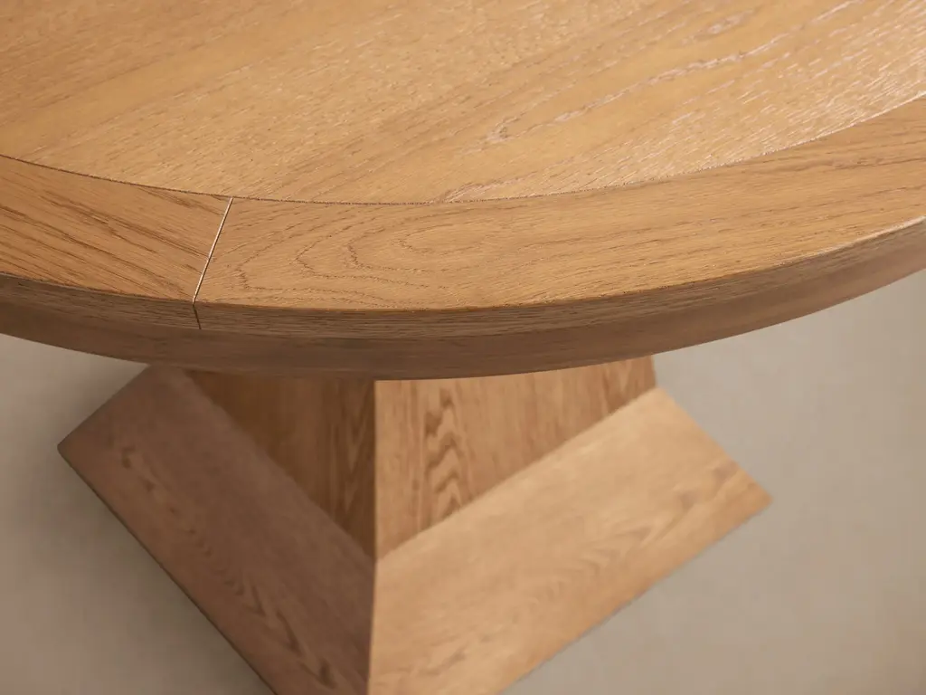 Handcrafted with a transitional pedestal design, our Leighton Dining Collection is finished and distressed by hand, highlighting the natural graining of the wood. Using the included extension leaves, Leighton’s exclusive rack-and-pinion extension gear system allows the table’s surface to expand so more people can comfortably gather around to share food, spirits, and conversation.