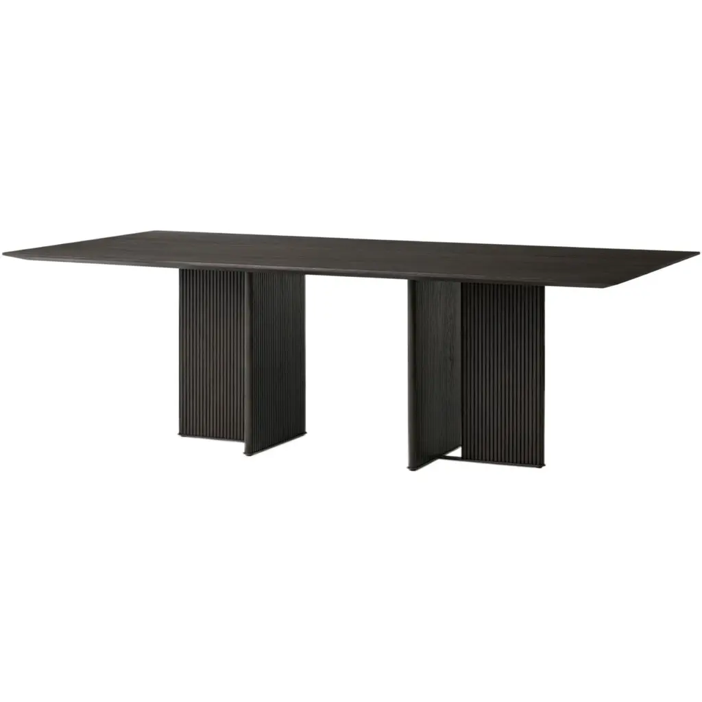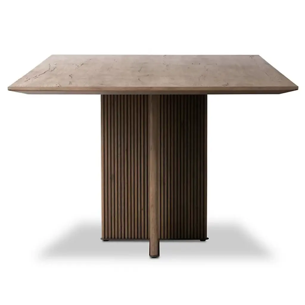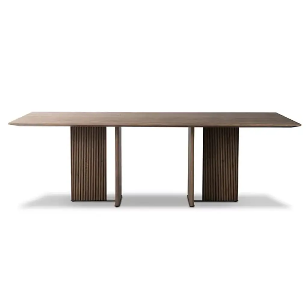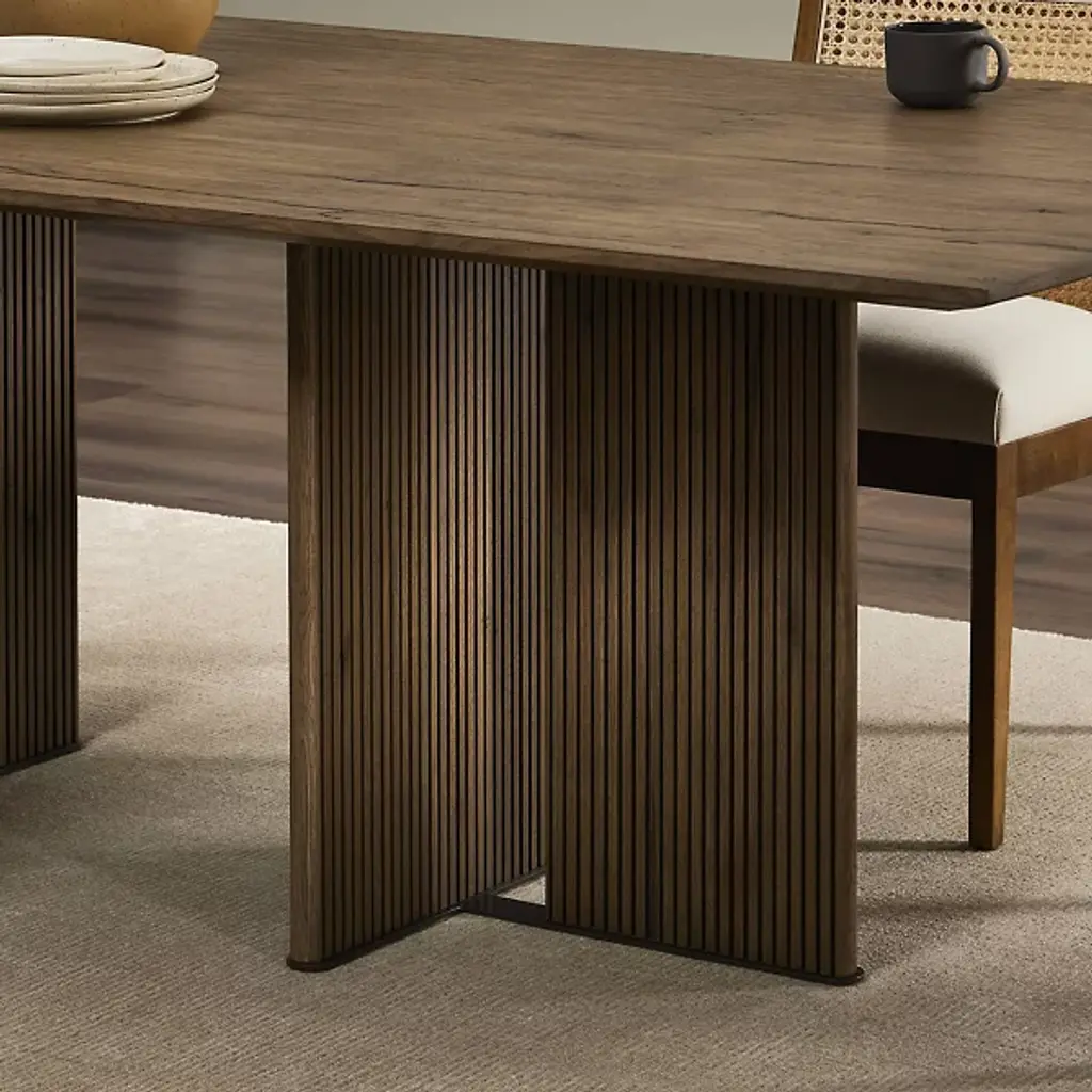 Crafted from rustic-finished oak, the Leo Dining Table from Four Hands is defined by its clean, structured lines and features reeded base panels that add texture and a linear aesthetic. The table is a result of a collaboration between Four Hands, Thomas Bina, and Brazilian designer Ronald Sasson, blending timeless design with modern craftsmanship. Perfect for large gatherings, this elegant table comfortably seats 10, making it an ideal centerpiece for any dining space.