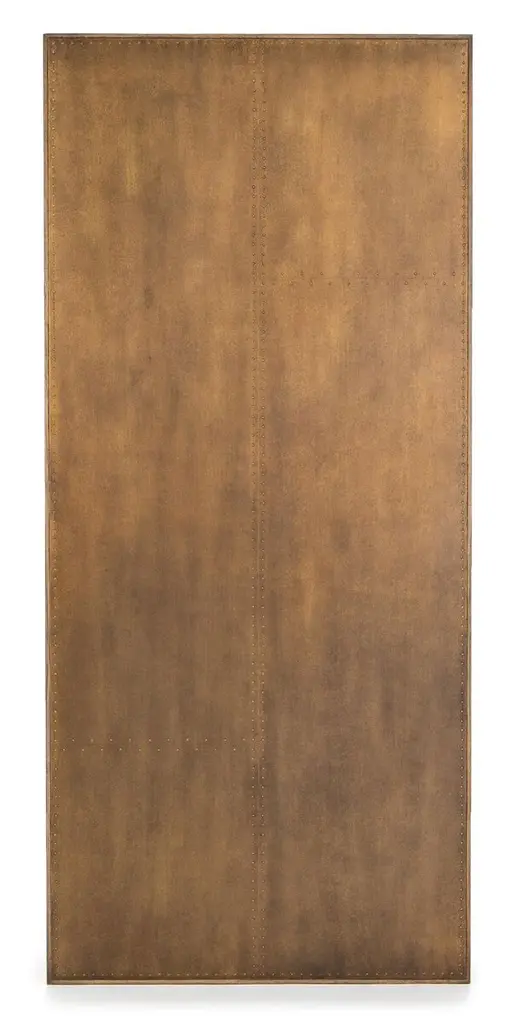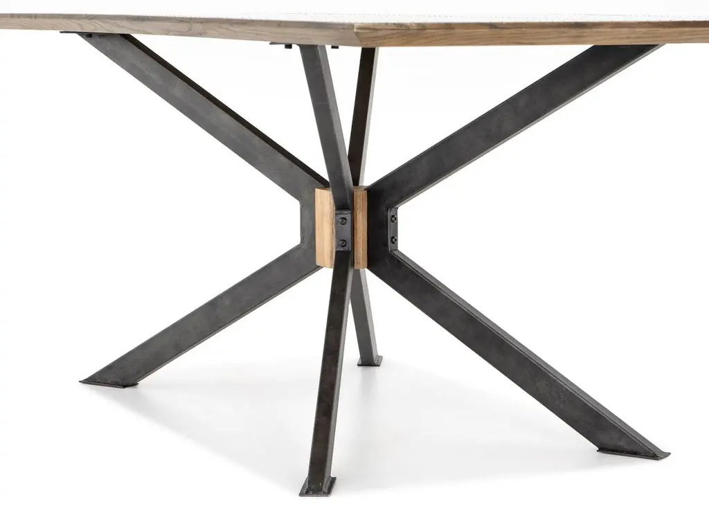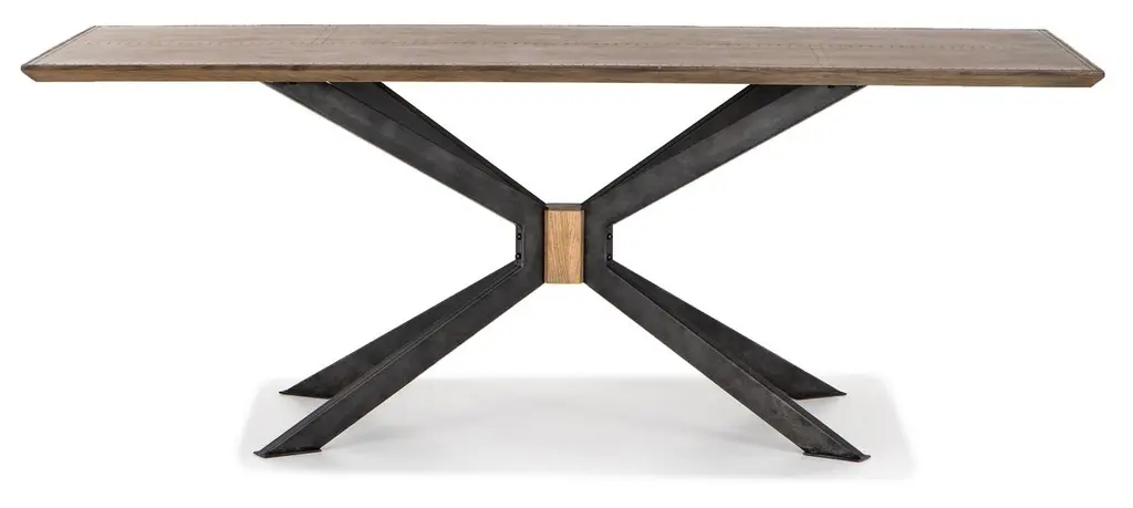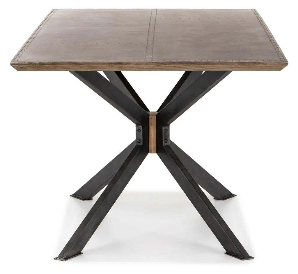 The brass-finish band that wraps around the intersection of the four iron legs matches the riveted inset of the tabletop. The result is a dining table that pairs Mid-Century Modern with industrial chic.
