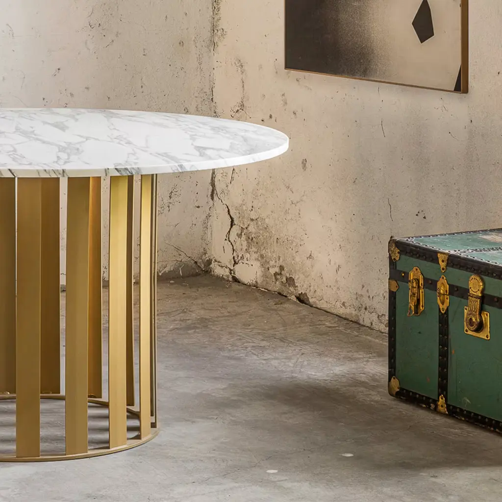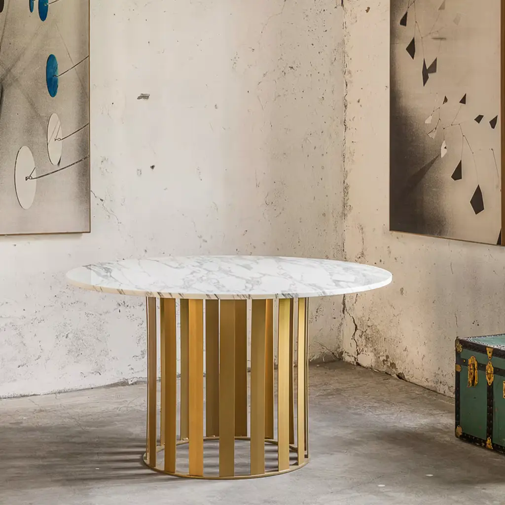An elegant and sophisticated design to complement a refined contemporary interior, this dining table features a round shape minutely handcrafted of first-rate materials. The bold and sleek structure is handmade of gold-lacquered iron, showcasing a series of vertical stems rising from a circular base which recalls the rounded shape of the stylish top, handmade of white statuario Carrara marble. Customizable in marble type and structure lacquer, please consult the Concierge for options.
