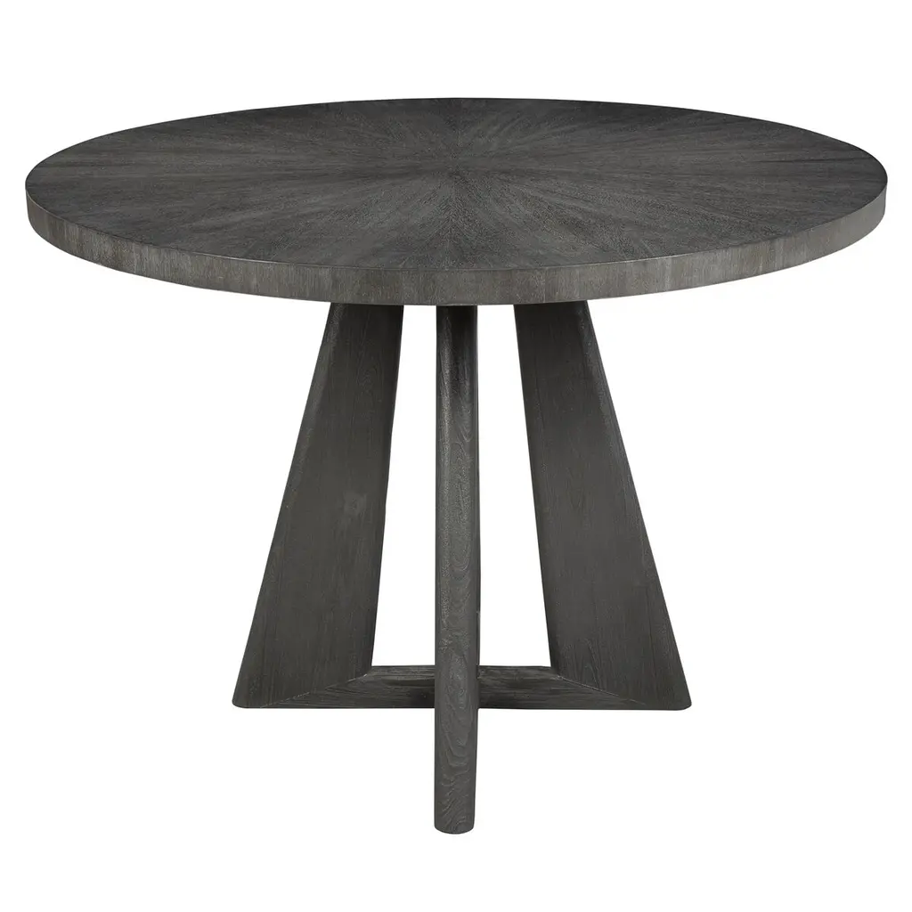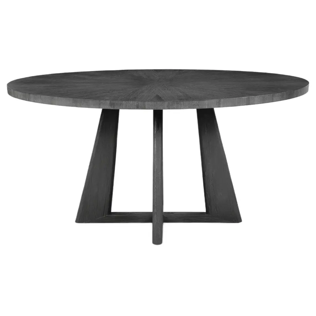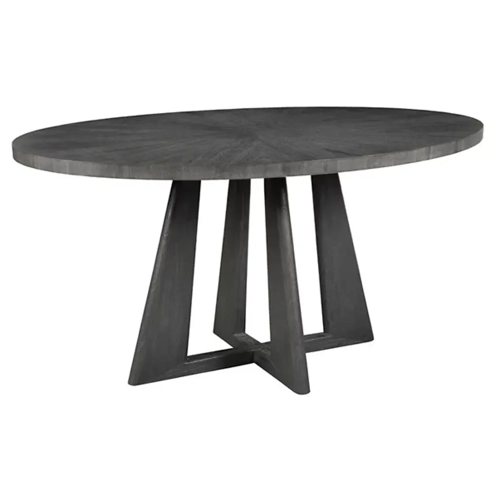 Embrace the allure of modern elegance with this exquisite dining table, a masterpiece of contemporary versatility. Its top, crafted from rich acacia veneer, is adorned with a dark walnut stain, delicately washed with a light gray glaze, creating a harmonious blend of tones that captivate the eye. The sunburst oval top is gracefully supported by rounded legs made of solid acacia, enhancing its natural beauty and inviting warmth. As the seasons change, the solid wood will subtly shift with temperature and humidity, resulting in unique cracks and uneven surfaces that only add to its authentic charm and character. This dining table is not just a piece of furniture; it is a testament to the beauty of nature and craftsmanship, destined to be the centerpiece of your dining experience.