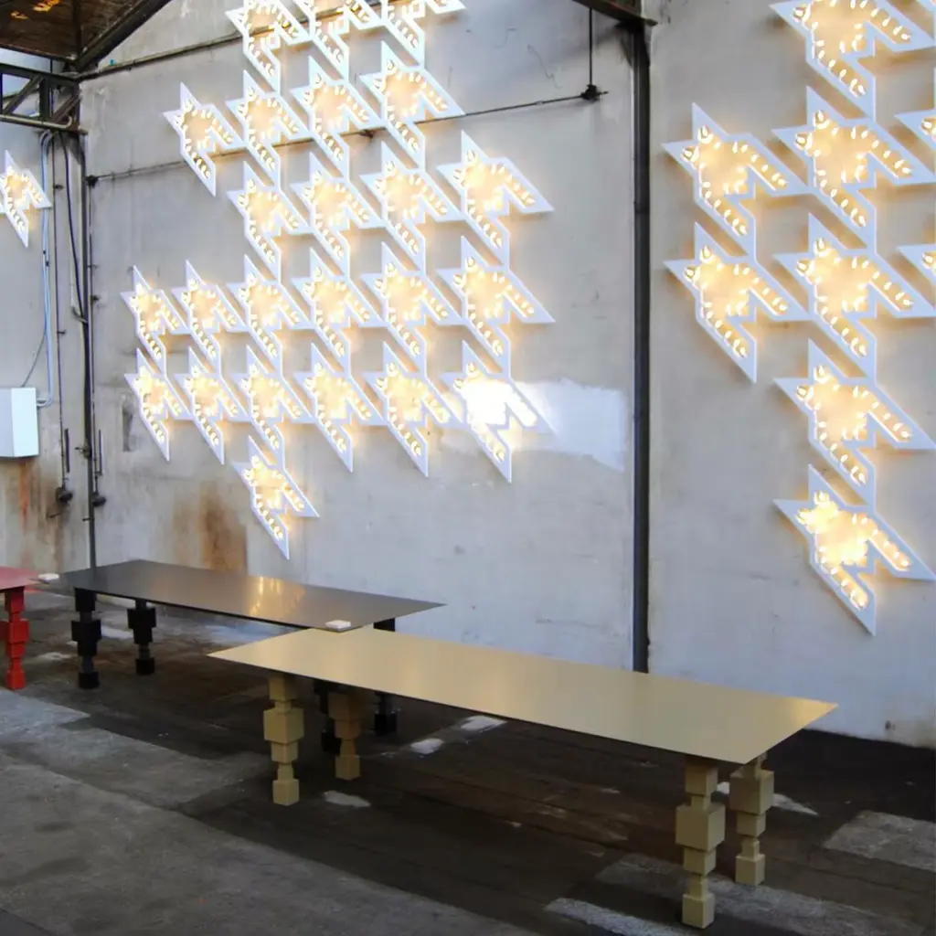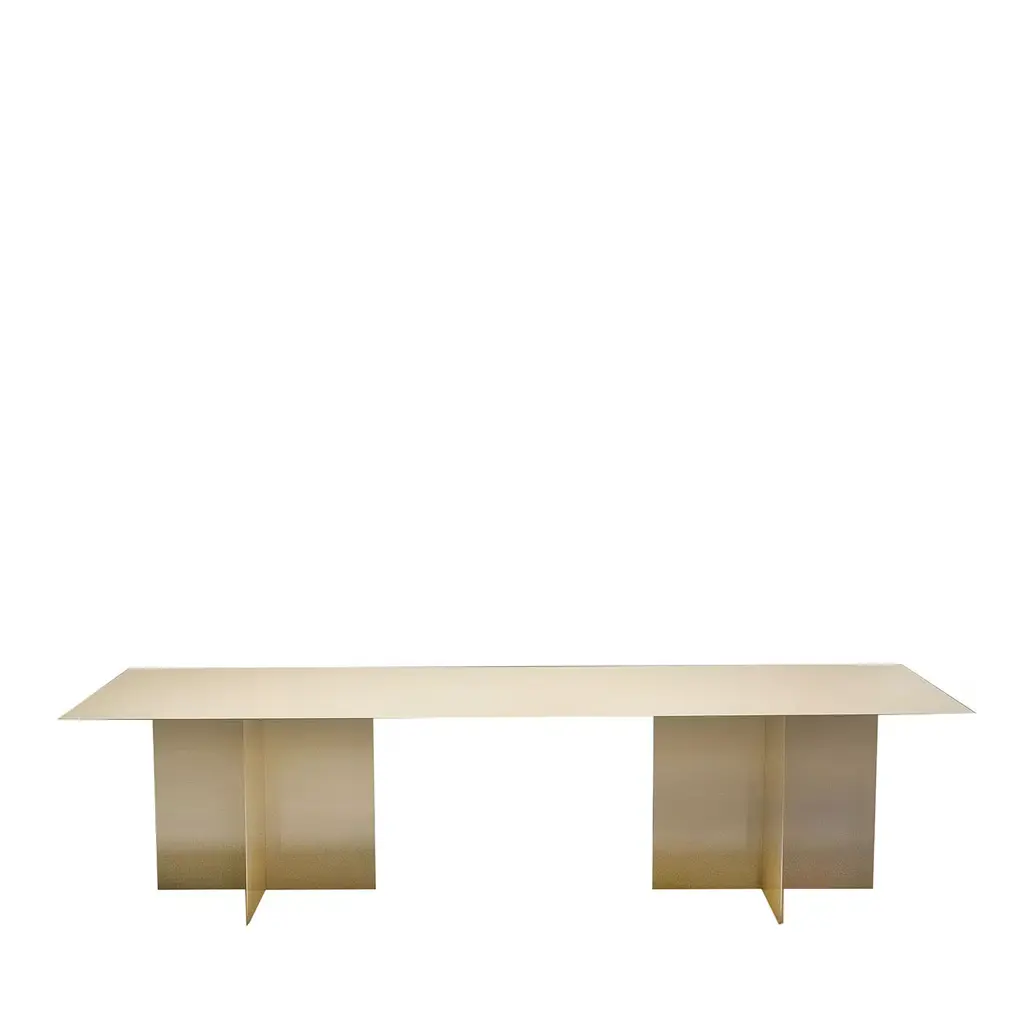 This sculptural dining table will have a bold presence in a contemporary or industrial-inspired dining room. Versatile and dynamic, it features a rectangular steel top raised on four white-finished wooden legs composed of cubes of different sizes stacked in a seemingly off-kilter arrangement. Equipped with caster wheels hidden under the legs, this table can easily be moved, a feature that makes it suitable for an office conference room or any other commercial decor. It is also available with a square top.