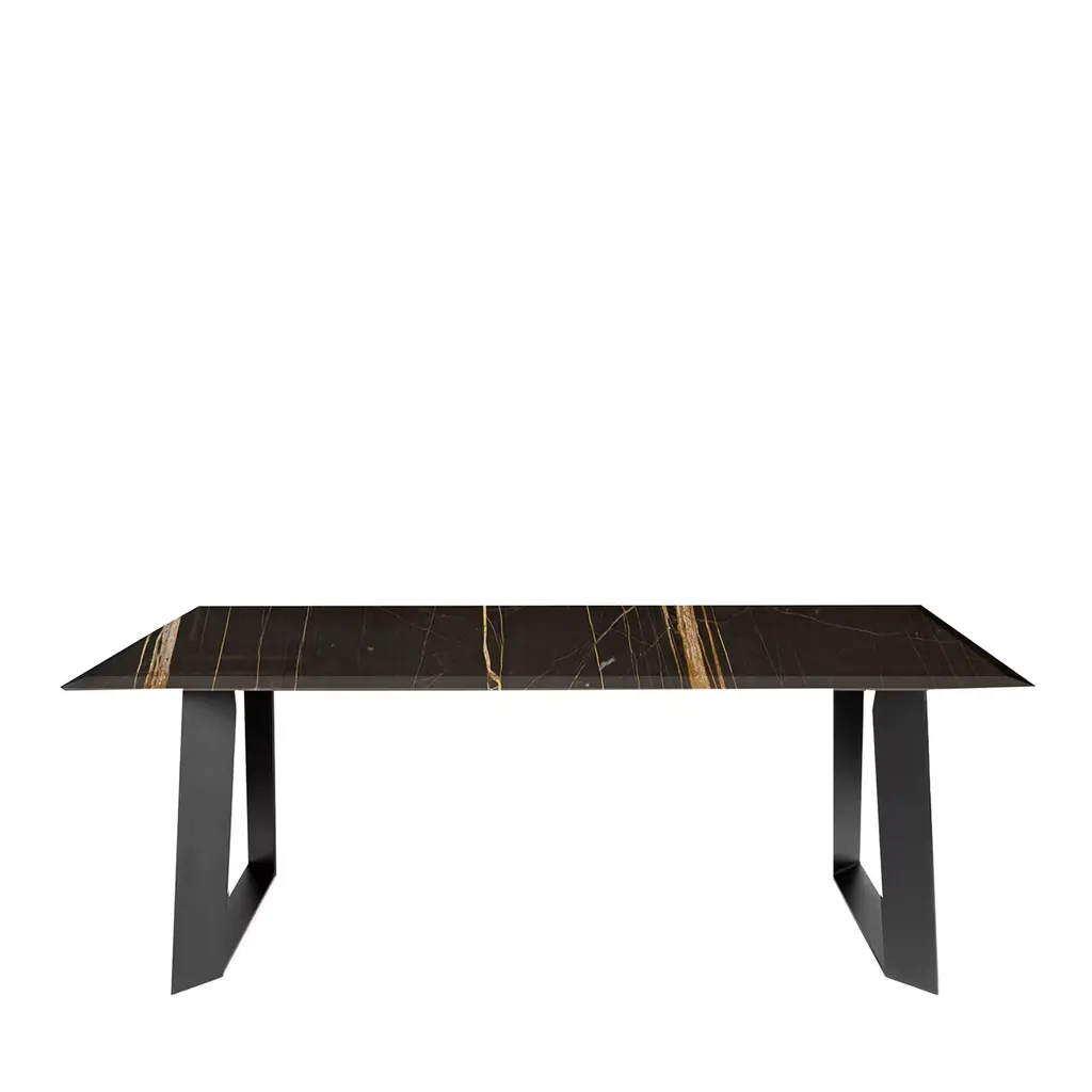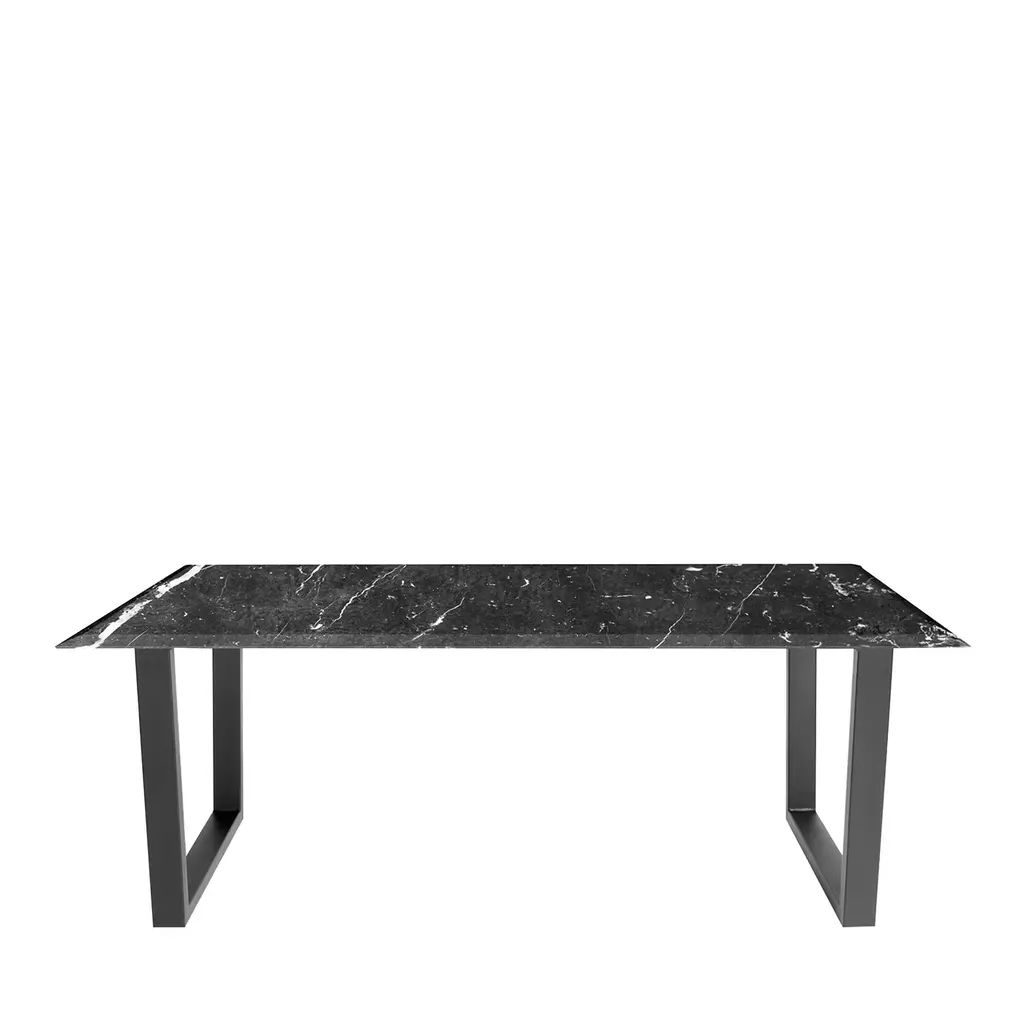 The rigorous and sculpted silhouette of this remarkable dining table will elevate any contemporary interior. Its intense, dark hues are interrupted by the white veining gracing the handcrafted top in black statuary Marquina marble. Sturdy legs in black-lacquered iron and soldered by hand create connected by a floor element to support the majestic top while maintaining an overall visual lightness. Metal finish and marble types can be customized upon request to the Concierge.