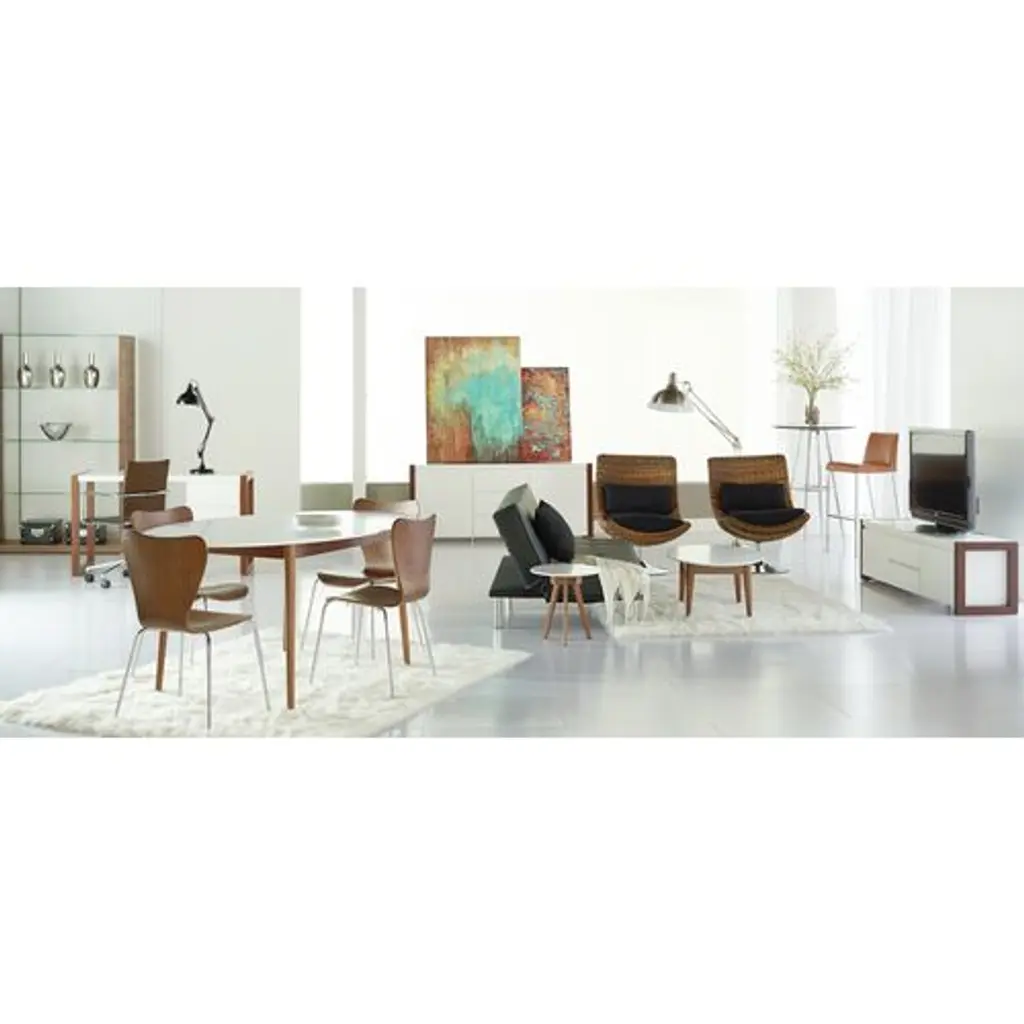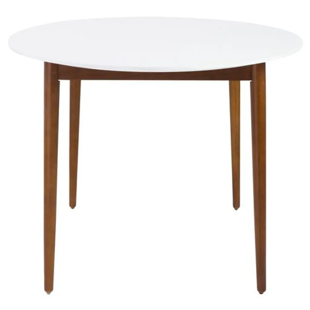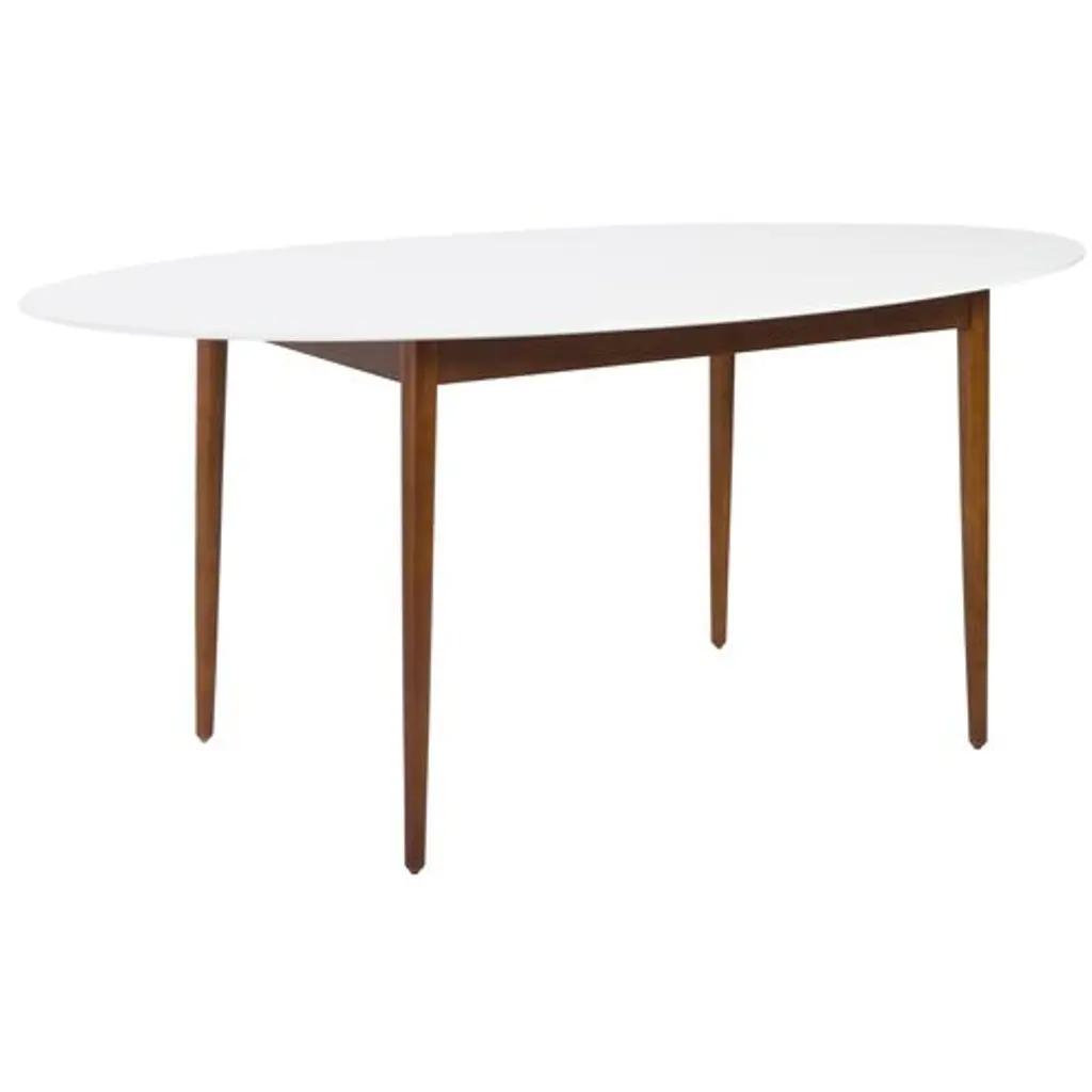 A matte white top pops against the walnut legs of this sleek, contemporary oval dining table. Seats up to six people