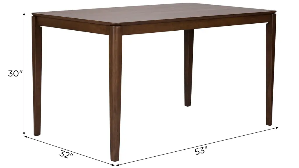 Liberty Dining Table features a satin walnut finish, a fixed top, and is anchored by tapered legs with a softly rounded edge. This table is sure to create a simplistic statement in any room.