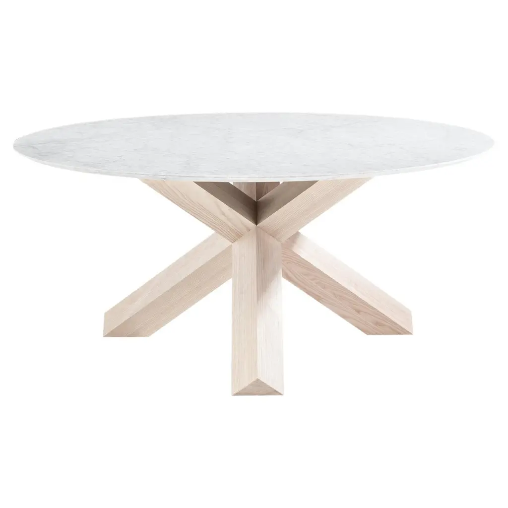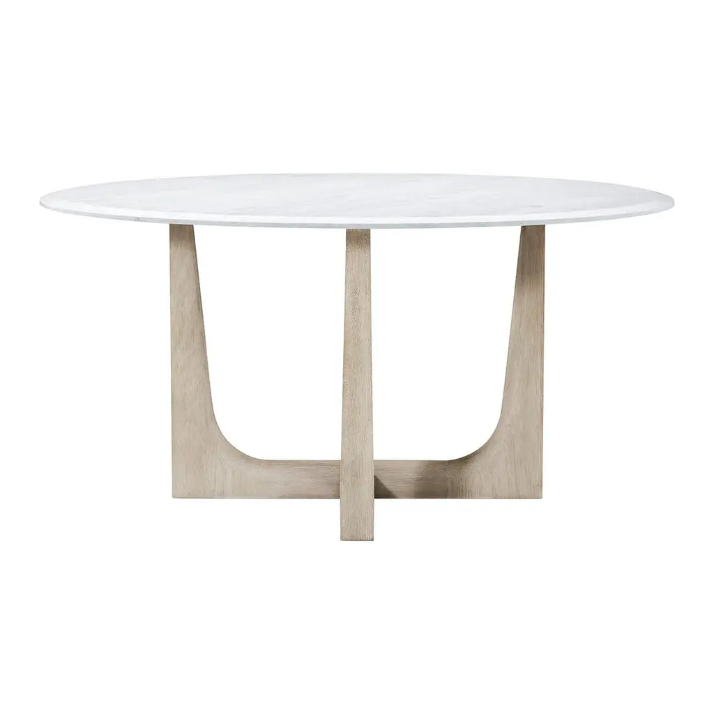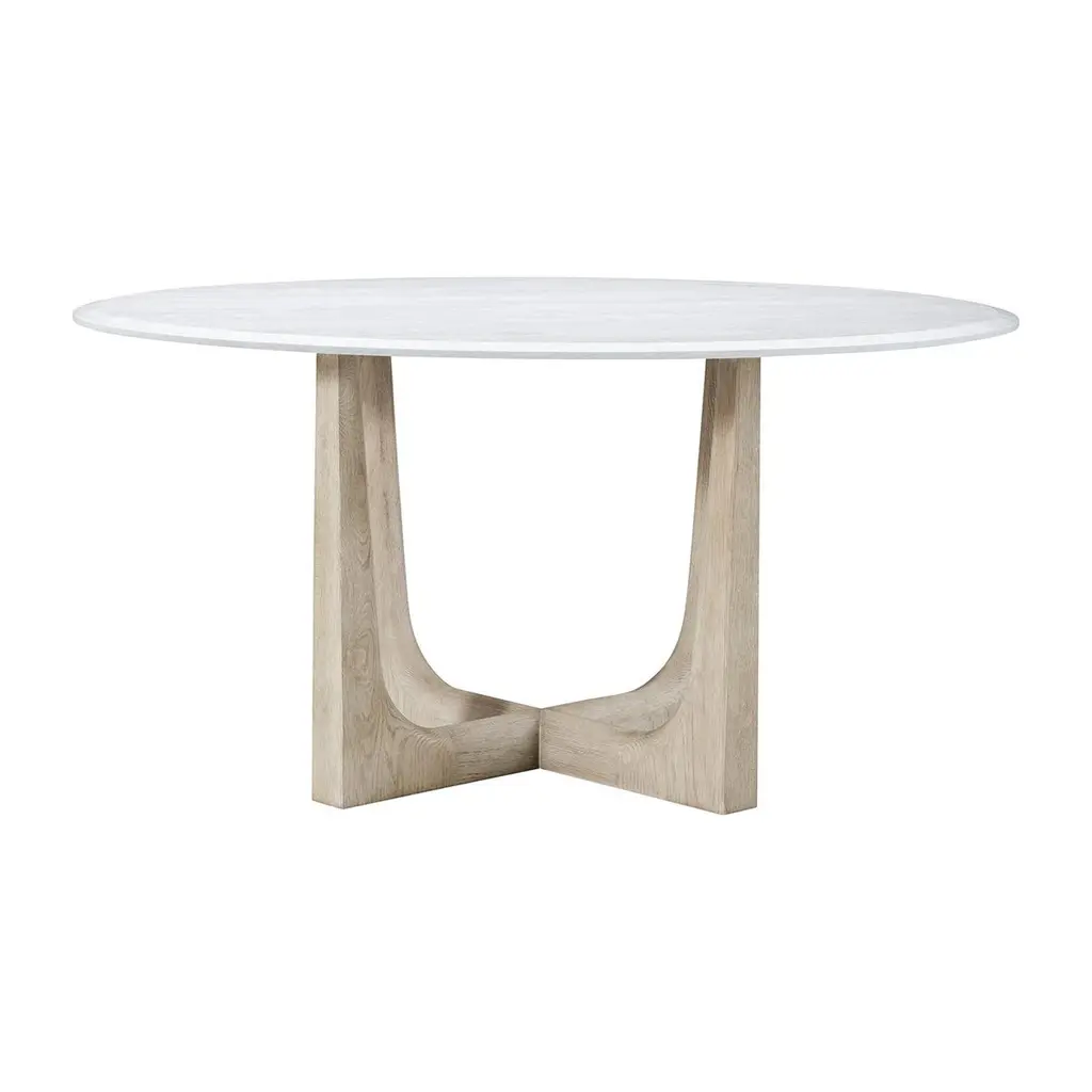 A 60" round quartz top dining table that seats six comfortably. Its X-form base and elegant legs in our light grey oak finish reach upwards to perfectly balance the stone giving the impression of lightness. The beveled edge of the quartz adds comfort to an otherwise harsh edge.Dimensions: 60" W x 60" D x 30" H