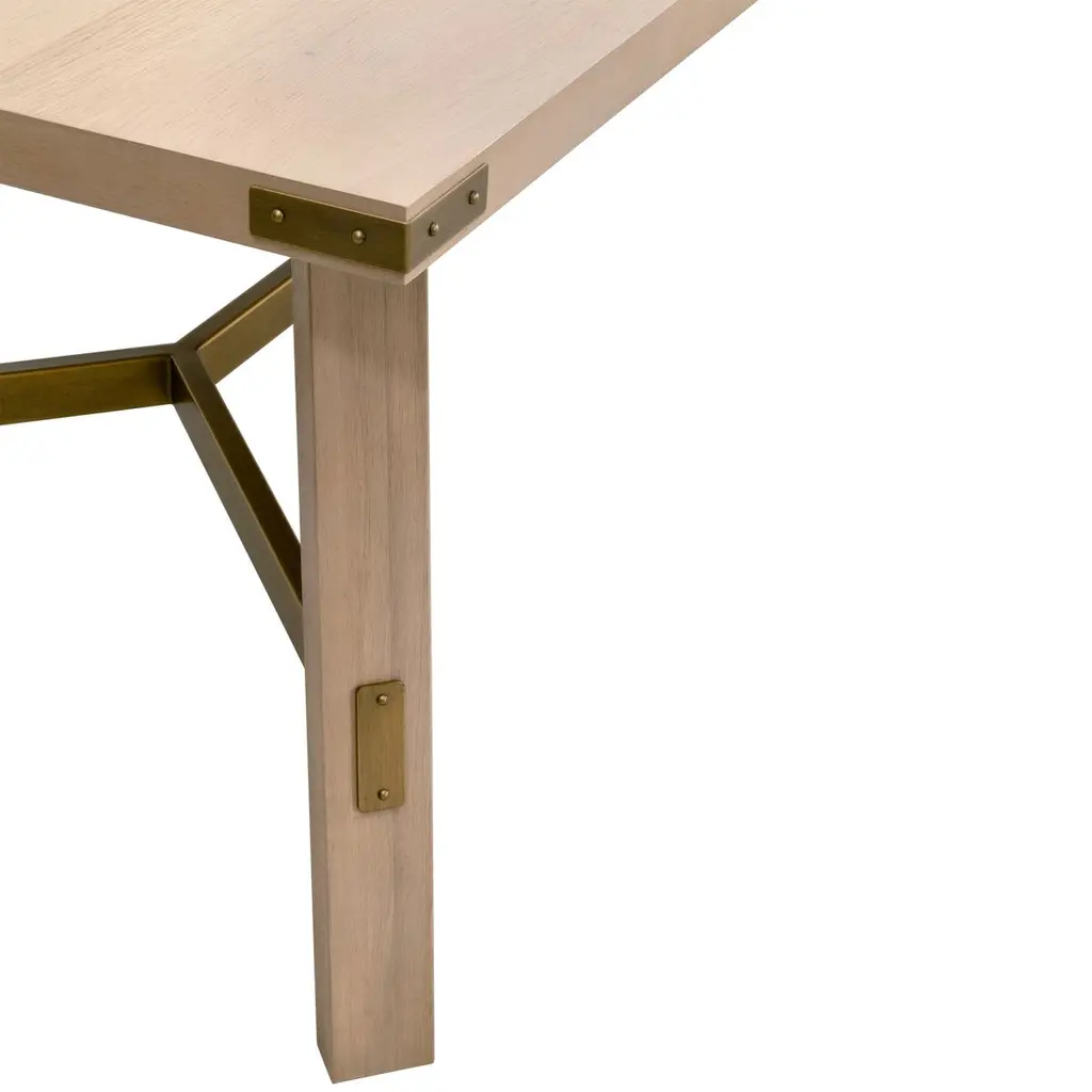 The warm tones and timeless style of this dining table will be a staple in your dining area for years to come. It is constructed with a beautiful oak veneer wood in light honey tones and warm brown wood grain. The combination of honey hues perfectly complements the brushed gold brackets along the corners of the tabletop and brushed gold leg stretcher base. The base is both durable with its metal construction and eye-catching with its unique design. Elements of farmhouse, traditional and modern designs make this table an ideal fit for many settings. Measuring 90.25" wide, 40.75" deep, and 29.75" high, this dining table comfortably seats up to 8 people.
