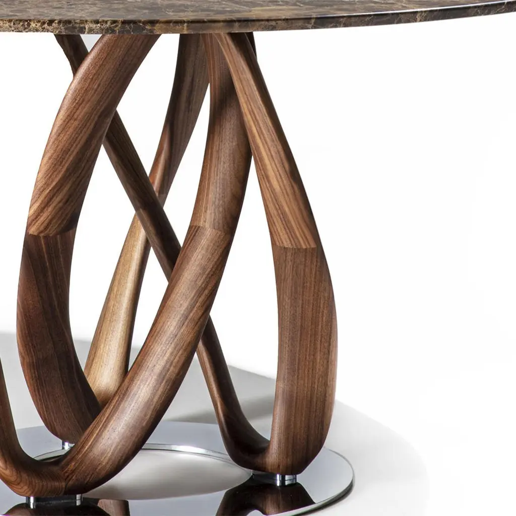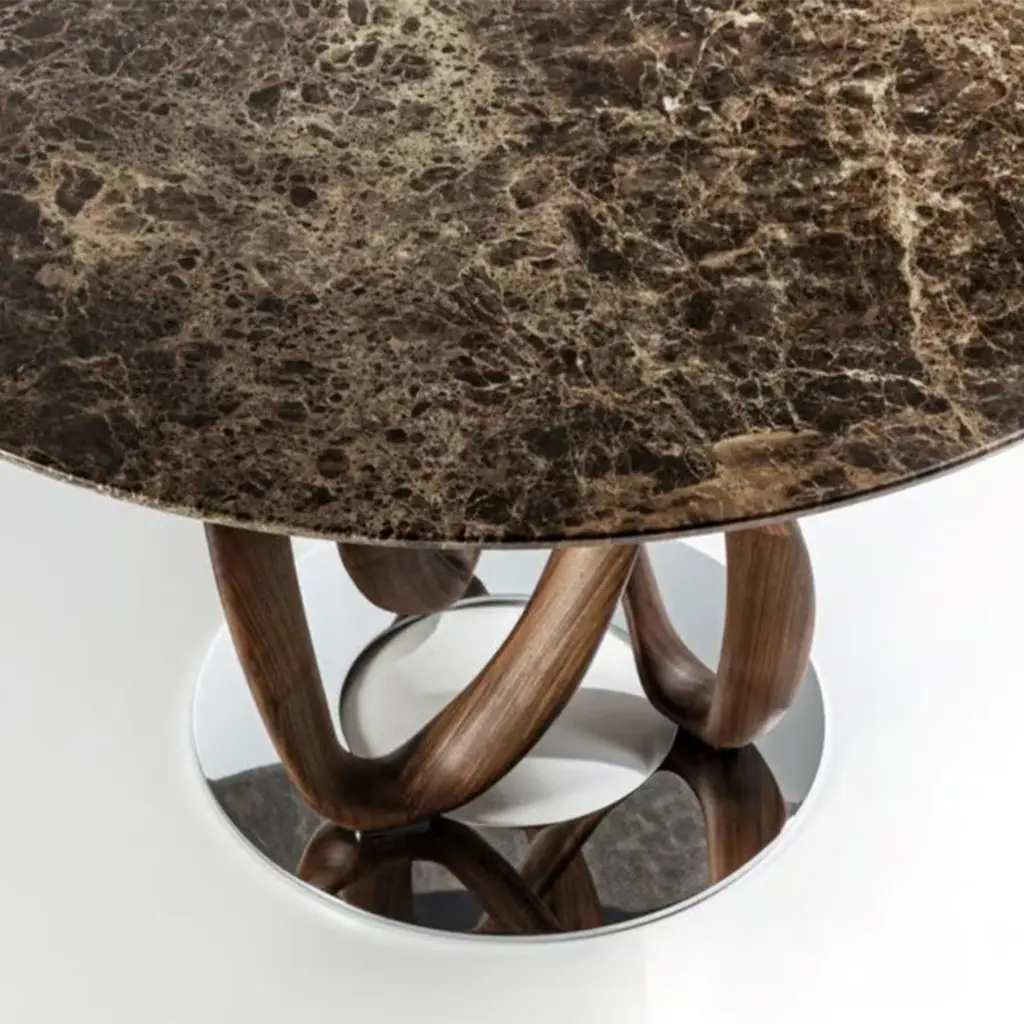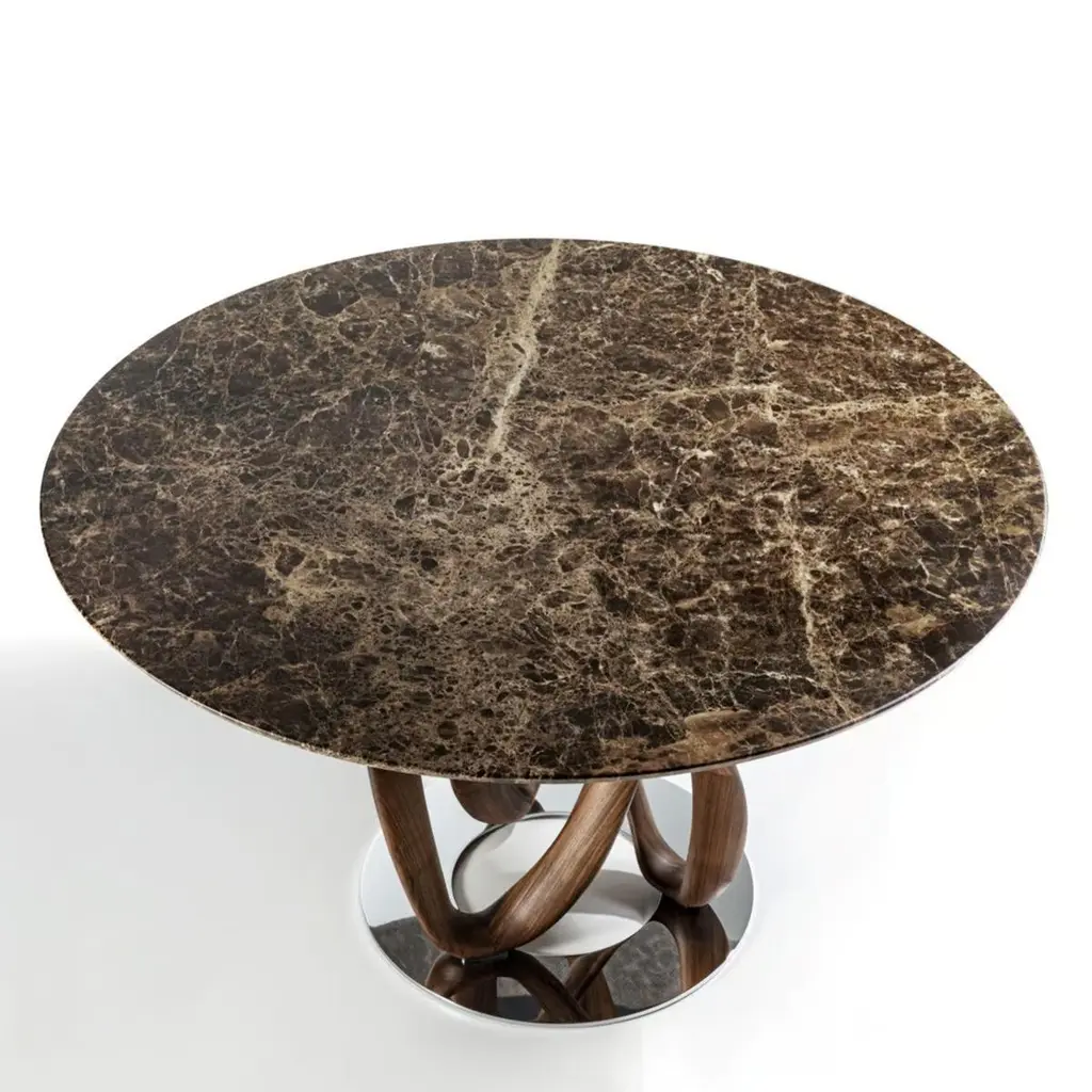 Dining Table Limitless Marble with solid walnut wood baseon steel base ring in chrome finish. With emperador polishedmarble top, 20mm thickness.Also available on request with solid walnut base in stained inmoka finish or in wenge finish.Also available on request with solid ash base in natural finishor stained in moka finish or in wenge finish or in dark grey finish.Also available on request with other marble top finishes includingup-charge. Also available on request in:Diameter 130cmxH75cm, price: 18300,00€Diameter 140cmxH75cm, price: 19300,00€