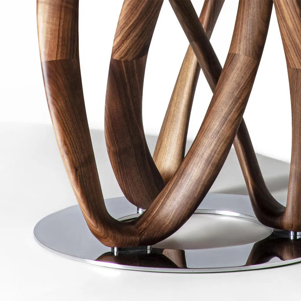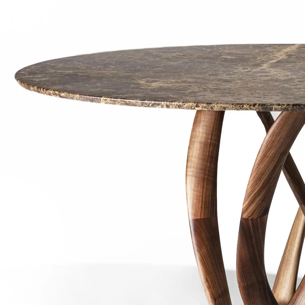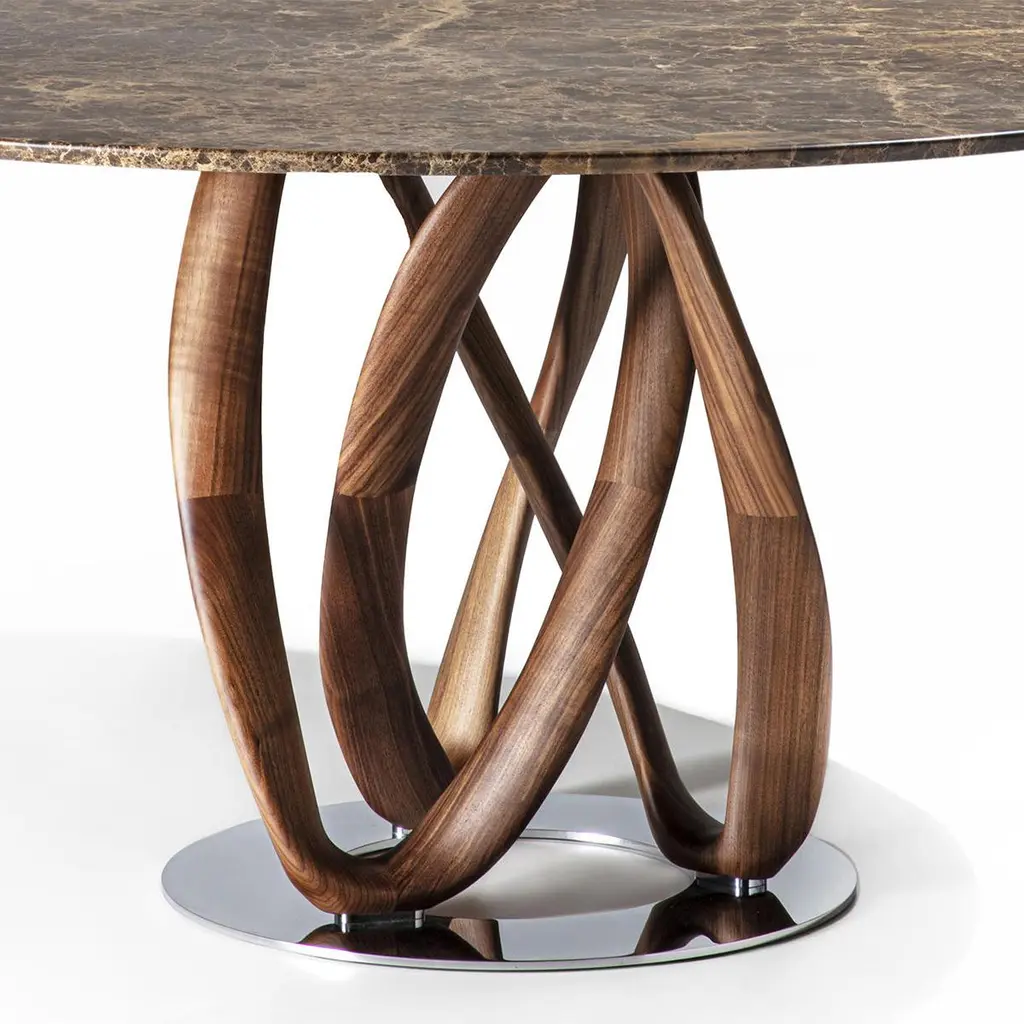 Dining Table Limitless Marble with solid walnut wood baseon steel base ring in chrome finish. With emperador polishedmarble top, 20mm thickness.Also available on request with solid walnut base in stained inmoka finish or in wenge finish.Also available on request with solid ash base in natural finishor stained in moka finish or in wenge finish or in dark grey finish.Also available on request with other marble top finishes includingup-charge. Also available on request in:Diameter 130cmxH75cm, price: 18300,00€Diameter 140cmxH75cm, price: 19300,00€