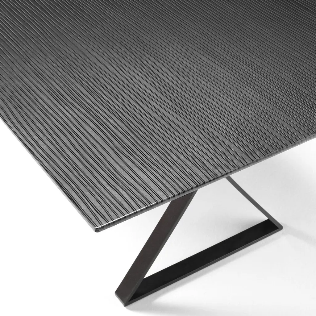 Dining table lines top with metal shades dark grey tinted top, in melted glass in 12mm thickness. With a forged metal base in dark grey finish.Also available on request in:L 200 x D 100 x H 75cm, price: 6900,00€.