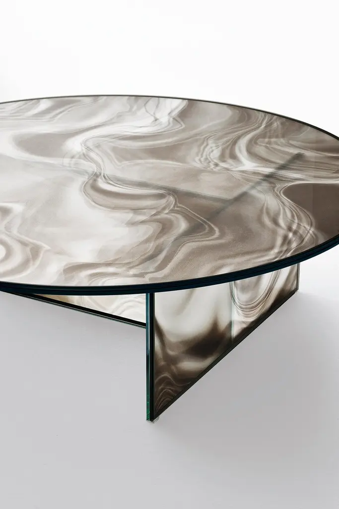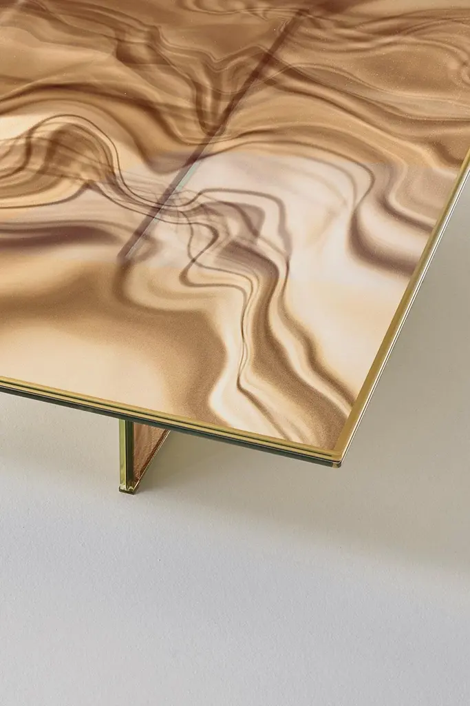 Console table in tempered extralight glass, with faded and irregular decoration which takes on the color and veins of marble.The surprising image changing effect makes the veining look dynamic and variable depending on the viewpoint. Available in four different colors: green hues, pink-beige hues, whiskey and anthracite-grey. The decoration is enclosed by a coordinated colour frame painted on the glass perimeter.Please note that the list price excludes VAT. An additional VAT charge may apply.Finishes: green, pink-beige, whisky and anthracite-greyAvailable in different versions, please inquire with us.DIMENSIONS:L120 W42 H85 cmSquare, round and dining version available, please inquire with us.