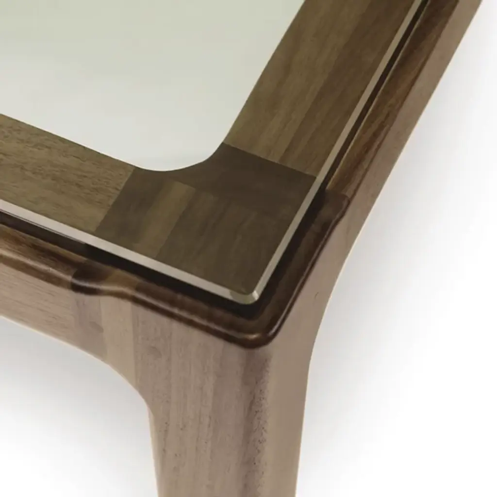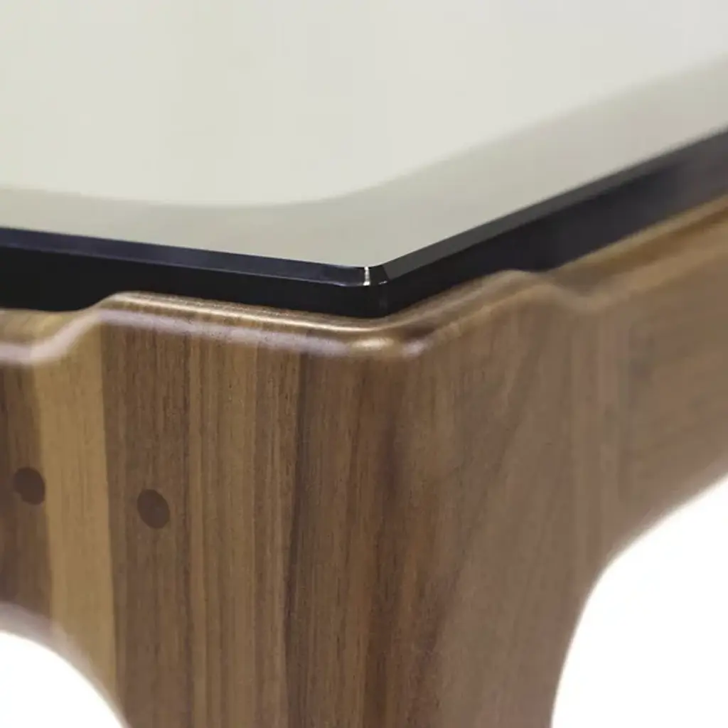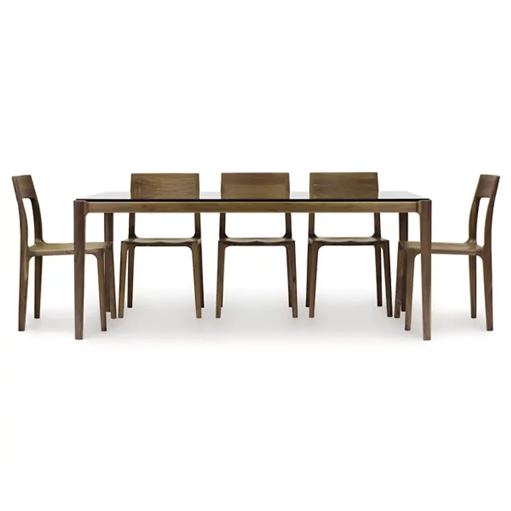 Make a statement with your indoor furniture choices, courtesy of the Lisse Glass Top Table by Copeland Furniture. A dynamic blend of style and grace, this table makes any dining room space bolder and better equipped for parties, meals and more. The 15mm glass top adds a sleek look, while the strong black walnut hardwood ensures a durable and strong design. This indoor glass top table is finished in a glossy top coat and adds a refreshing feel to any dining room space.