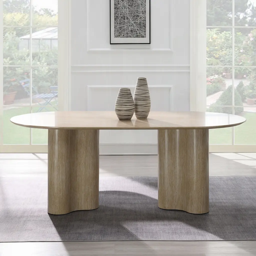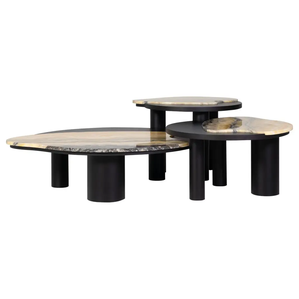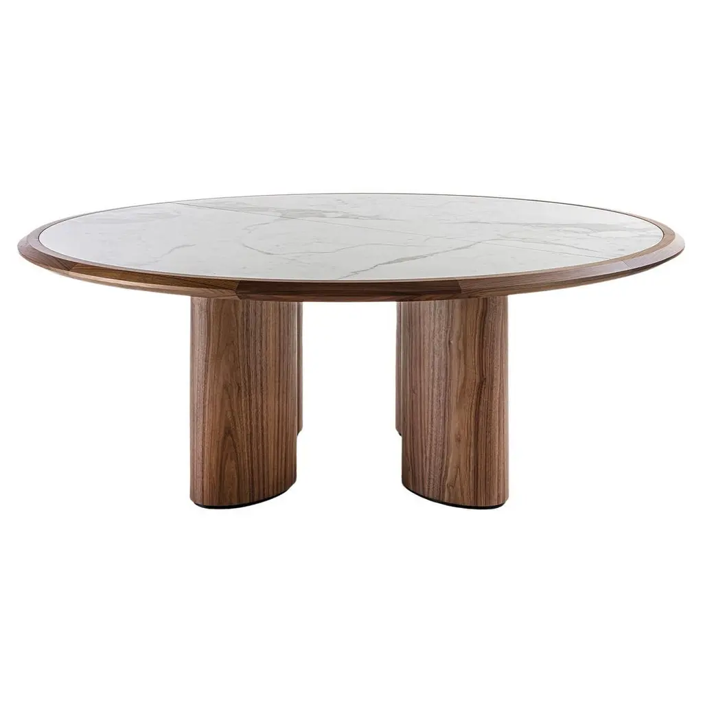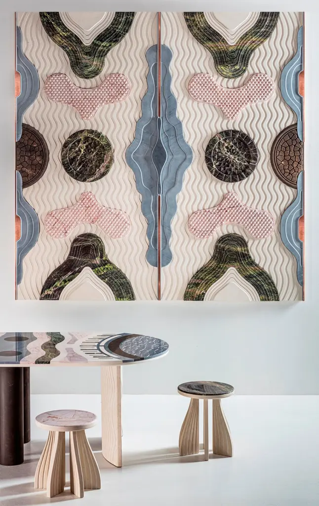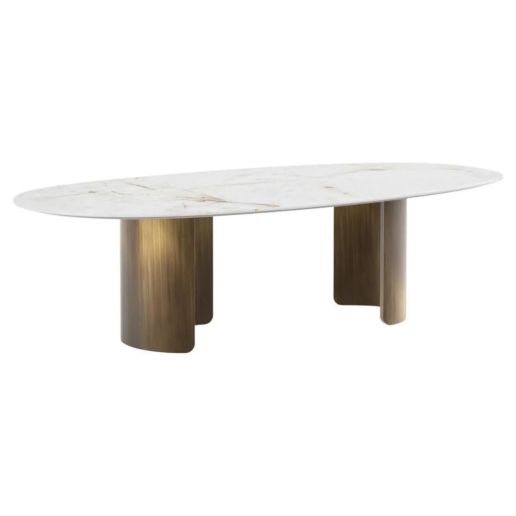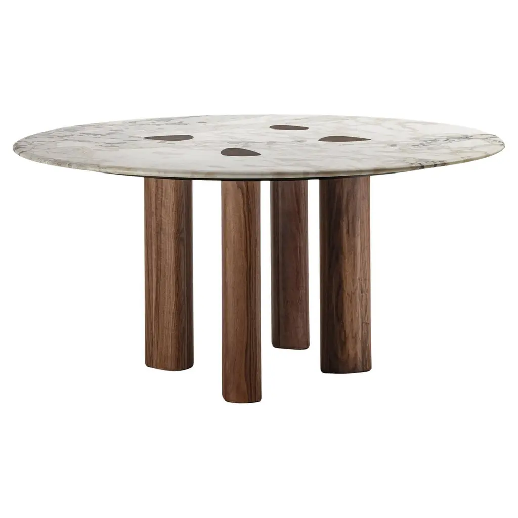This table, features an elegant top with rounded edges, resembling the colours and shape of the famous lake which came from a volcanic crater. From the central part to the outside edges the design reflects the connection between land and volcanic rock. The curved legs resemble the waves of the sea as the stools Sibà are inspired by the island's mountain community.The table-top is crafted with coloured marble which is cut and then sculpted by numerically controlled machines, then it is all manually finished and assembled into one single piece. The legs are created by four semi-circular white stone elements, featuring curved incisions and by two central columns in PietraPece. Matching stools Sibà are also available: the white marble, rounded seat area is covered with a piece of coloured marble while the five curved and sculpted legs are in white marble.Material: Bianco Fenice, Bardiglio Imperiale, Pietra Pece, Rosalia, Green Forrest.Dimensions of table: cm 220 x 100 x H 73.
