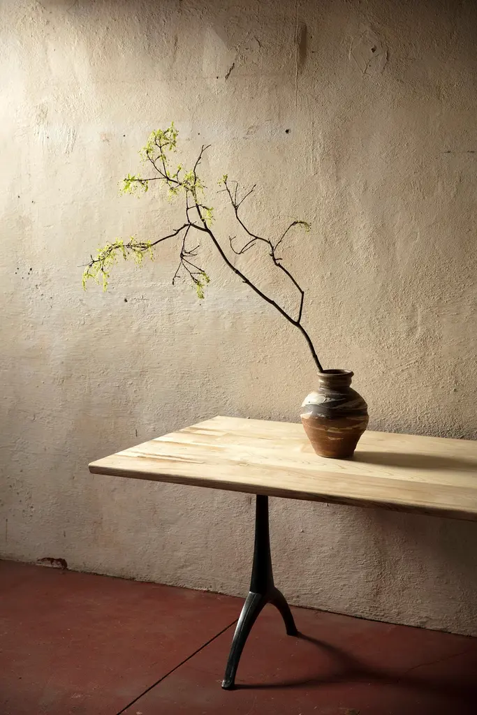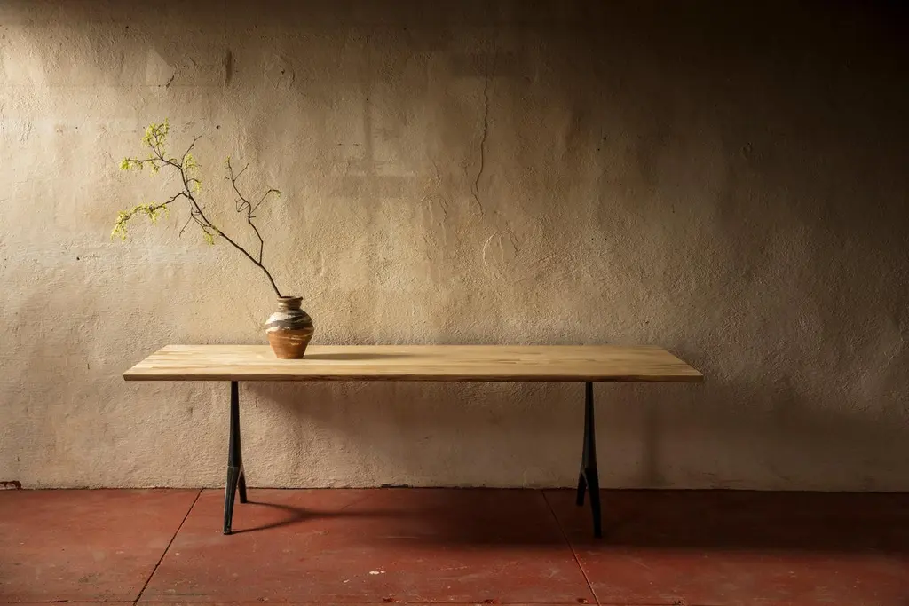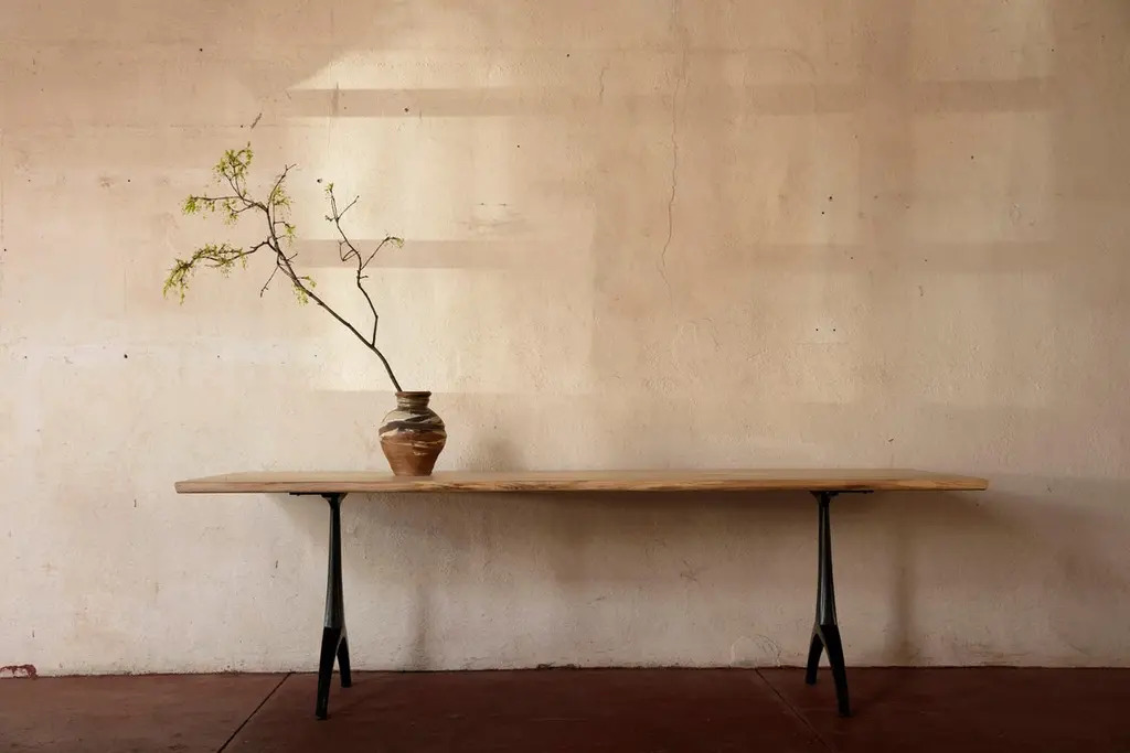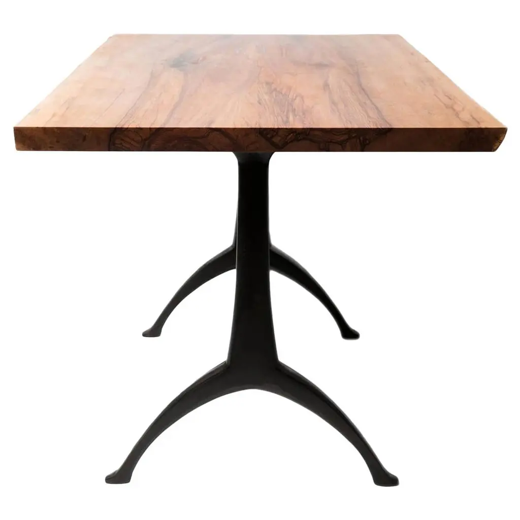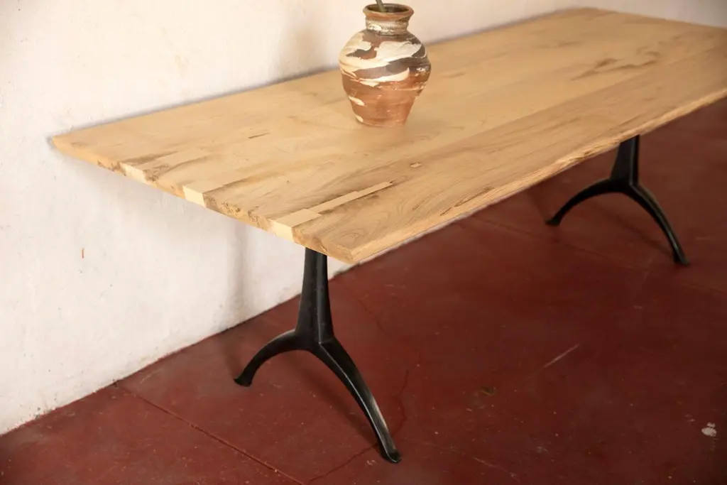 We call this live edge dining table light color wood on black patina cast wishbone base part, our legacy table. It features the natural live edge of the hackberry tree's original form! Our iron Legacy Wishbone pedestal base is hand cast at Sloss Furnaces, a National Historic Landmark in our home town of Birmingham. The hackberry presents a unique light color. Combining both modern and traditional production technologies, this marriage results in an iconic pairing of clean design and environmentally responsible natural materials. Selected by Garden & Gun magazine as the Overall Winner for their Best in the South awards in 2017, and simultaneously rugged yet chic, this table is the perfect statement piece for your dining room. Pictured here in a pure oil finish. Grain and patching will vary according to the wood selected for each made to order table.The footprint of the pedestal base is 22.5" wideA field-to-studio company, Alabama Sawyer repurposes the finest wood species, reclaimed from our local urban forests, to create one of a kind furniture pieces and accessories for the home or business.Urban wood has character. Character can include variations in color and grain, small pin knots, evidence of historical intrusion. There may be cracks or knots that we fill, patch or join in a considered and artful way at the makers discretion. We look at every slab and decide what needs a patch or epoxy or both. Case by case, one may be more effective and better for the furniture, aesthetically, structurally, and for our process. If a specific tool, like a patch, is not desired, please specify this when ordering. This may require procuring different lumber which can alter costs.