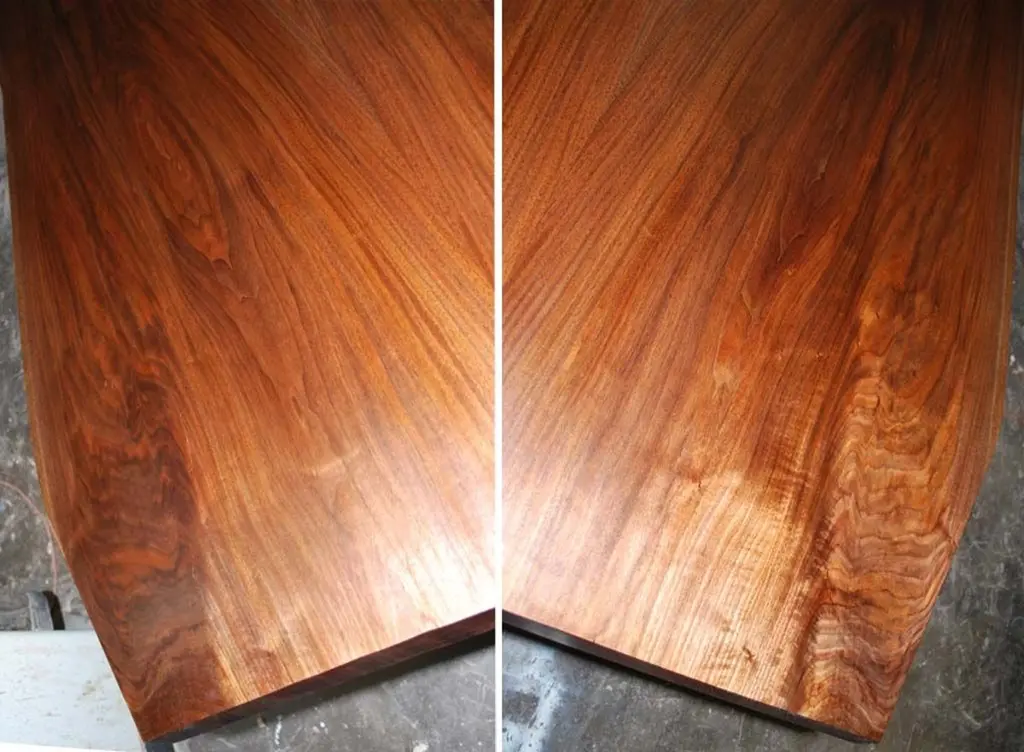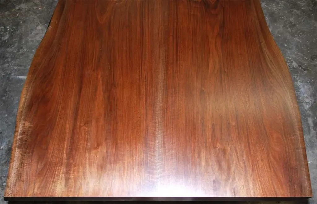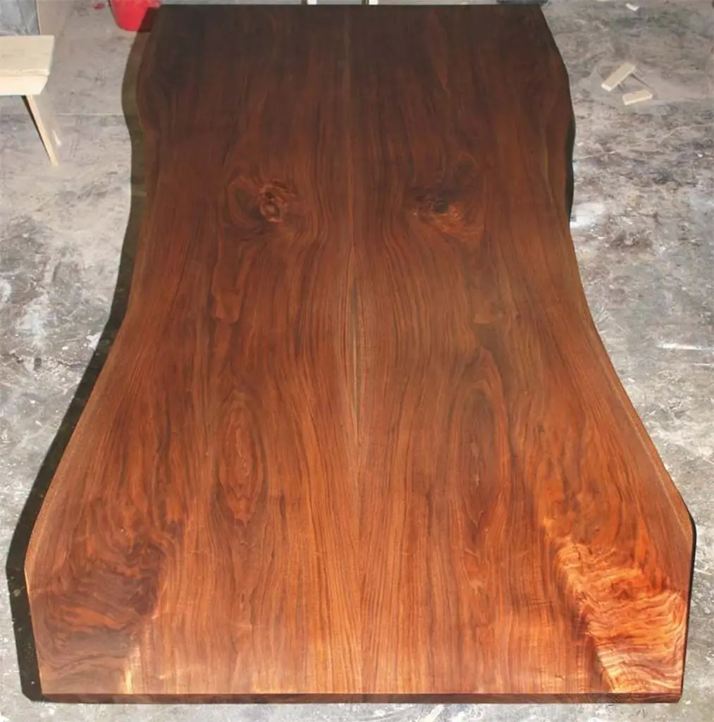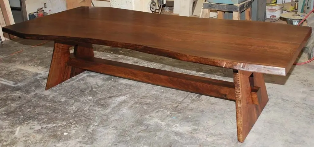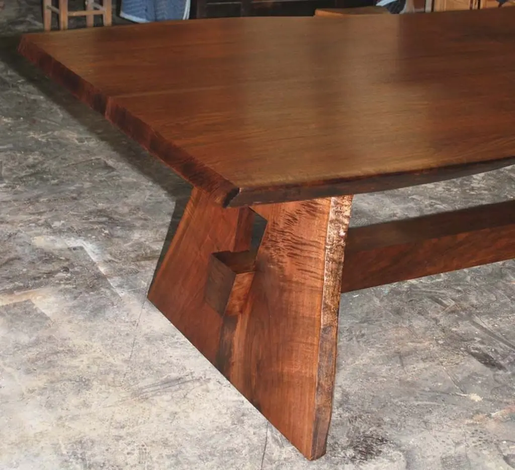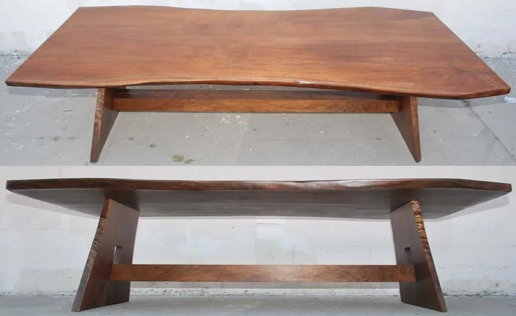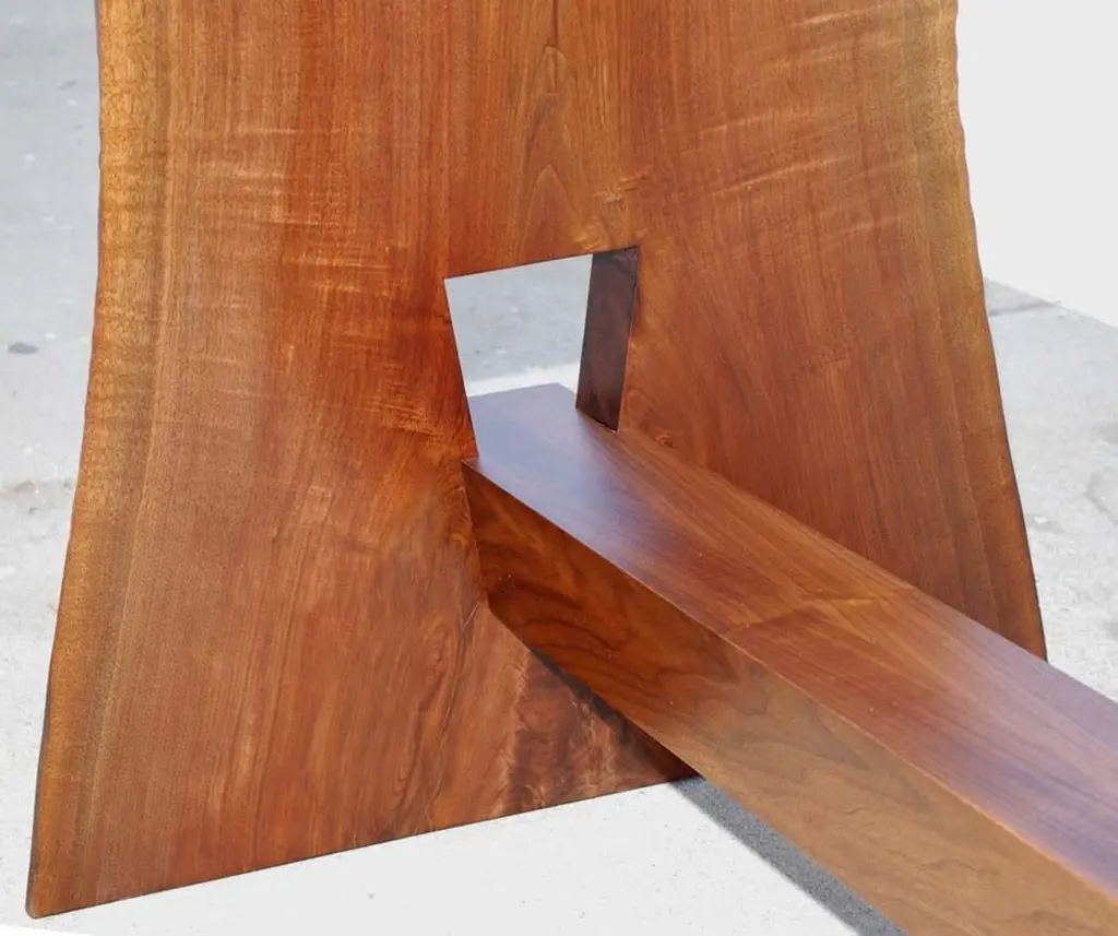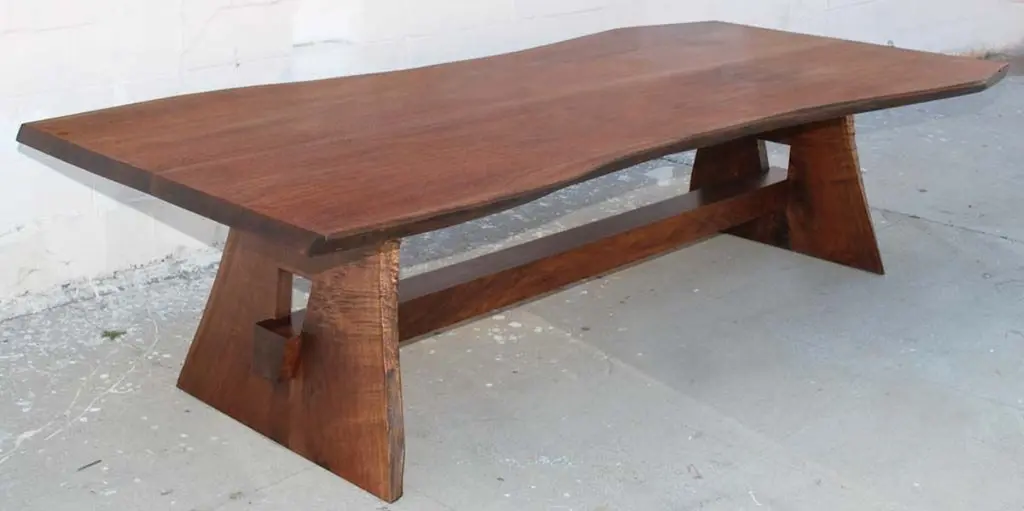 This live edge table is made from two 'sister-slabs' of book-matched black walnut. The top is made from the two center cuts of a massive Pennsylvania black walnut tree trunk. The two slabs were 'butterflied' creating a symmetric grain pattern in the tabletop. The highly figured woodgrain shows lots of fire and flame.The two legs are also a book-matched pair of black walnut flitches. This collapsible table assembles in 2 minutes by inserting and locking the massive trapezoid shaped stretcher into the trapezoid shaped key holes in the legs! The live edge of the actual tree is preserved for an organic freeform.We build these tables to order in our Los Angeles workshop. No two are alike but you can choose the slabs to be used in advance, from photos. You can not only influence the size and shape but even the species of wood and finish.