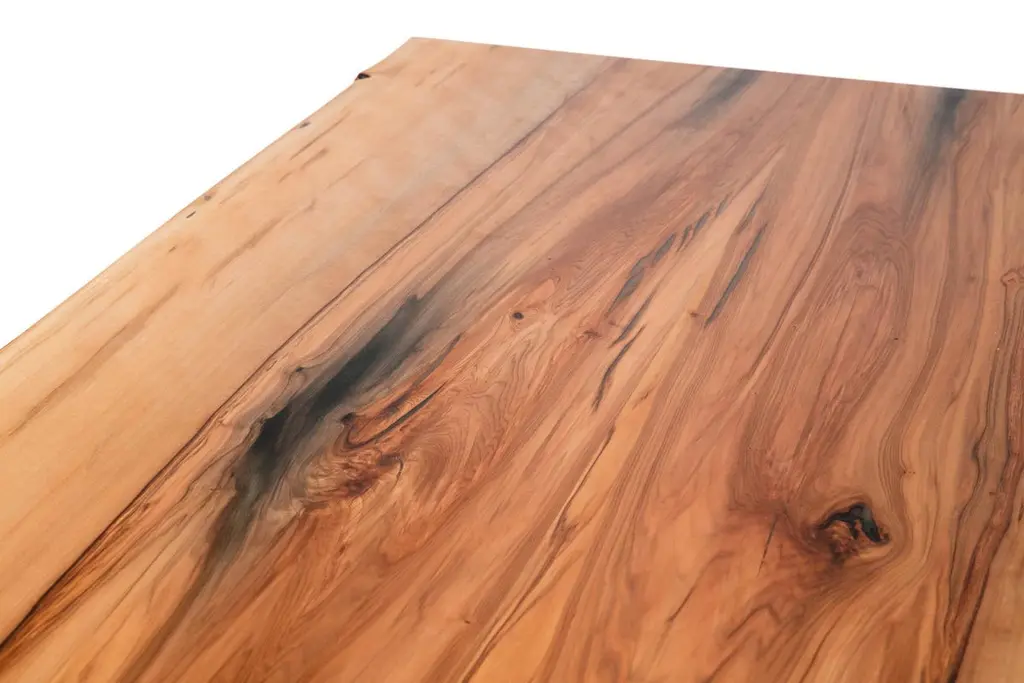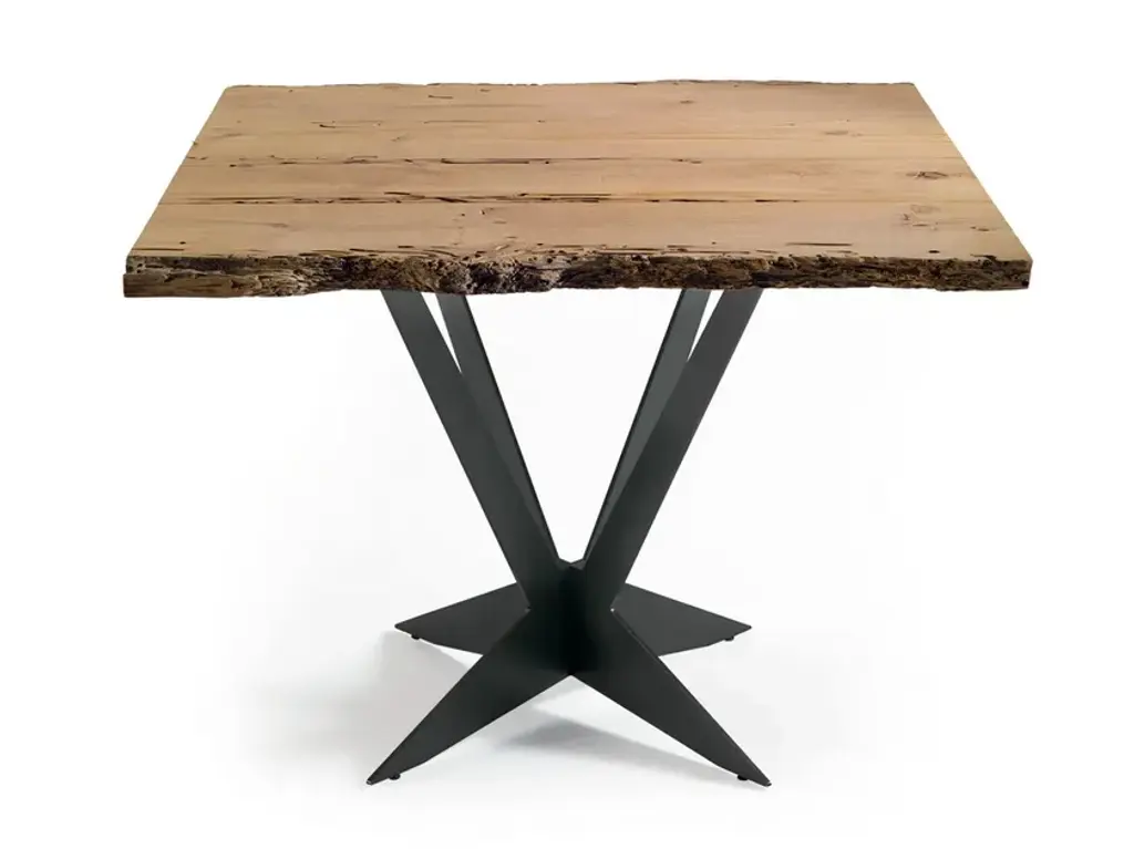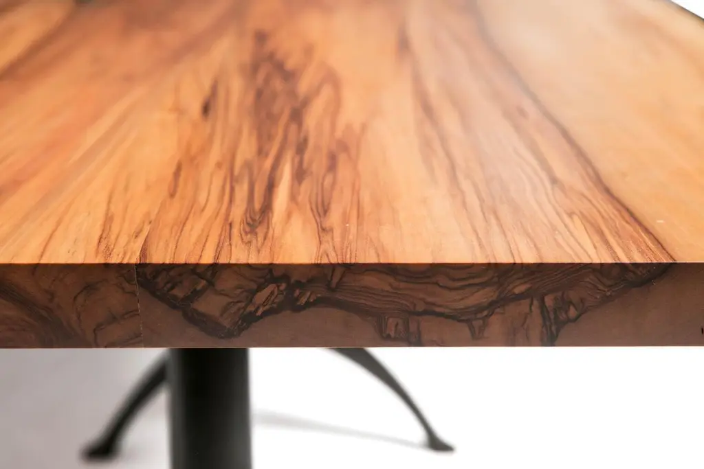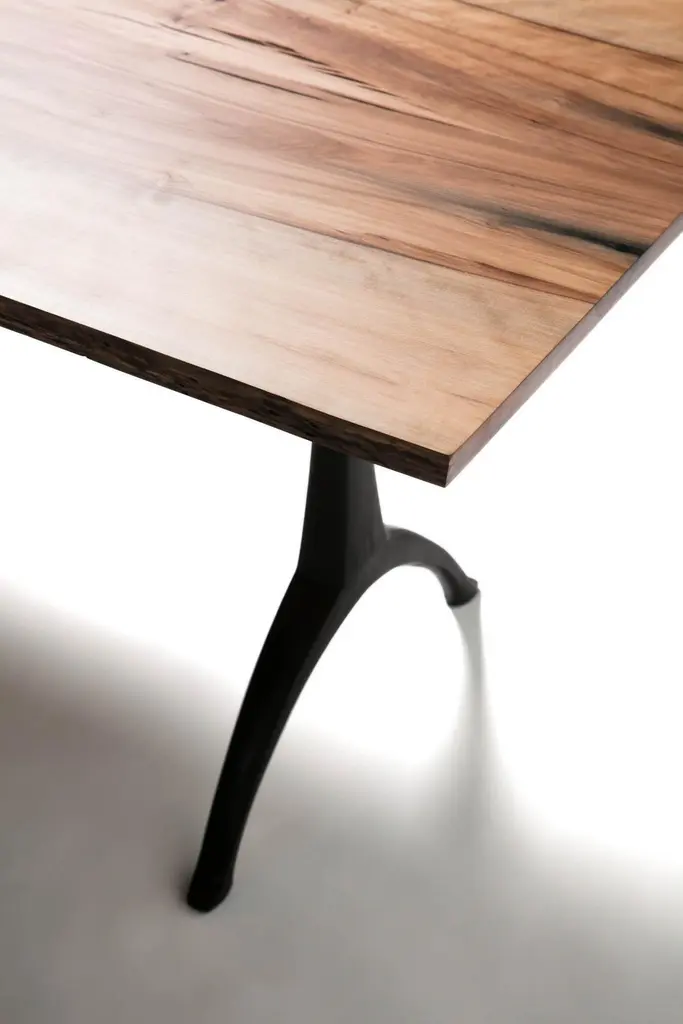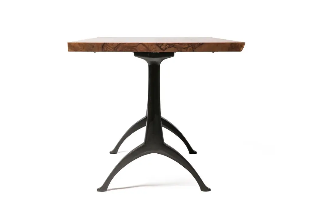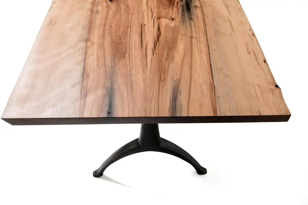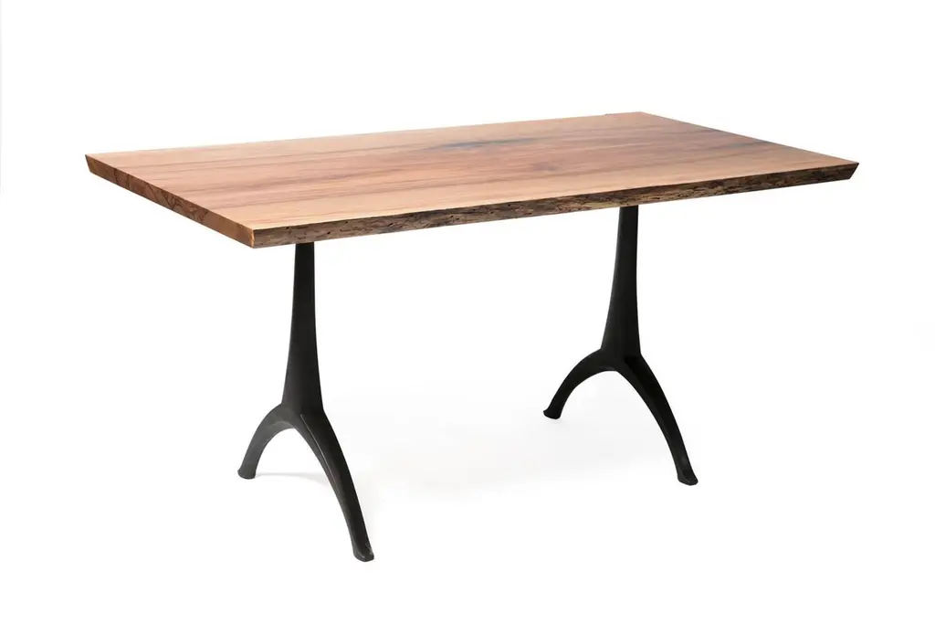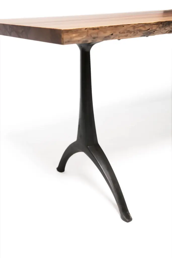 Our live edge dining table features the natural curves of this item's original form, a living tree! This beautiful piece of woodworking sits atop our iron Legacy Wishbone Base, hand designed and cast at Sloss Furnaces National Historic Landmark in our home town of Birmingham. Combining both modern and traditional production technologies, this marriage results in an iconic pairing of clean design and environmentally responsible natural materials. Selected by Garden & Gun magazine as the Overall Winner for their Best in the South awards in 2017, and simultaneously rugged yet chic, this table is the perfect statement piece for your dining room. Pictured here in a pure oil finish. The legs of the base stand 22.5" apart.A field-to-studio company, Alabama Sawyer repurposes the finest wood species, reclaimed from our local urban forests, to create one of a kind furniture pieces and accessories for the home or business.Urban wood has character. Character can include variations in color and grain, small pin knots, evidence of historical intrusion. There may be cracks or knots that we fill, patch or join in a considered and artful way at the makers discretion. We look at every slab and decide what needs a patch or epoxy or both. Case by case, one may be more effective and better for the furniture, aesthetically, structurally, and for our process. If a specific tool, like a patch, is not desired, please specify this when ordering. This may require procuring different lumber which can alter costs.
