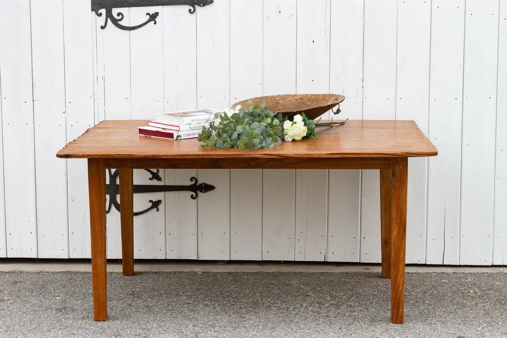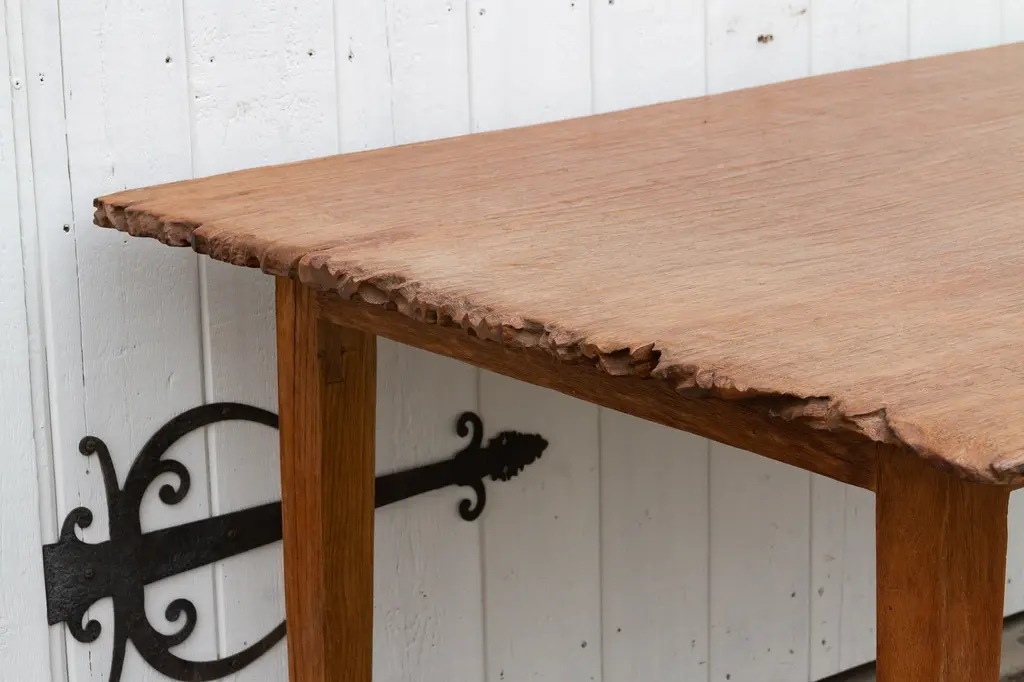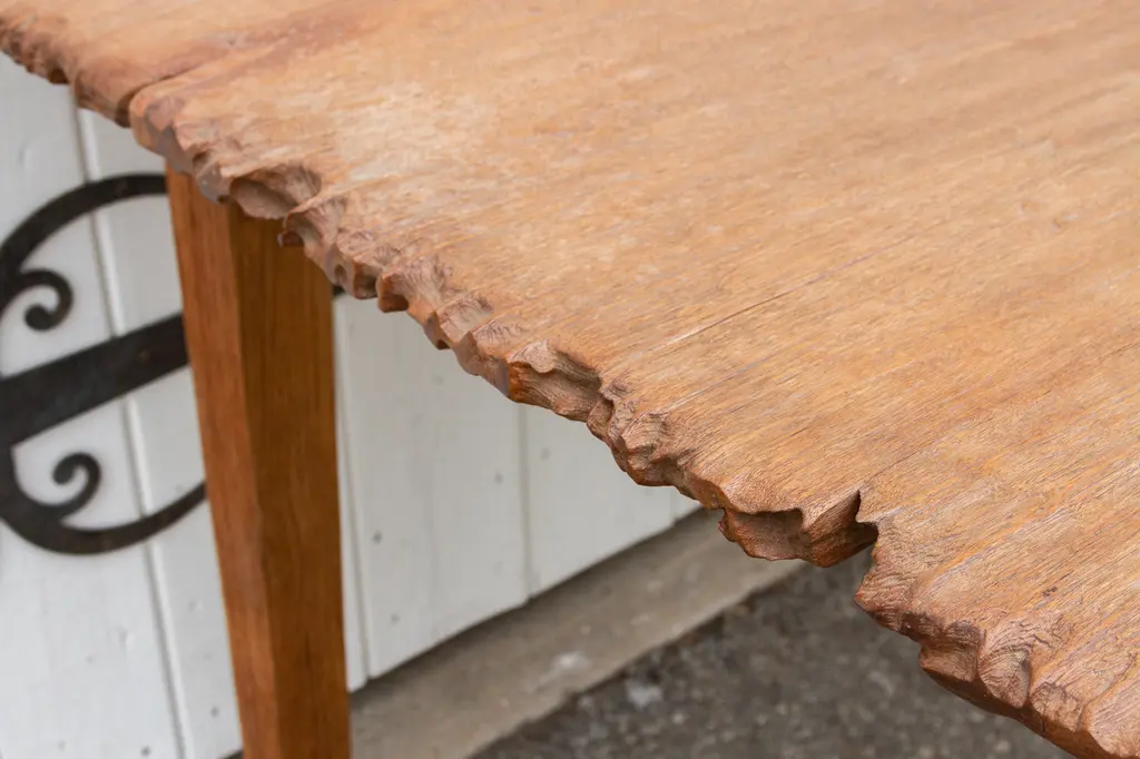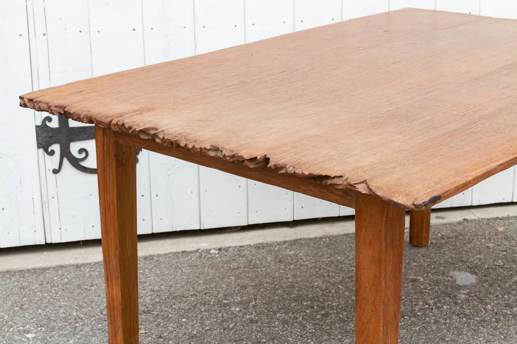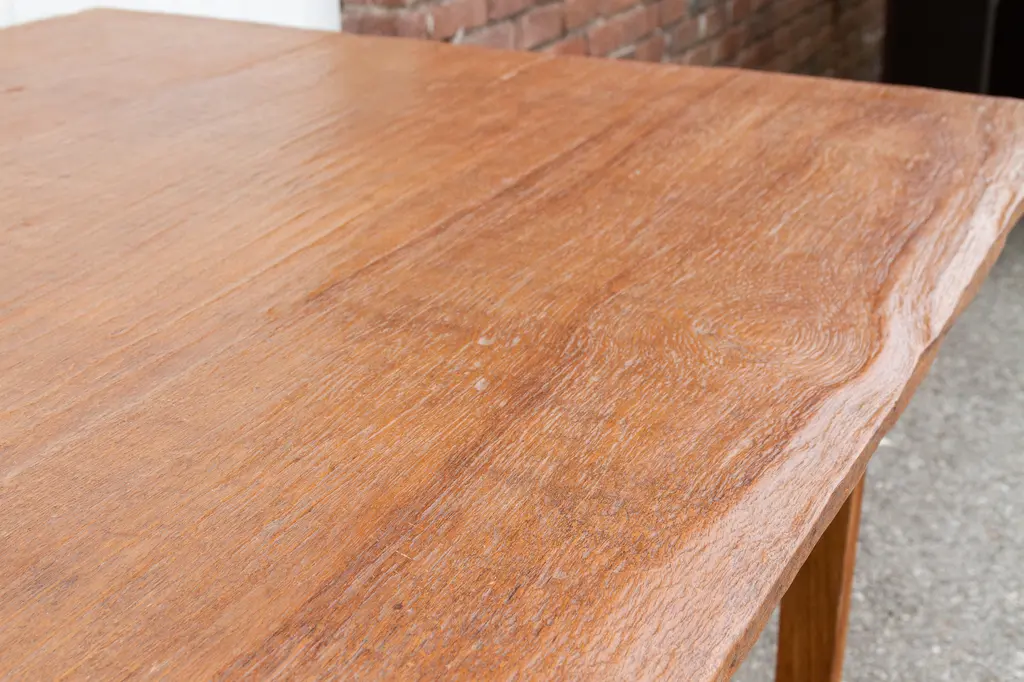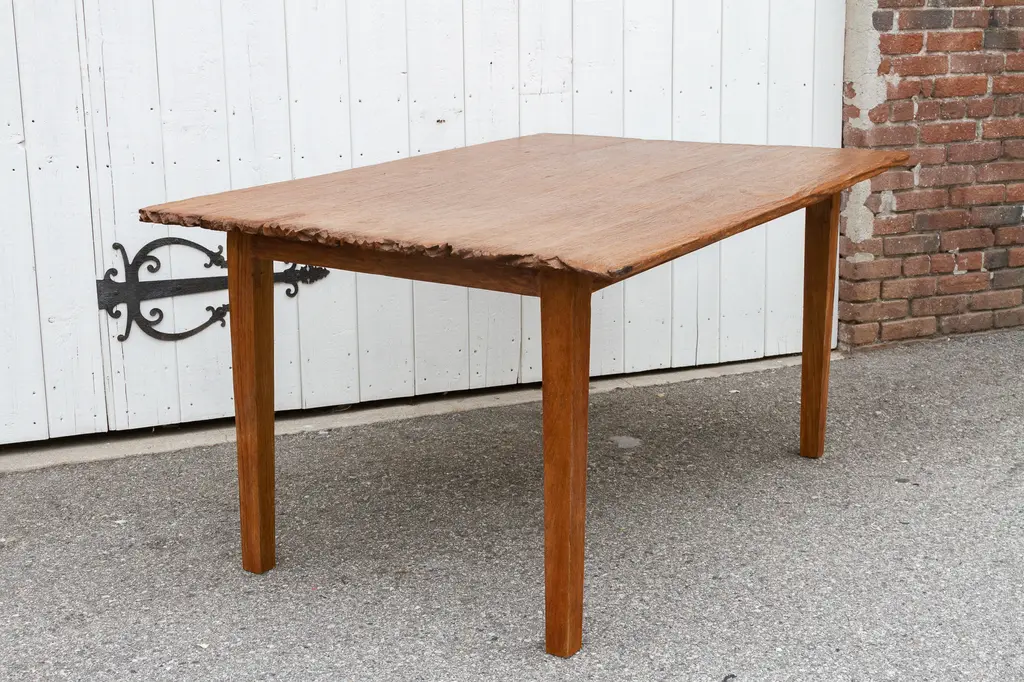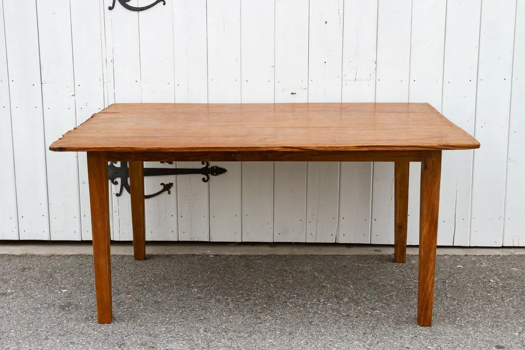 Rustic live edge teak table. This dining table sits on four straight legs and features a thick single teak wood top with a natural texture and gorgeous natural eroded ends on one side. With a wabi sabi appeal this table would add a lovely natural and rustic charm to any home. Suitable for outdoor use. Please note, it does not have an outdoor grade sealer so if the table is exposed to the outdoor elements there will be oxidation and age marks showing on the wood.