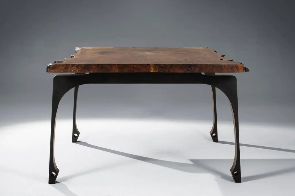 The Gladstone dining table is made of a unique solid claro walnut book matched live edge top with blackened steel legs with solid wood accents. This organic modern piece is very unique and is made using the highest of quality craftsmanship, materials, and finishes to enhance the natural beauty of the claro walnut live edge slab.This is a made to order item &Custom sizing and materials options are available upon request.