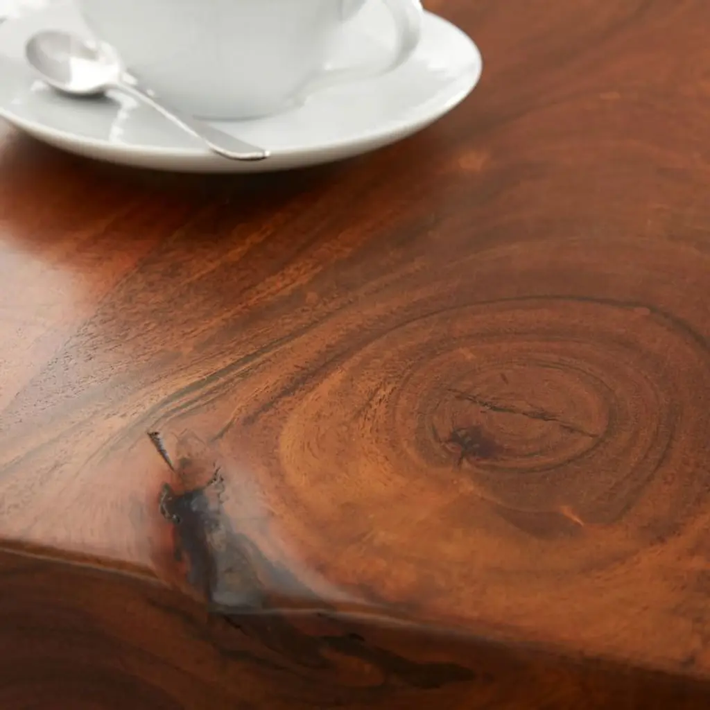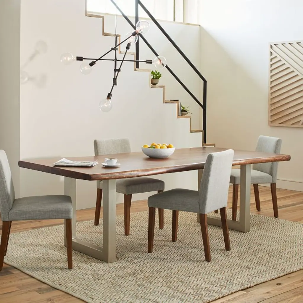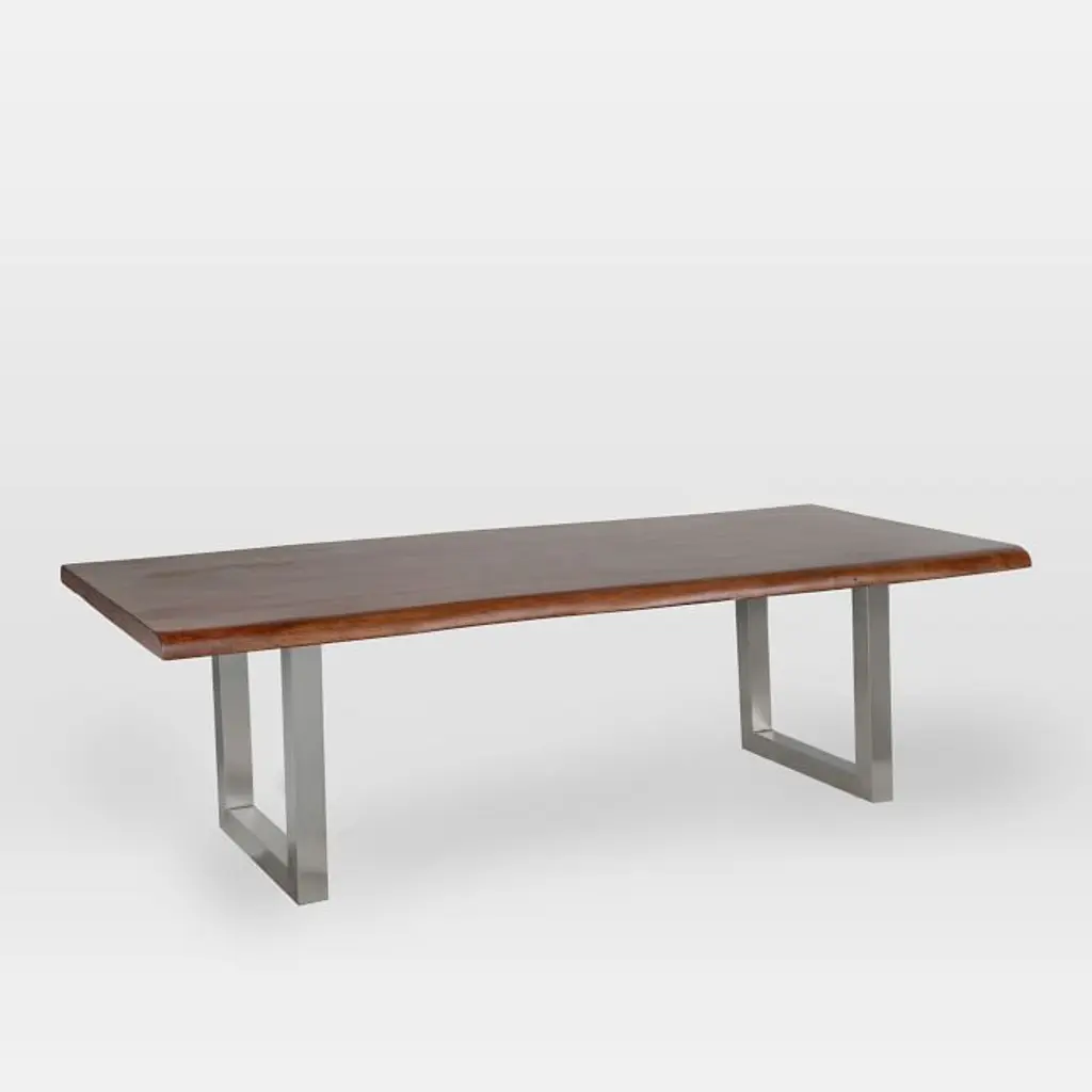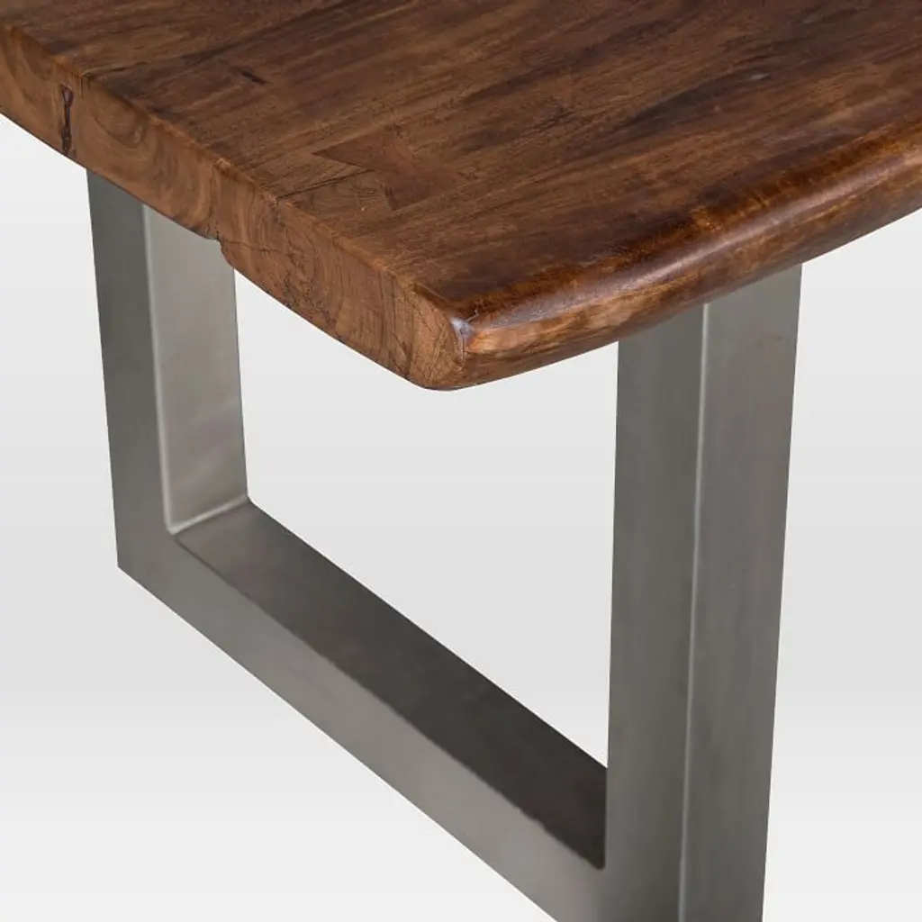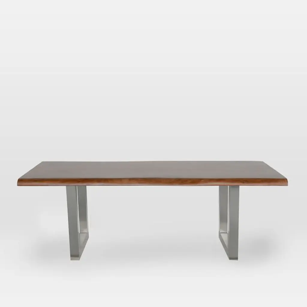 Made from solid acacia wood and iron, our Live Edge Wood Dining Table is hand-sanded, finished and sealed with lacquer to preserve its raw edge and rustic wood grain. Thanks to natural variations and the handcrafting process, each table's beautifully-finished wood is one-of-a-kind. Acacia wood top in a Light Walnut finish. Iron base in a Nickel finish. Due to the materials and handcrafted process, variations in shape and wood grain are to be expected. Made in China. Make sure it fits! See our guide on measuring for delivery.