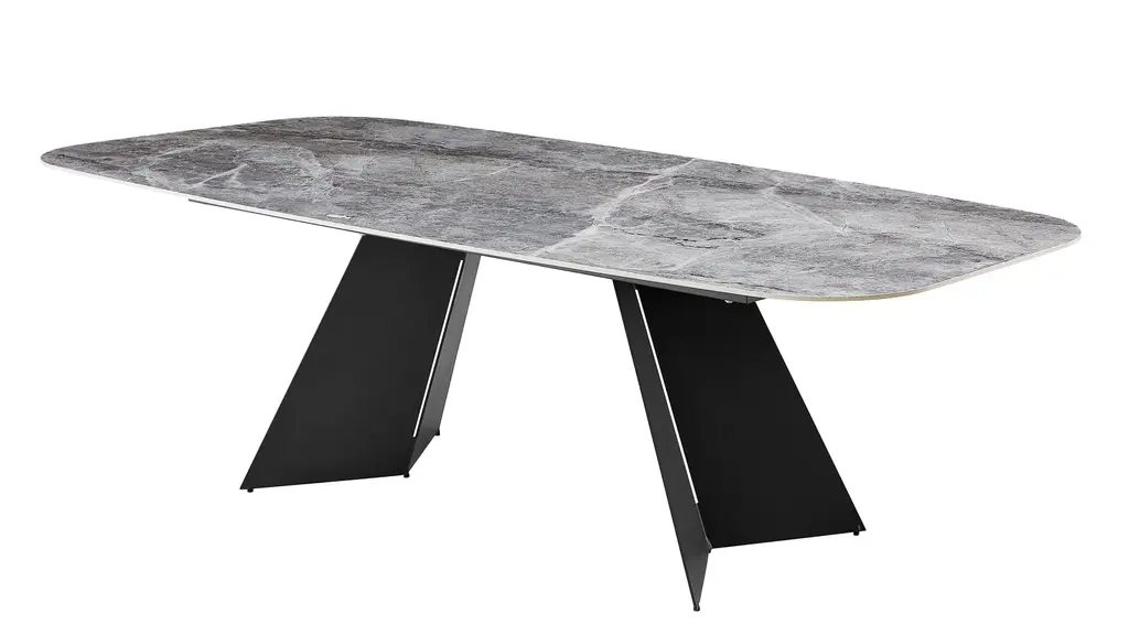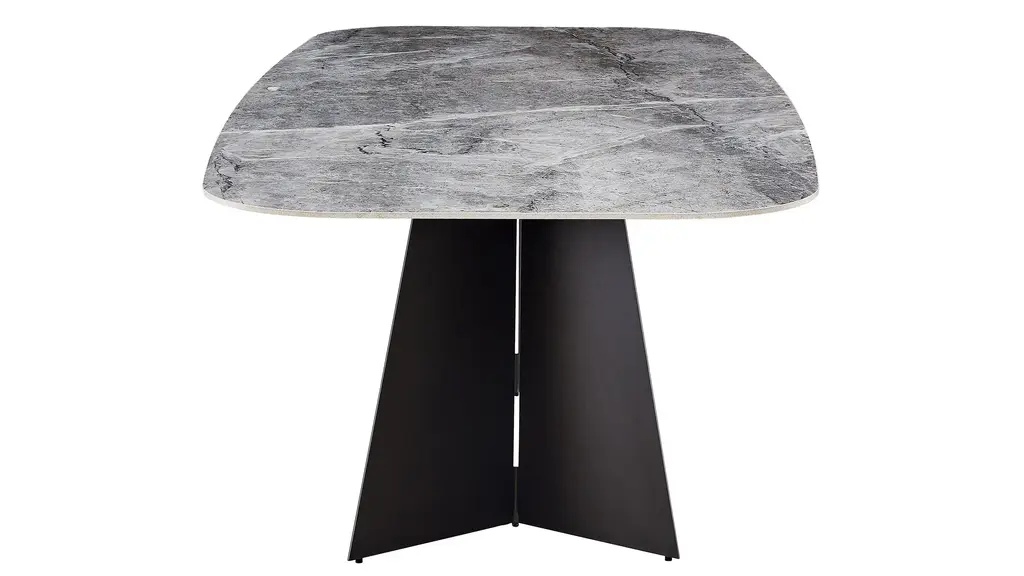 The Lizarte Dining Table unites sleek, modern lines with stunning, classic style. The wide table top with rounded corners, made of gray ceramic in a marble pattern. The base and frame, made of matte black solid steel, provide a striking and elegant silhouette. A true mix of modern with functionality.