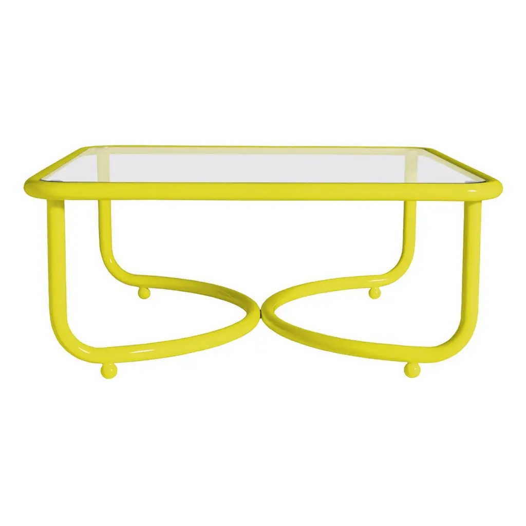 Colorful, eclectic and contemporary, this dining table from Gae Aulenti's 1964 Locus Solus Collection features a tubular steel frame finished in a bright yellow color. Adding a dynamic movement to the linear silhouette, the legs form two elegant curves visible through the extra-light tempered glass top. If the products are placed completely outside, nightcovers that can be purchased at an extra price are recommended. Please contact the Concierge for further information and options.