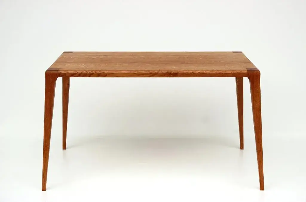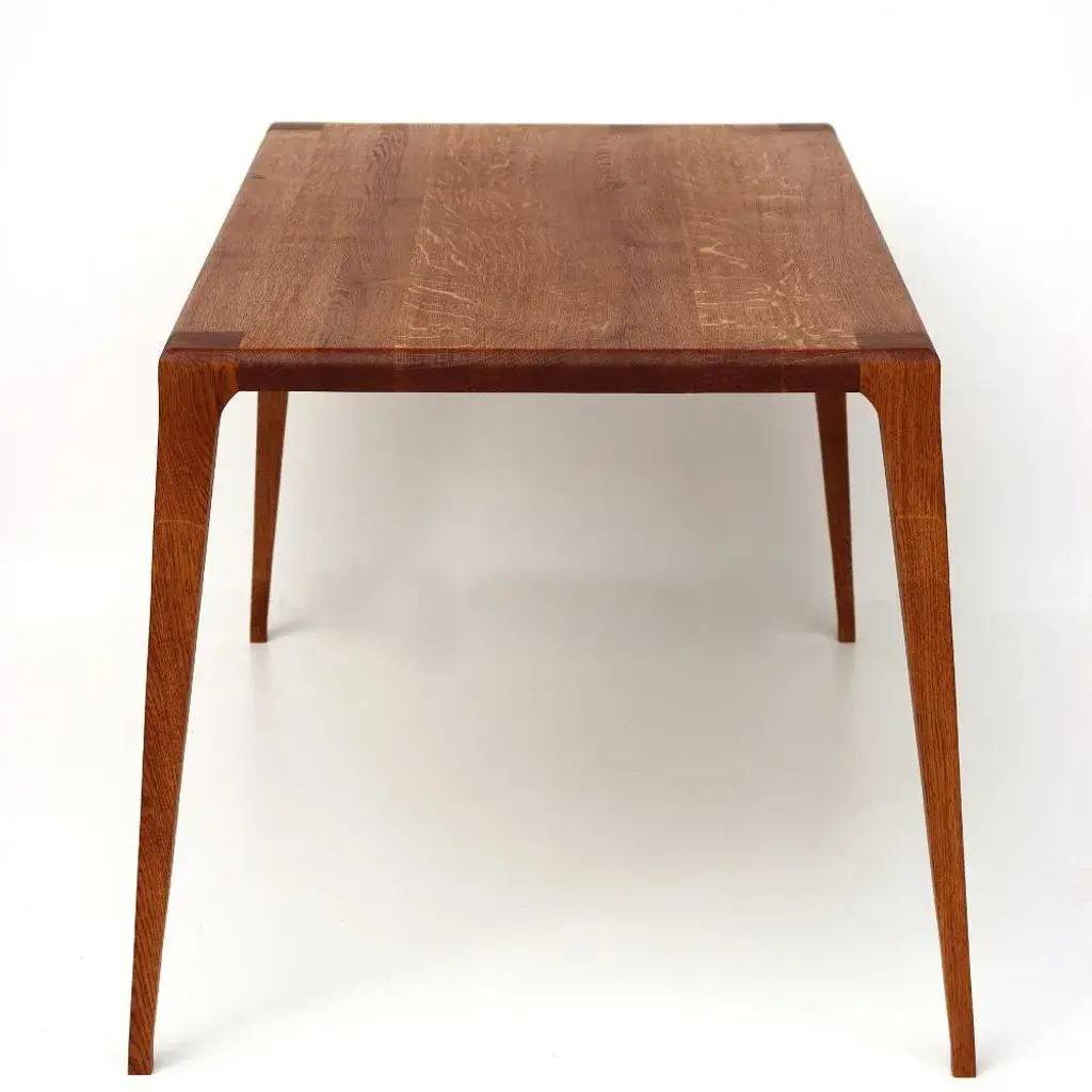 The table is the evolution of the 'Lohora armchair'. Sufficient availability, local roots, patient longevity and a characteristic style are the characteristics that determine the material selection. The tabletop is spread out on the underside with flush-mounted ridge strips made of oak to protect the flat surface from distortions. The surface treatment is carried out with a hard wax oil from organic production. The tinted hard wax oil further enhances the character of the oak and gives it warmth.