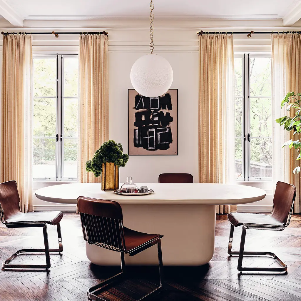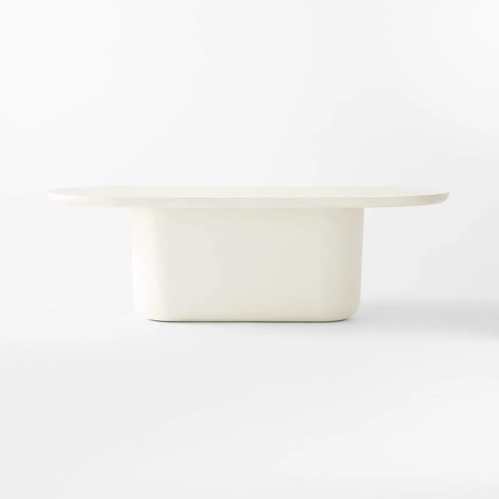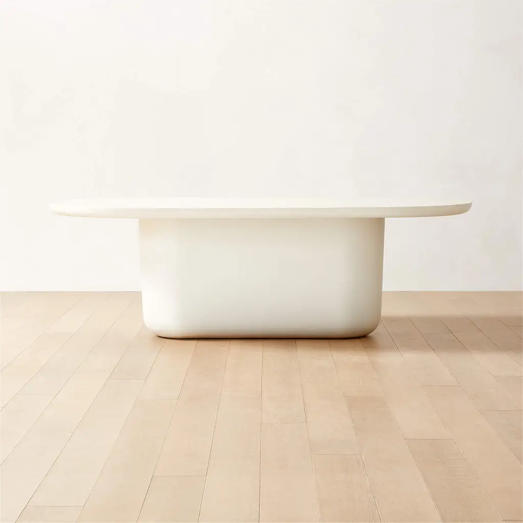 Simple in form and materiality, Mermelada Estudio's cement dining table features a hefty, plump base beneath a clean oval top. The elongated, dramatic silhouette has remarkable scale and striking contours. Accommodates up to eight at your next dinner party. CB2 exclusive.