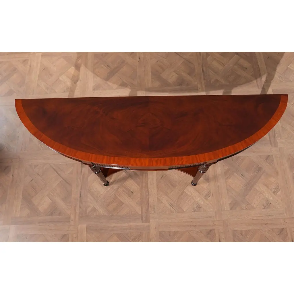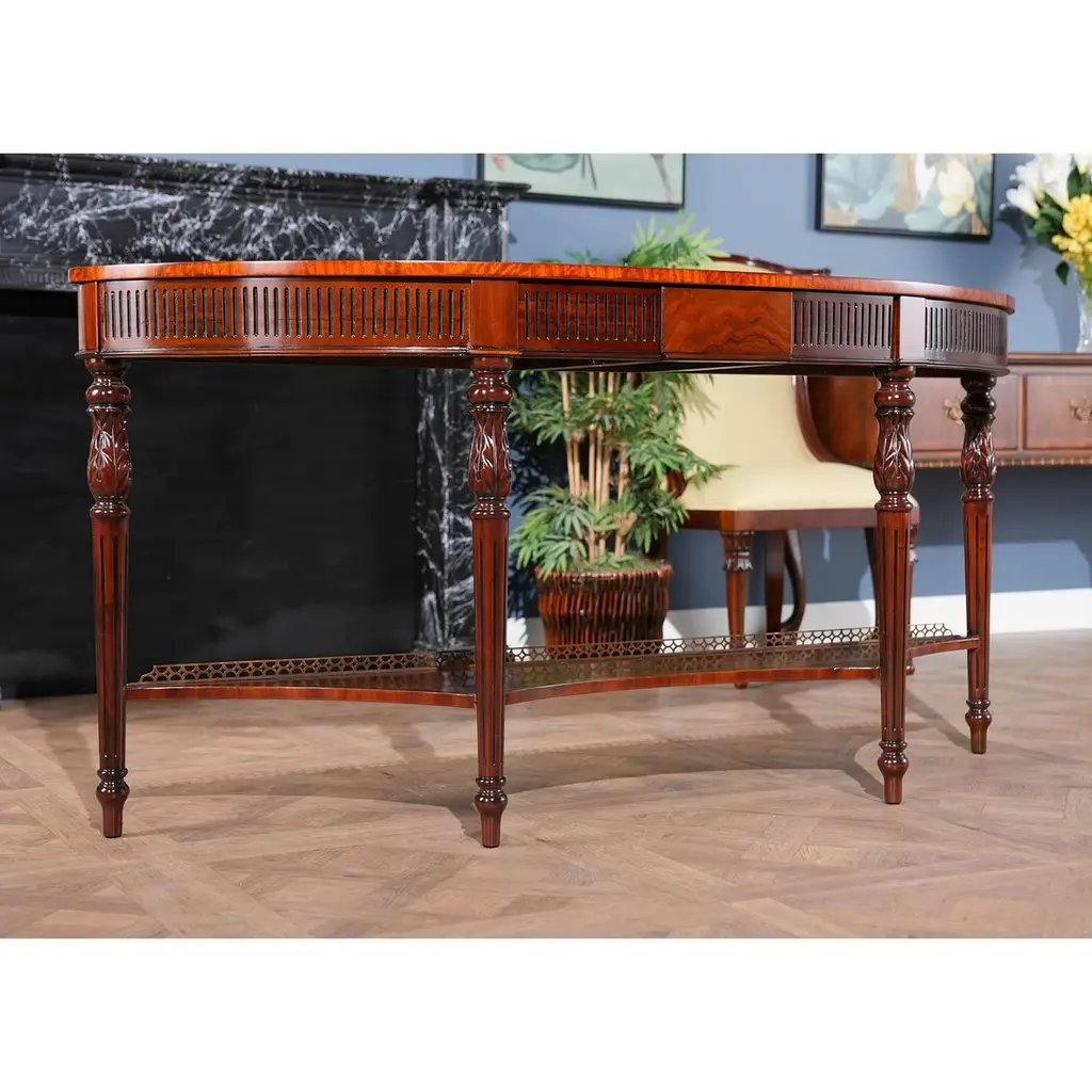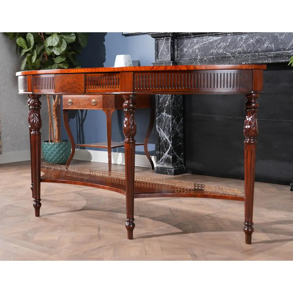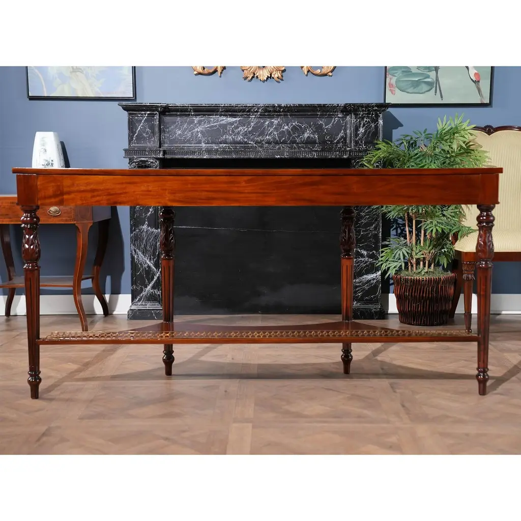 An outstanding, high quality Long Mahogany Console by Niagara Furniture. The Long Mahogany Console with Brass Gallery also makes elaborate use of inlays, carvings and trim. The mahogany top is banded with satinwood, the four legs are made from plantation grown solid mahogany and each leg features gorgeous acanthus and reeded carvings, all done by master craftsmen, all done by hand. The center of the table also contains a small drawer. This Long Mahogany Console table is the perfect size for use in a large front hallway, a dining room or any space that requires a decorative and functional object of beauty.Measures 69″w x 18″d x 33″h metric 175 46 84