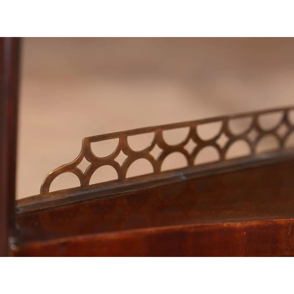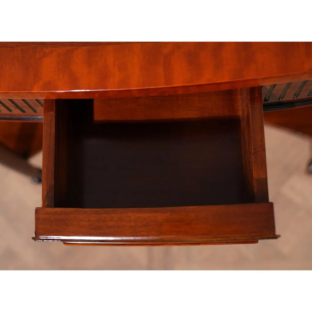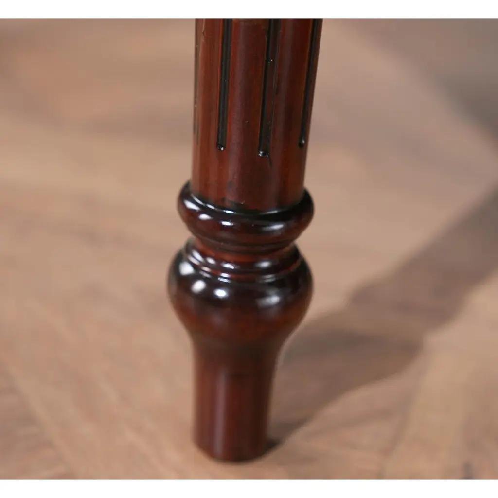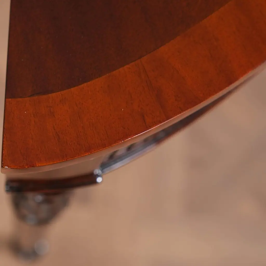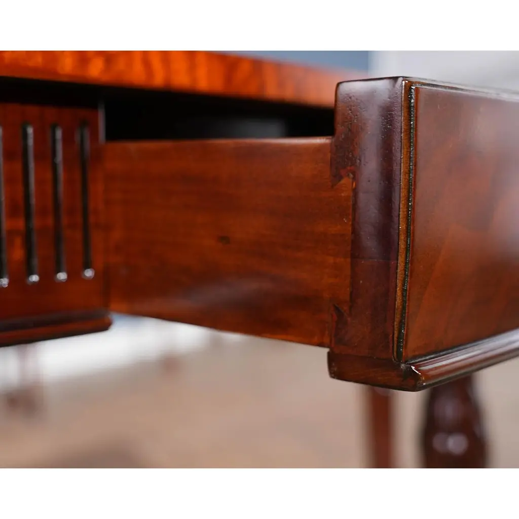 An outstanding, high quality Long Mahogany Console by Niagara Furniture. The Long Mahogany Console with Brass Gallery also makes elaborate use of inlays, carvings and trim. The mahogany top is banded with satinwood, the four legs are made from plantation grown solid mahogany and each leg features gorgeous acanthus and reeded carvings, all done by master craftsmen, all done by hand. The center of the table also contains a small drawer. This Long Mahogany Console table is the perfect size for use in a large front hallway, a dining room or any space that requires a decorative and functional object of beauty.Measures 69″w x 18″d x 33″h metric 175 46 84
