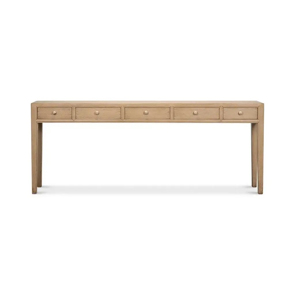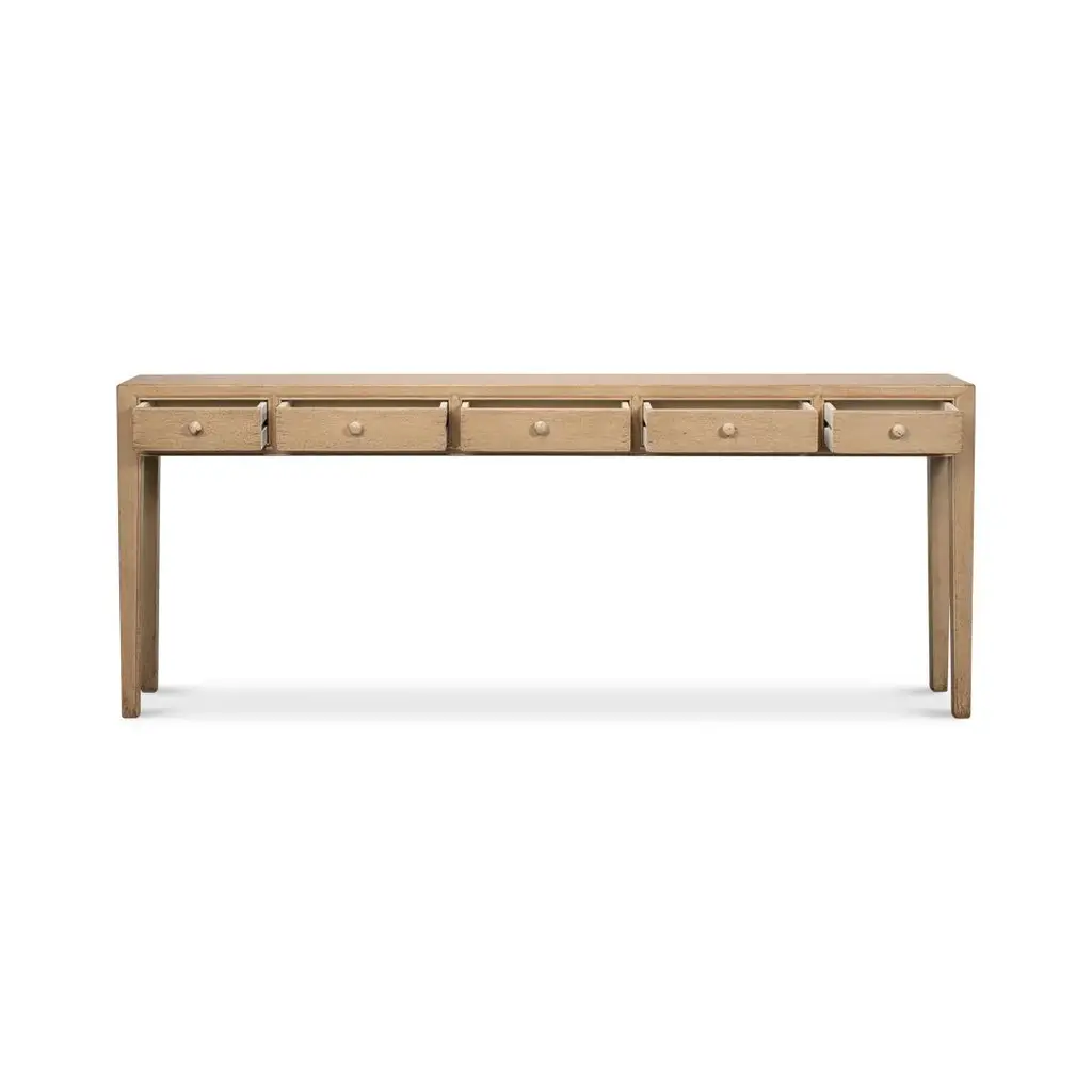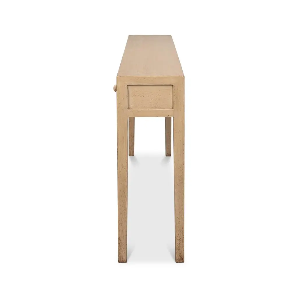 Console table with drawers combines elegant simplicity with practical design, making it an ideal piece for entryways, dining rooms, or hallways. Hand-painted in a soft Ivory Country finish, this console features a slim silhouette that adds understated charm without overwhelming a space. Its five drawers provide versatile storage for essentials, blending form and function seamlessly. Crafted with clean lines and timeless proportions, the table reflects transitional style—balancing modern minimalism with traditional warmth. The narrow depth makes it perfect for smaller spaces, while the elongated length ensures a commanding presence. Both functional and decorative, this piece adds sophistication and everyday utility to any interior. Dimensions: 86" W x 11" D x 34" H