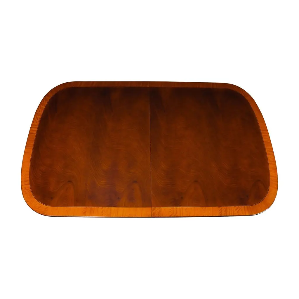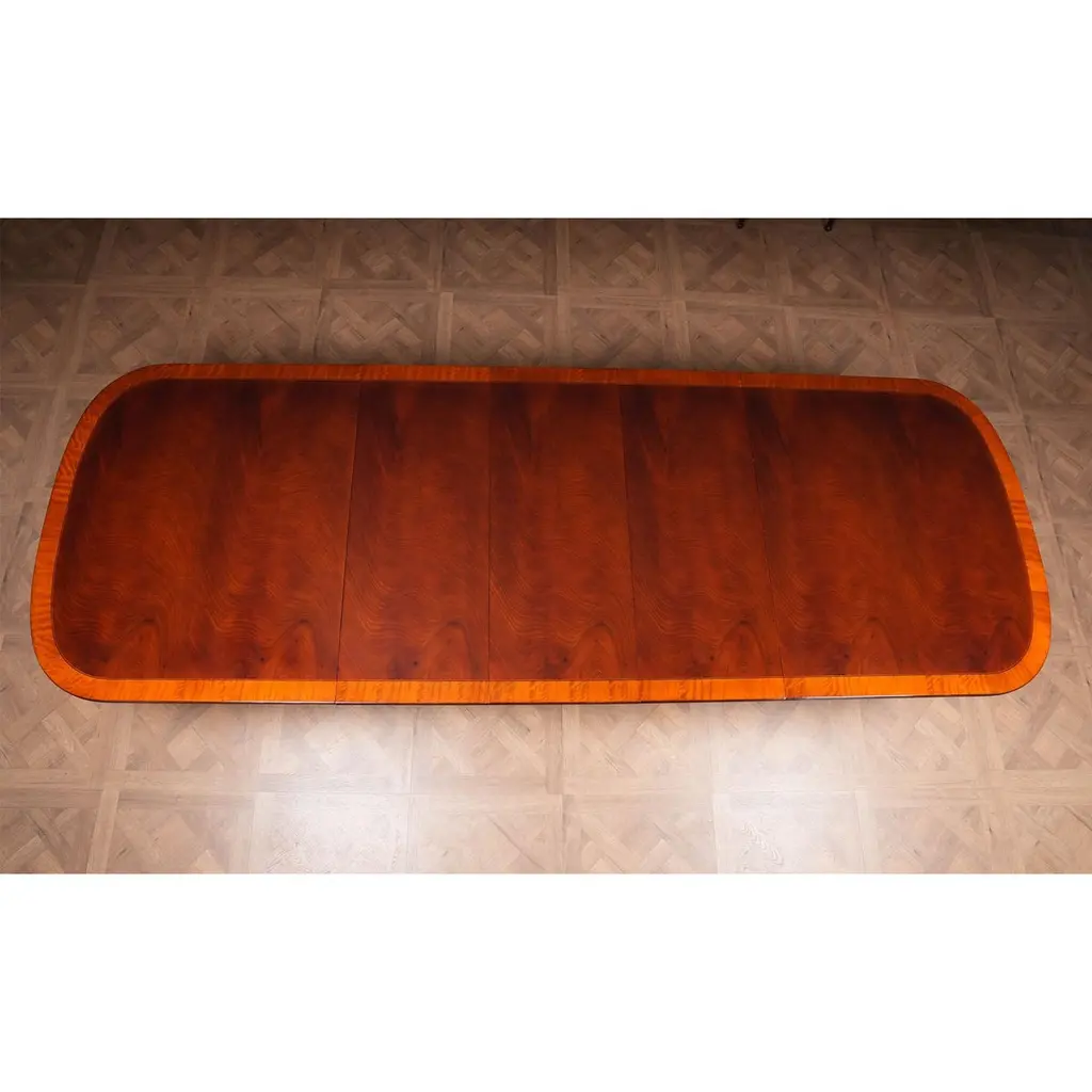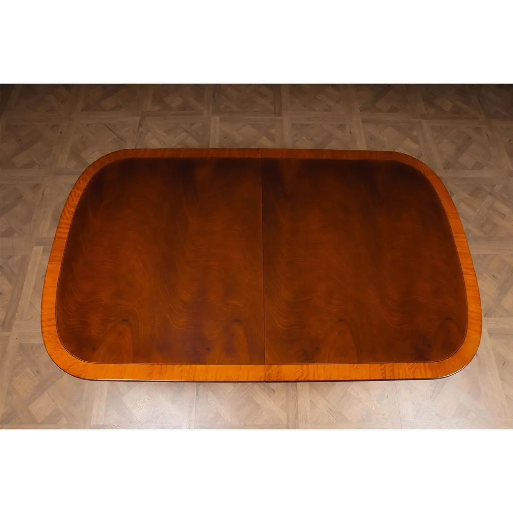 This is the interpretation of a Long Regency Mahogany Dining Table with gold leaf accents on the table bases. The two pillared and paw footed solid mahogany pedestals create a stunning effect highlighted with gold leaf accents while the top is restrained and elegant. A fine quality apron supports the top of the Regency Mahogany Dining Table and works to conceal the American made metal rails which support the table when being opened and closed. A reeded solid mahogany edge surrounds the entire table top. The top of our Regency Dining Table is produced from the finest figural mahogany veneers and it is satinwood banded in its’ entirety. A perfect size for entertaining various sized groups ranging up to twelve people.Stock Photo for reference only. We take every measure to ensure that all of our dining tables are created to the highest standard using materials of similar quality but each table will appear slightly different due to the use of naturally occurring materials such as wood in the creation of our products.Measures 48″W x 79″L – 138″L x 31″H metric: 122 x 200-350 x 79