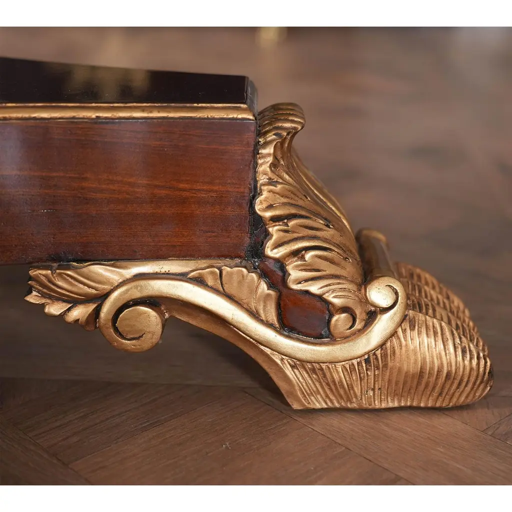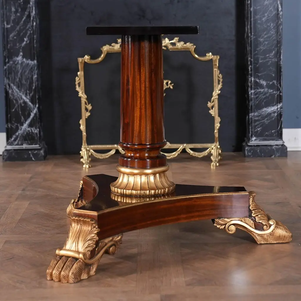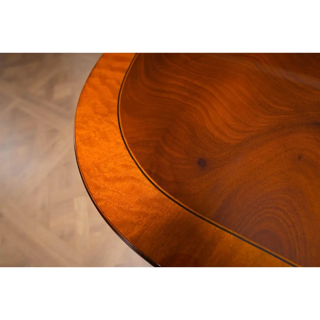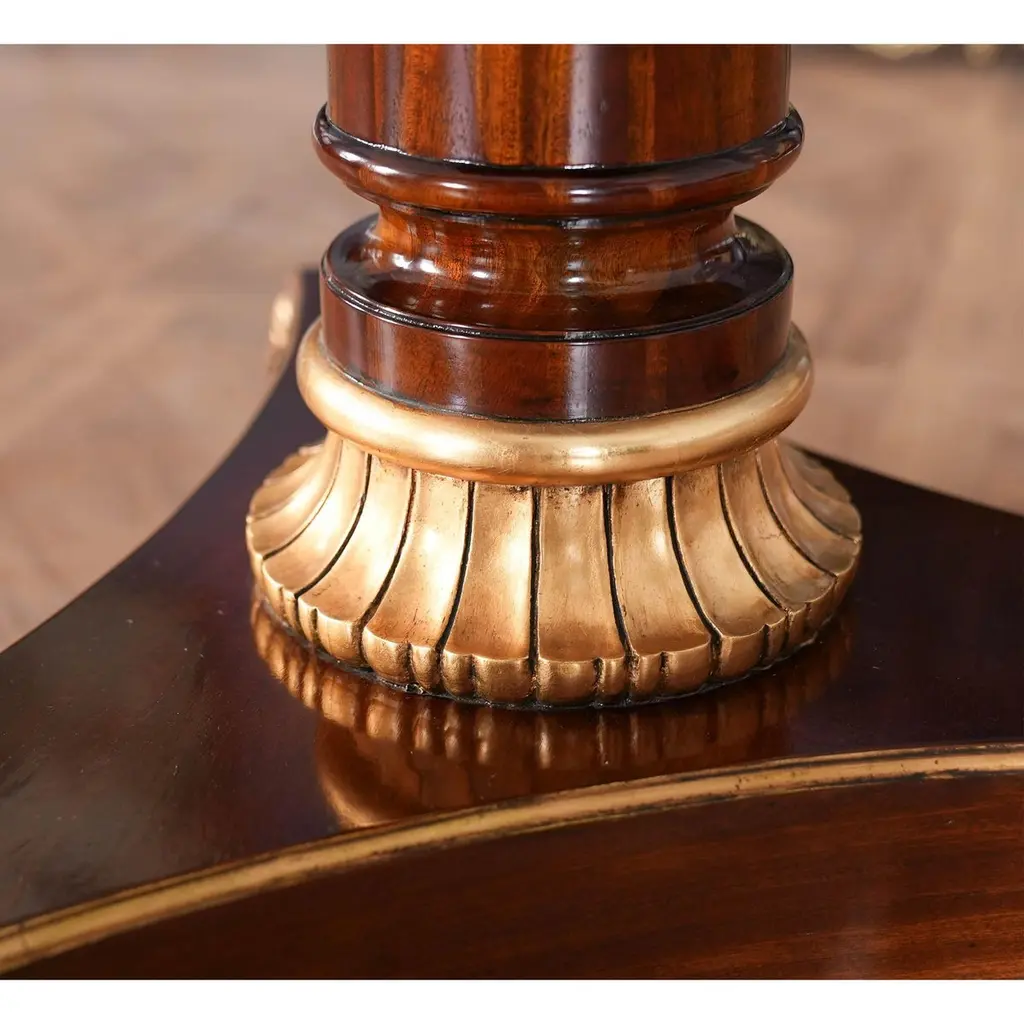 This is the interpretation of a Long Regency Mahogany Dining Table with gold leaf accents on the table bases. The two pillared and paw footed solid mahogany pedestals create a stunning effect highlighted with gold leaf accents while the top is restrained and elegant. A fine quality apron supports the top of the Regency Mahogany Dining Table and works to conceal the American made metal rails which support the table when being opened and closed. A reeded solid mahogany edge surrounds the entire table top. The top of our Regency Dining Table is produced from the finest figural mahogany veneers and it is satinwood banded in its’ entirety. A perfect size for entertaining various sized groups ranging up to twelve people.Stock Photo for reference only. We take every measure to ensure that all of our dining tables are created to the highest standard using materials of similar quality but each table will appear slightly different due to the use of naturally occurring materials such as wood in the creation of our products.Measures 48″W x 79″L – 138″L x 31″H metric: 122 x 200-350 x 79