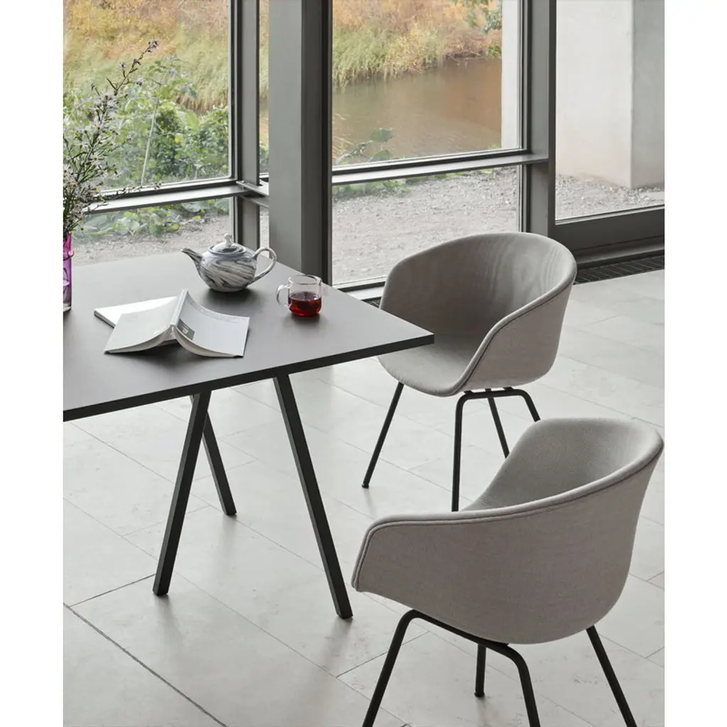 HAY's Loop Stand table features a rectangular, linoleum-coated tabletop resting on slender metal trestle legs. This capacious trestle table is ideal as a dining table, desk or meeting room table, infusing the space with a blend of natural Nordic style and a minimalist touch drawn from industrial esthetics. The Loop Stand collection is based on the modern, three-legged version of a traditional trestle. Leif Jørgensen designed the Loop Stand collection originally for the Storm lifestyle and fashion store in Copenhagen, and its simple and elegant design has found its place in numerous homes, offices and public spaces around the world.