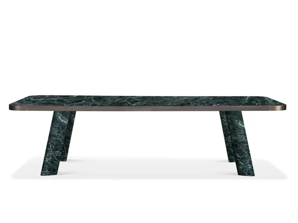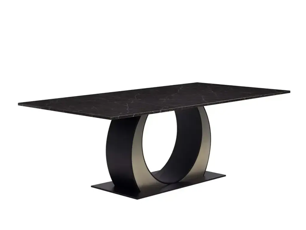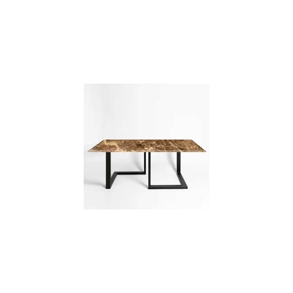 A superb showcase of craftsmanship enhanced with the natural charm of marble, this exquisite dining table boasts bright gold and brown veining that will add a timeless sense of elegance to a contemporary interior. Fashioned of Marron emperor marble, the striking top rests on a highly geometrical base handcrafted of black-lacquered iron. Entirely customizable, please consult the Concierge for options and details.