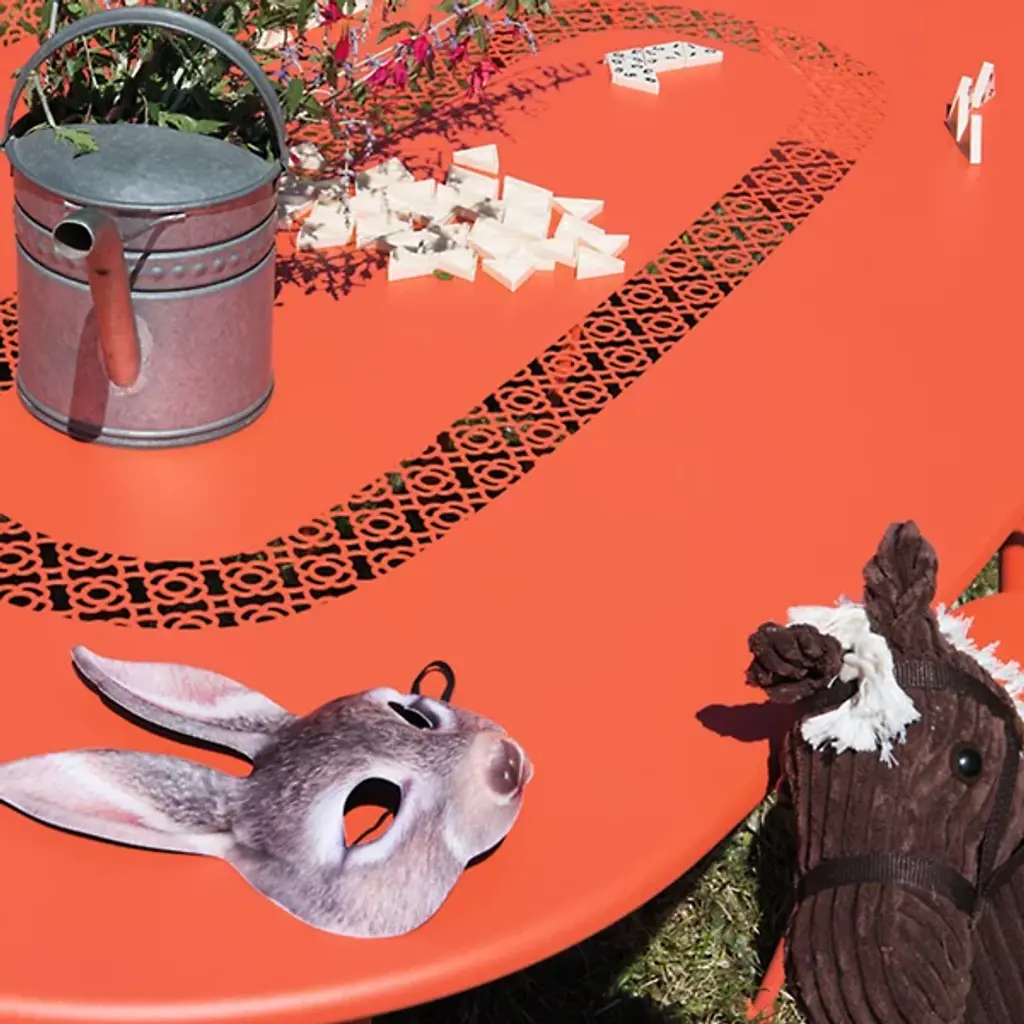 Modern design you wouldn't dare cover with a tablecloth. The Lorette Oval Table by Fermob is generously sized oblong table, with lacy laser-cut metalwork mirroring the shape...and definitely catching the eye. The open oval ring is ideally placed; food and decor at the center, as well as table settings around the outside, won't obscure the floral pattern from view. Neither will the otherwise simple, smooth surface of the remaining Steel top, nor the steel tube legs. Place this outdoor dining table on a patio or on the lawn, in exterior spaces large or small for a truly memorable outdoor dining experience.