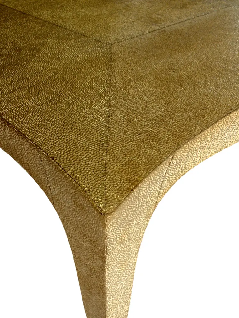 The renowned designer Paul Mathieu chose the name “Louise” when he created his more feminine version of Louis XV (1730-1760) furniture. The characteristic cabriole leg, curving outward at the knee and inward towards the foot in an "S" shape was born during this period. It is during the same era that English furniture makers produced the Queen Anne and Chippendale styles. The curved legs and side rails of this exceptionally elegant table are hand carved from solid pieces of teak. Pattern makers trace and cut complex forms that will cover the table from thick sheets of copper or silver. Once the table is joined together, it is meticulously encased in a tight-fitting skin of copper or purest silver. The silver used was assayed at 96% purity, which exceeds the minimum standard for sterling of 92.5%. Available options for the metal skins are White Bronze, Antiqued Bronze, Brass, SIlver and Copper. Both silver and copper will tarnish over time. Regular non-abrasive household metal polishes can be used to restore the original finish. Louise Dining Table in Hammered Brass Clad Over Teak woodSize- 72"x36"x30"H.Materials - Brass, Teak, Hand-CarvedPlease note that moisture in air, sudden change in temperature and natural movement of wood over time causes the metal to wrinkle or bubble up. We use well seasoned, reclaimed teak and high quality marine grade MDF (wherever technically possible) to avoid and delay the above mentioned changes. However a perfect stability of metal cannot be guaranteed.Please note that our smooth finish metal clad pieces will have some unavoidable tool marks. This is proof that everything is done by hand. The smooth finish will not come out like a machine made perfect surface and the master artisan will do their best to make it look as good/clean/stable/perfect as he possibly can. Our hammered finishes are a much safer option if the tool mark scratches are unacceptable. The hammered finishes are also safer against eventual bubbling/wrinkles due to natural forces as mentioned above. We would love to send you some samples before order confirmation so that the finish can be judged and experienced first hand.Buyer Cancellation-The cancellation charge is 25% which increases to 50% if the production is started.Prices do not include shipping from India (for custom orders) or our MN warehouse (items from stock). That will be additional.