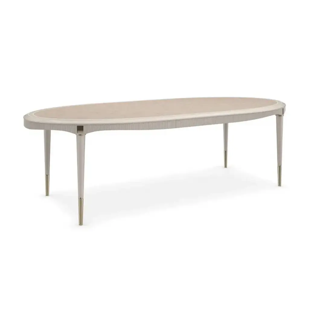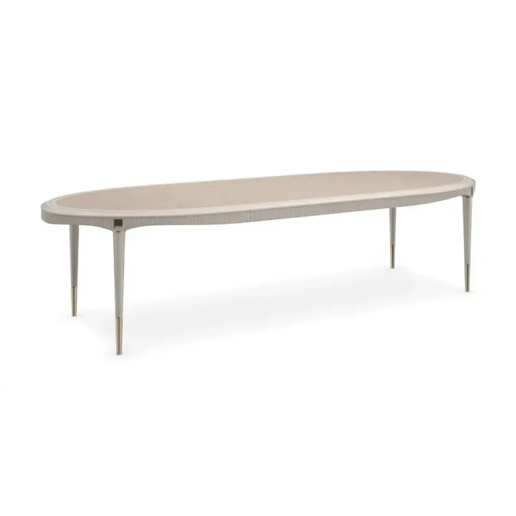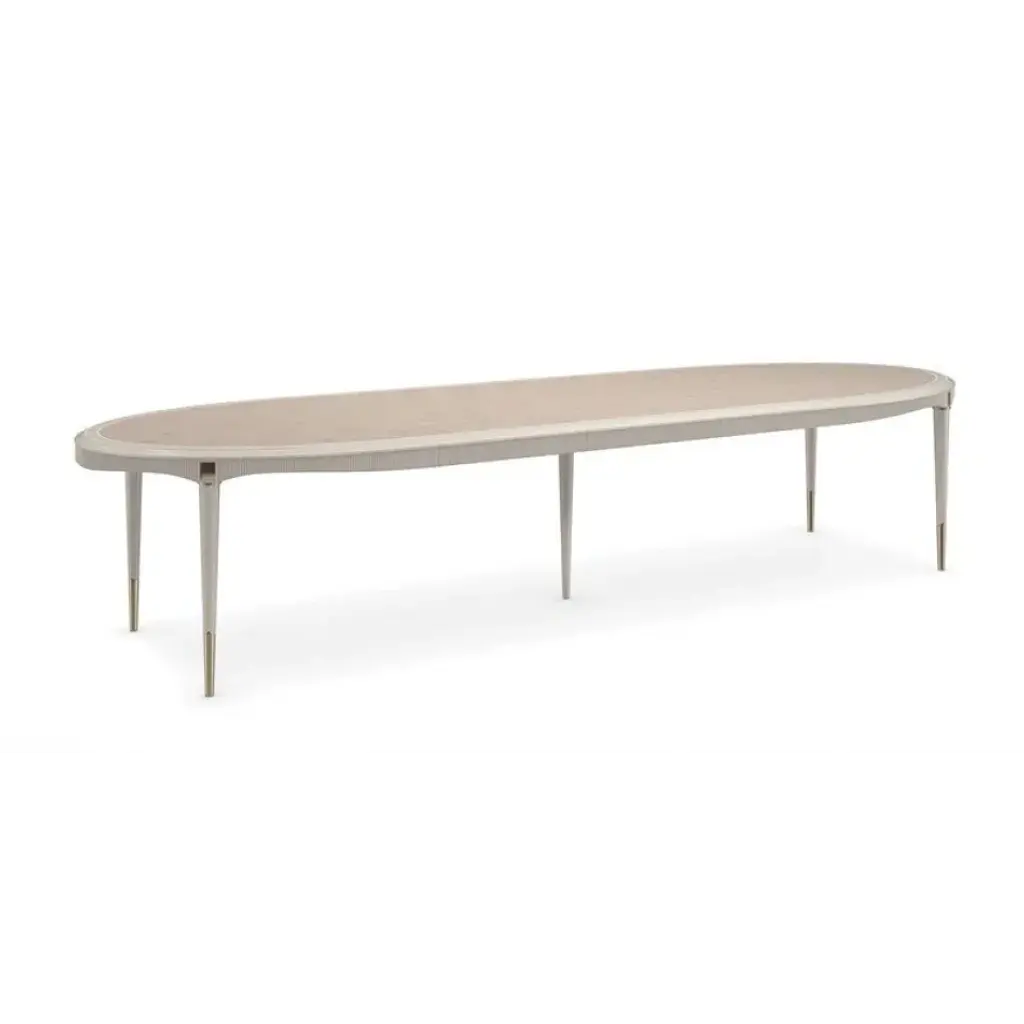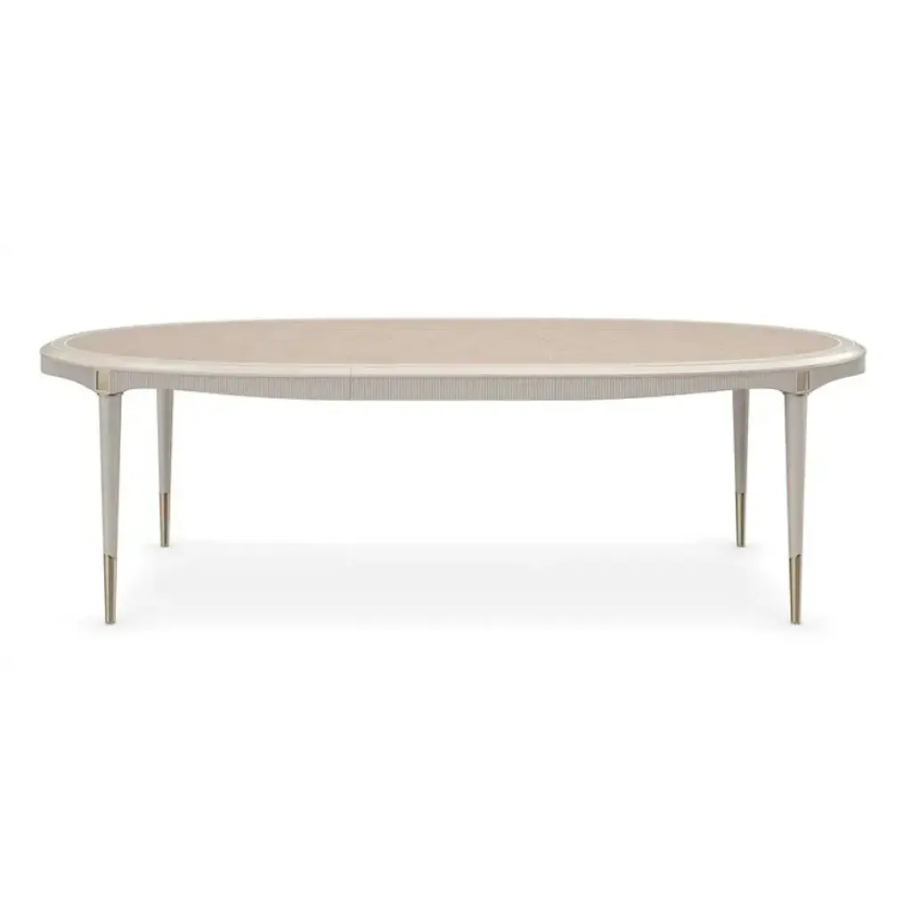 With an elegant oval shape accentuated by a gently flowing, reeded apron, this extension dining table celebrates attention to detail and functionality. Its expansive top is intricately crafted from pieced maple burl veneers, trimmed in a cream silkscreen banding to complement its Matte Pearl frame. Corner blocks add a distinctive finishing touch atop tapered round legs, capped in a Whisper of Gold metal ferrule to emulate the apron’s subtle curves. Comfortably seats 12 when fully extended.