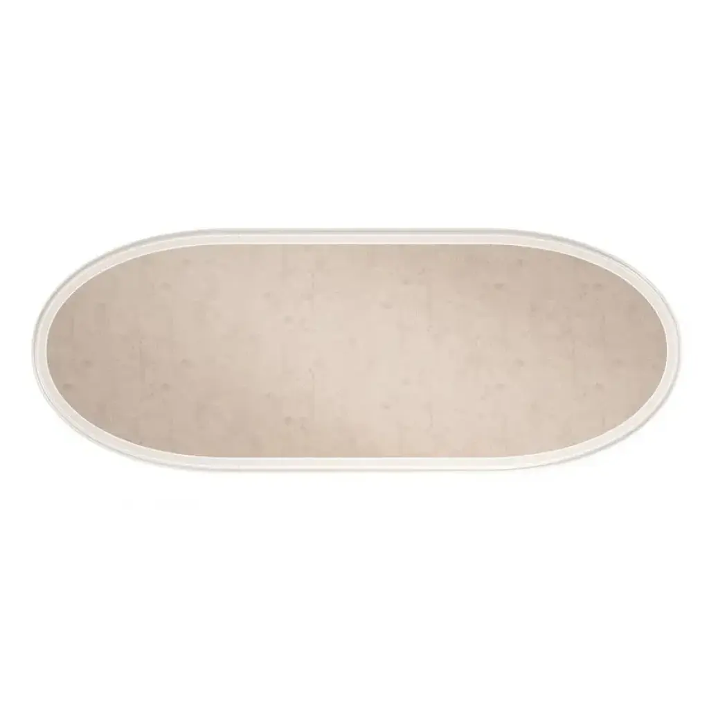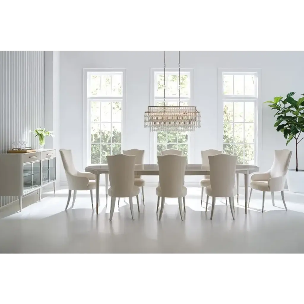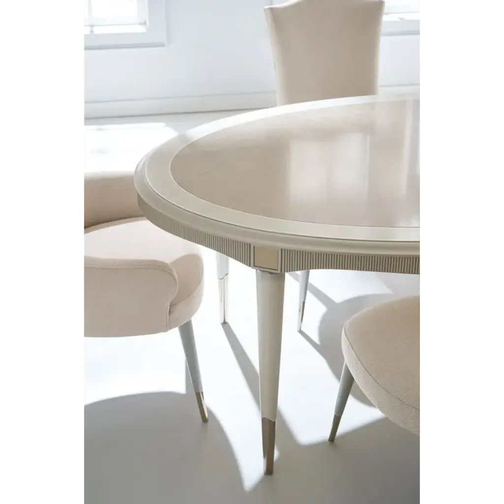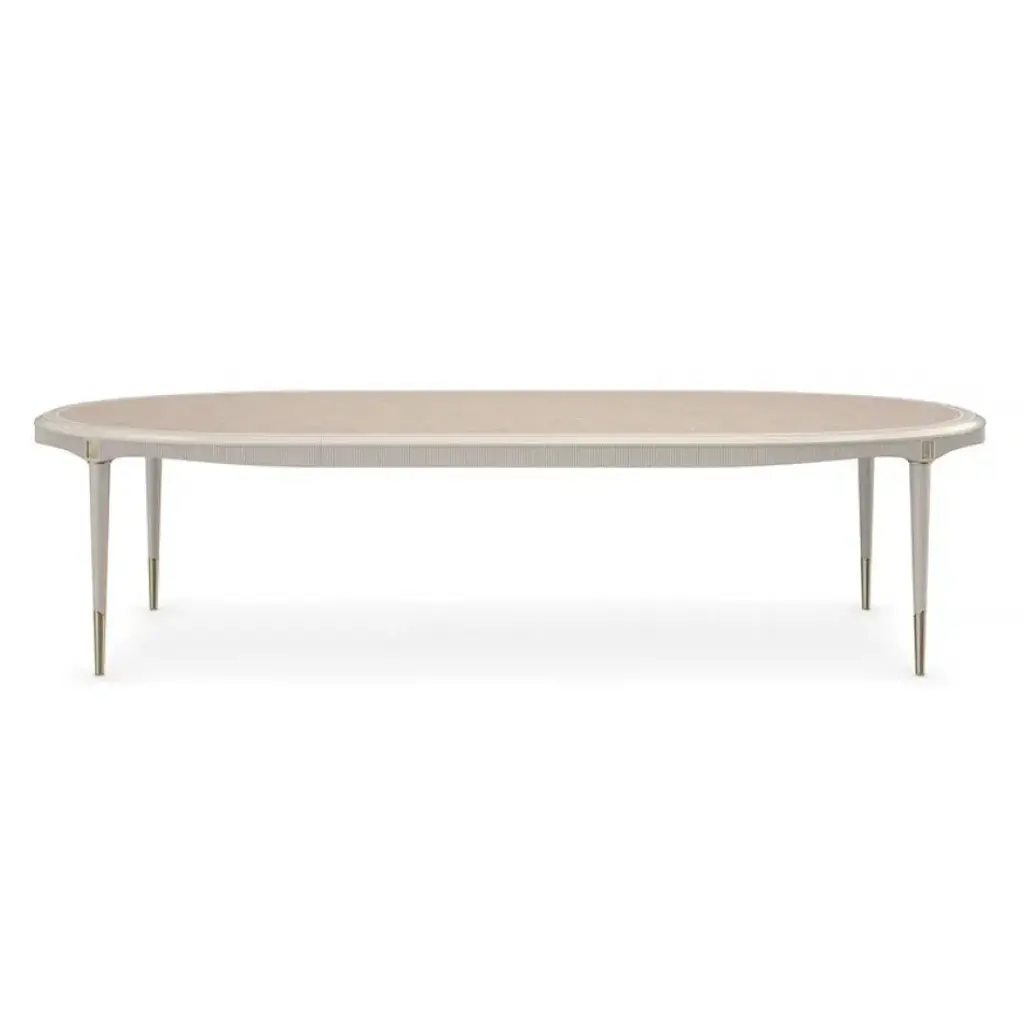 With an elegant oval shape accentuated by a gently flowing, reeded apron, this extension dining table celebrates attention to detail and functionality. Its expansive top is intricately crafted from pieced maple burl veneers, trimmed in a cream silkscreen banding to complement its Matte Pearl frame. Corner blocks add a distinctive finishing touch atop tapered round legs, capped in a Whisper of Gold metal ferrule to emulate the apron’s subtle curves. Comfortably seats 12 when fully extended.