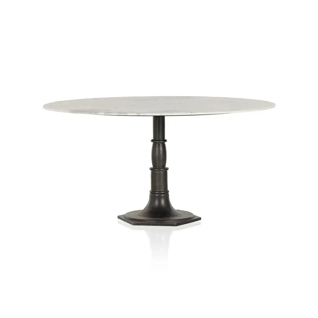 French industrial meets dining table. Beautifully detailed, 8-sided cast iron pedestal supports a dramatic white marble top with a bull-nosed edge. In Stock Early March 2026 In Stock Late January 2026 Cast iron pedestal base Marble top This image is for illustrative purposes only. The colors shown are accurate within the constraints of lighting, photography, and the color accuracy of your screen.
