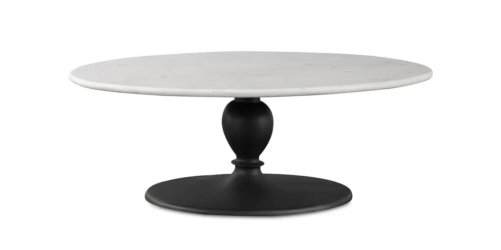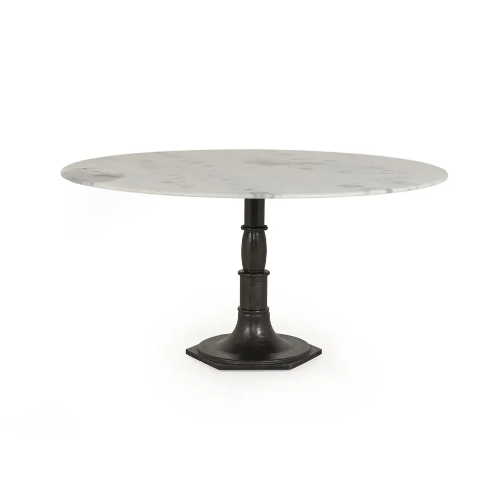 French industrial meets dining table. Beautifully detailed, 8-sided cast iron pedestal supports a dramatic white marble top with a bull-nosed edge. In Stock Early March 2026 In Stock Late January 2026 Cast iron pedestal base Marble top This image is for illustrative purposes only. The colors shown are accurate within the constraints of lighting, photography, and the color accuracy of your screen.