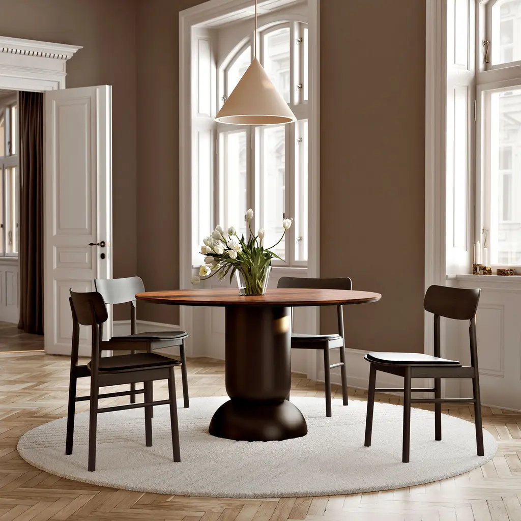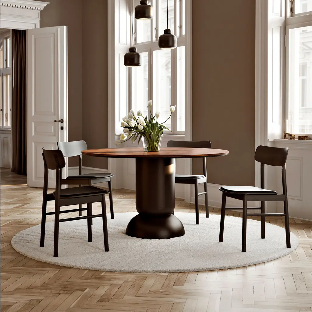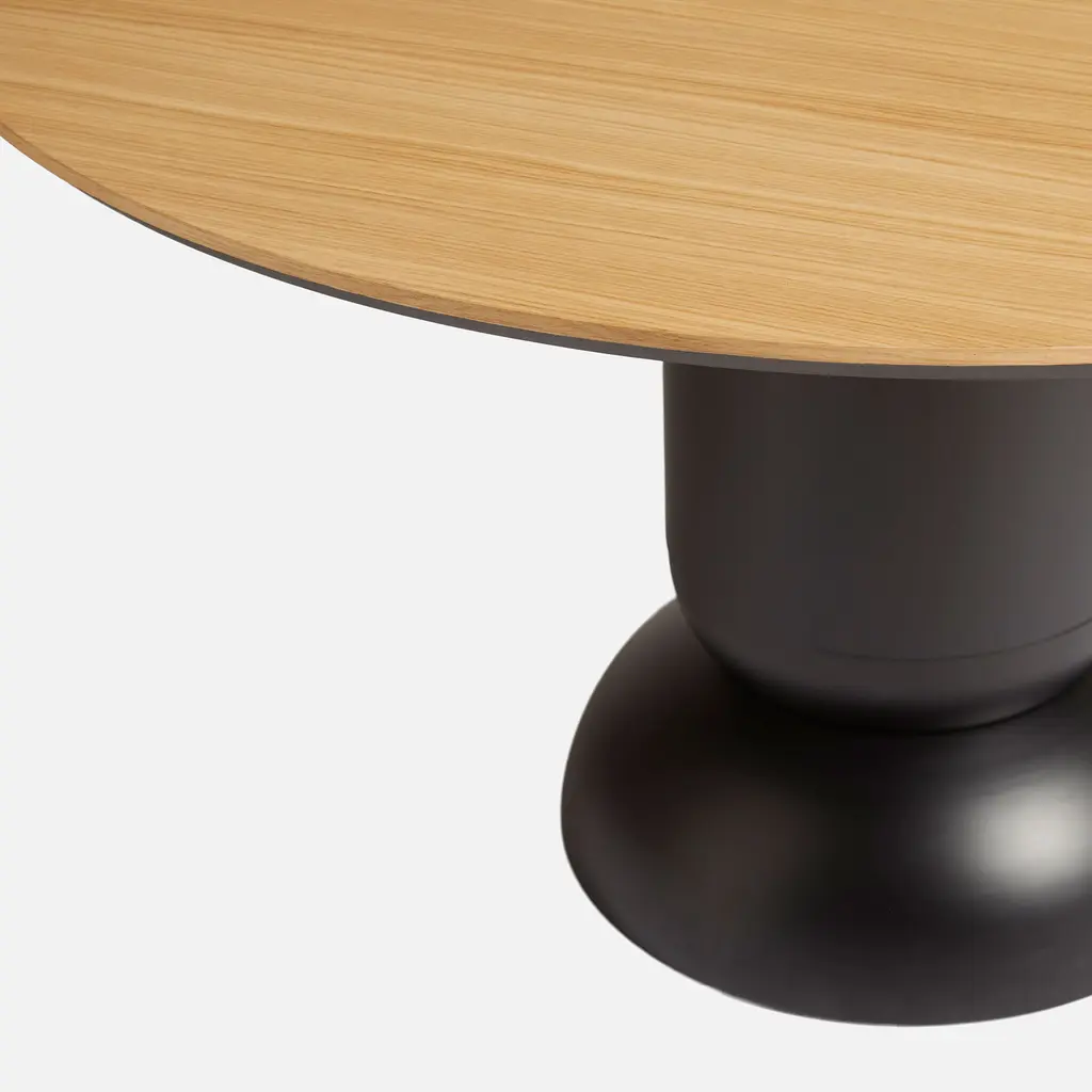 The Ludo dining table is a striking example of design purity and balanced form. It is inspired by the fundamental shapes of geometry, where the table’s rounded top and sculpted base showcase a fluid convergence of opposite forces. The table’s structure is intelligently designed to provide generous legroom, offering a spacious setting for guests. With its smooth wooden surface and sturdy central base, Ludo is engineered for comfort and adaptability. It’s a gathering place that naturally accommodates additional company, a testament to thoughtful design that enhances communal experiences. Ludo’s presence in any dining space is both a nod to artistry and an embrace of functional elegance, inviting shared moments and fostering a welcoming atmosphere for memorable occasions.